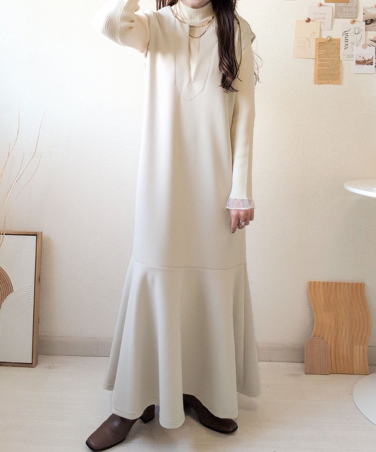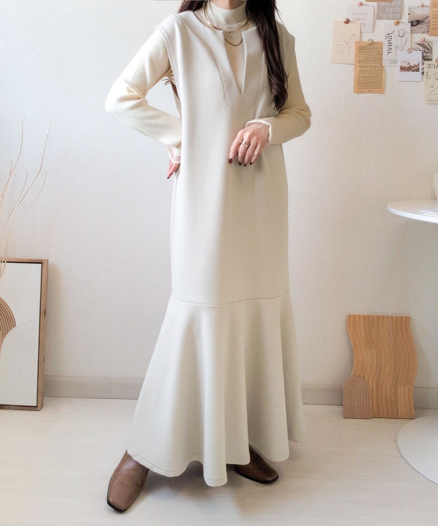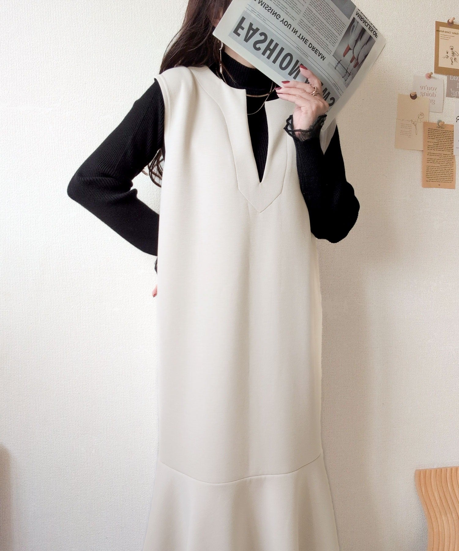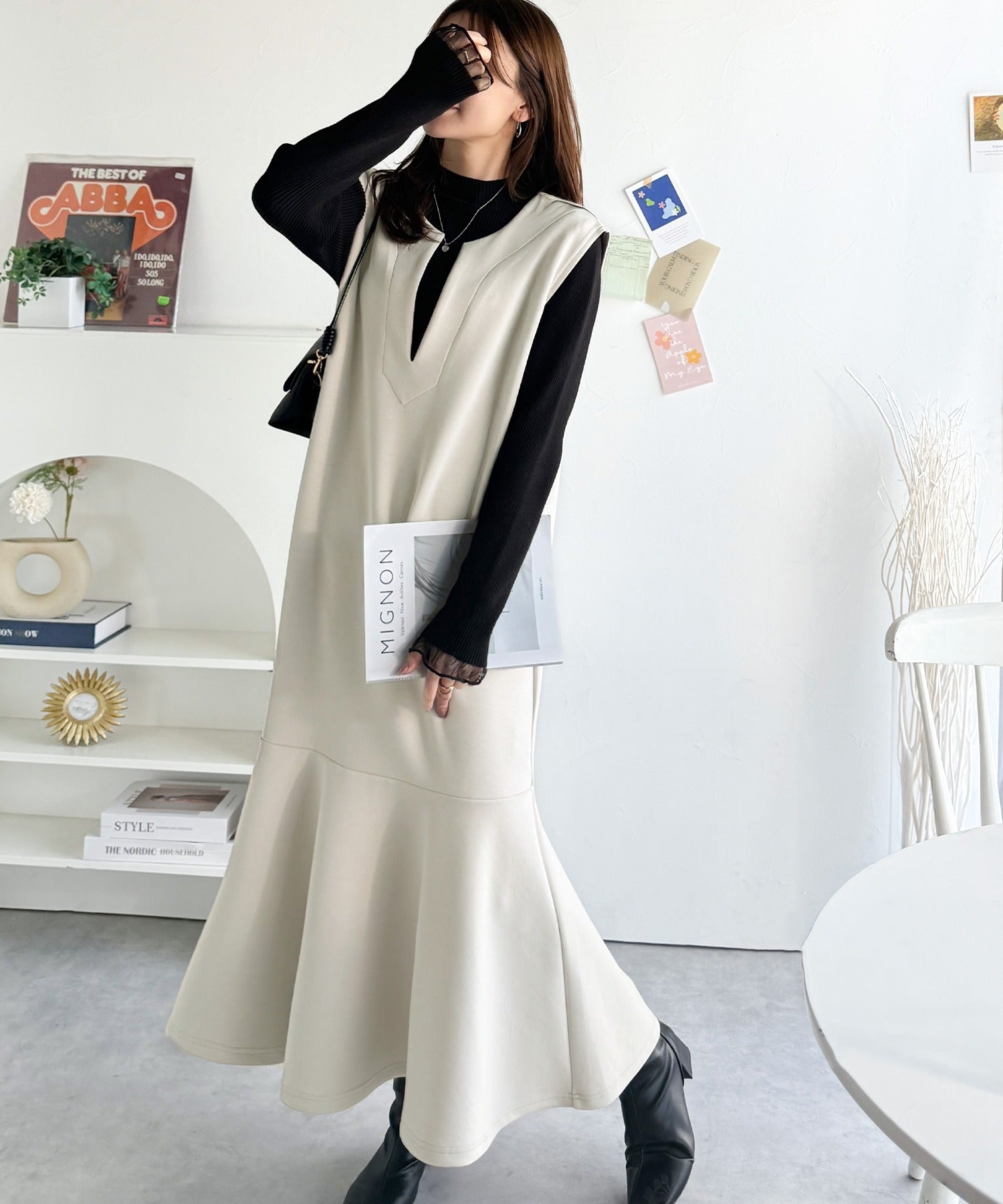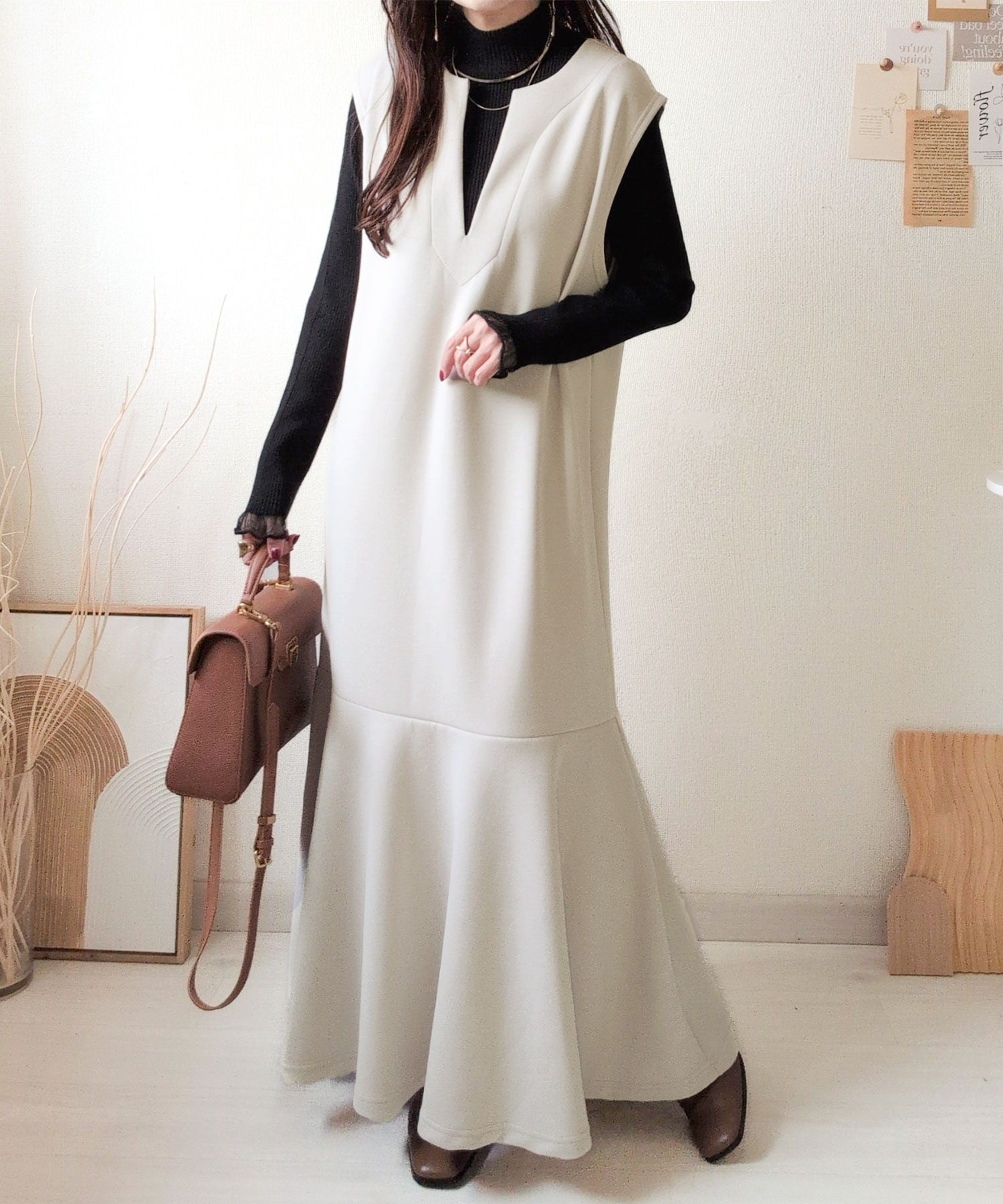 抜け感のある深Vネックと、フェミニンで動きのあるマーメイド切替がポイントのワンピース。