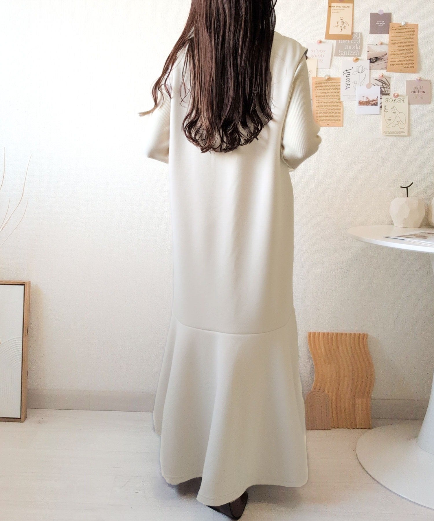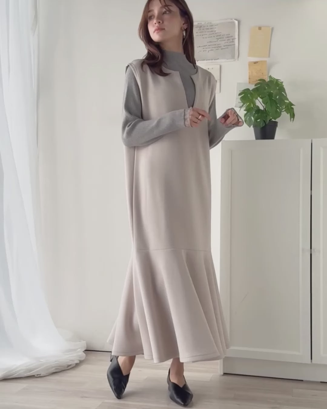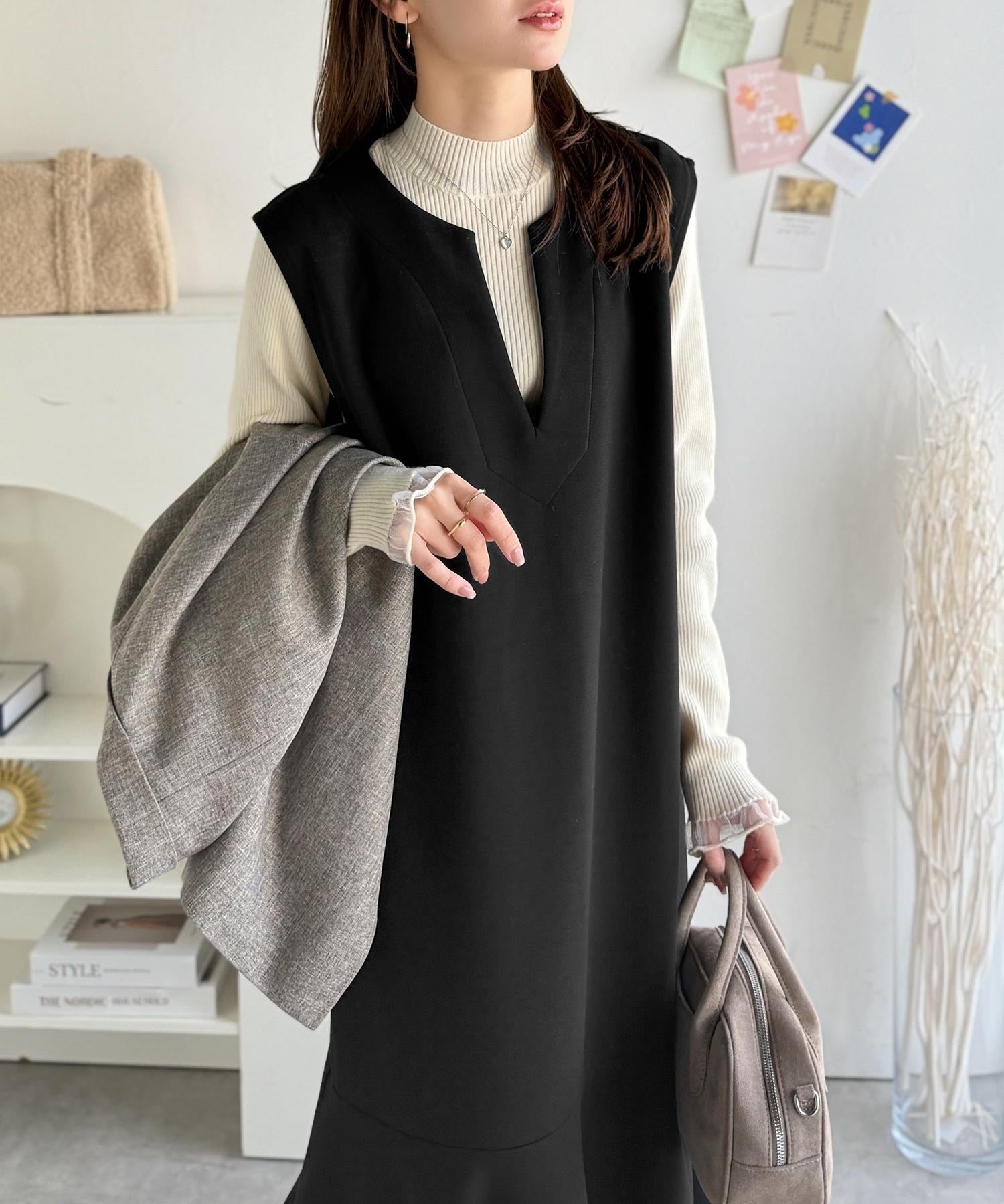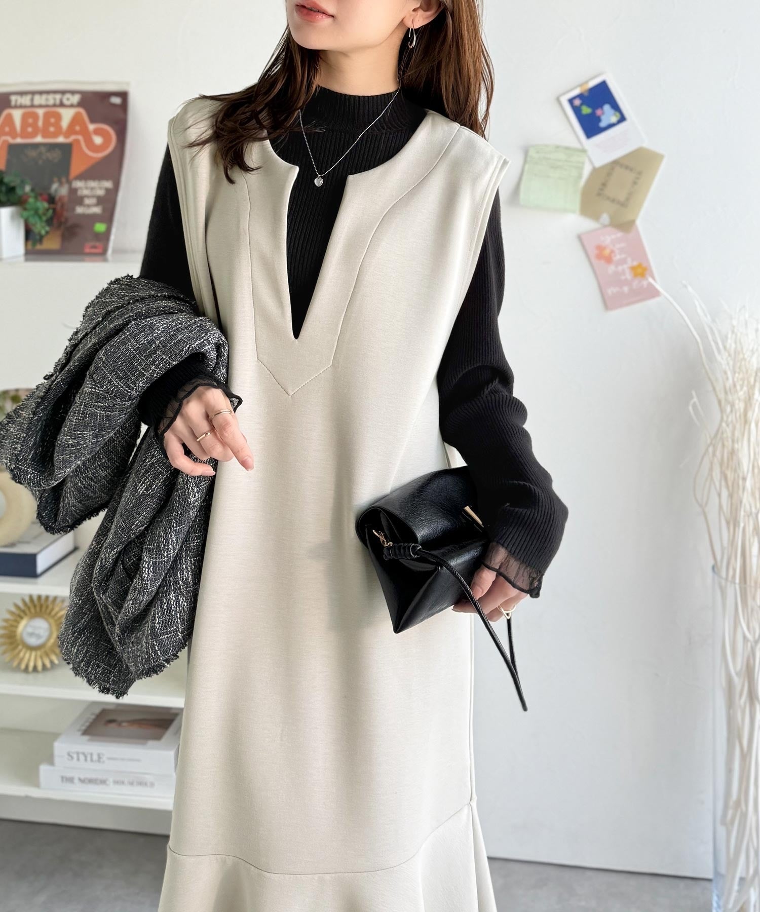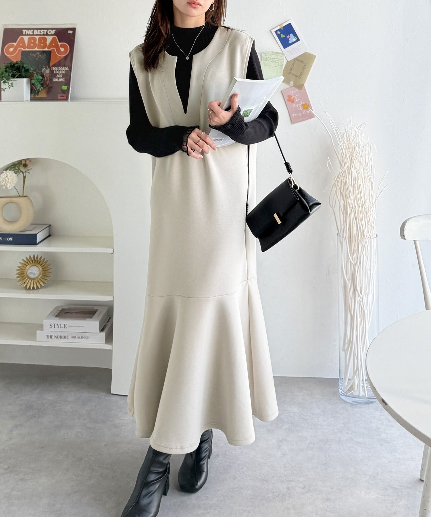 抜け感のある深Vネックと、フェミニンで動きのあるマーメイド切替がポイントのワンピース。