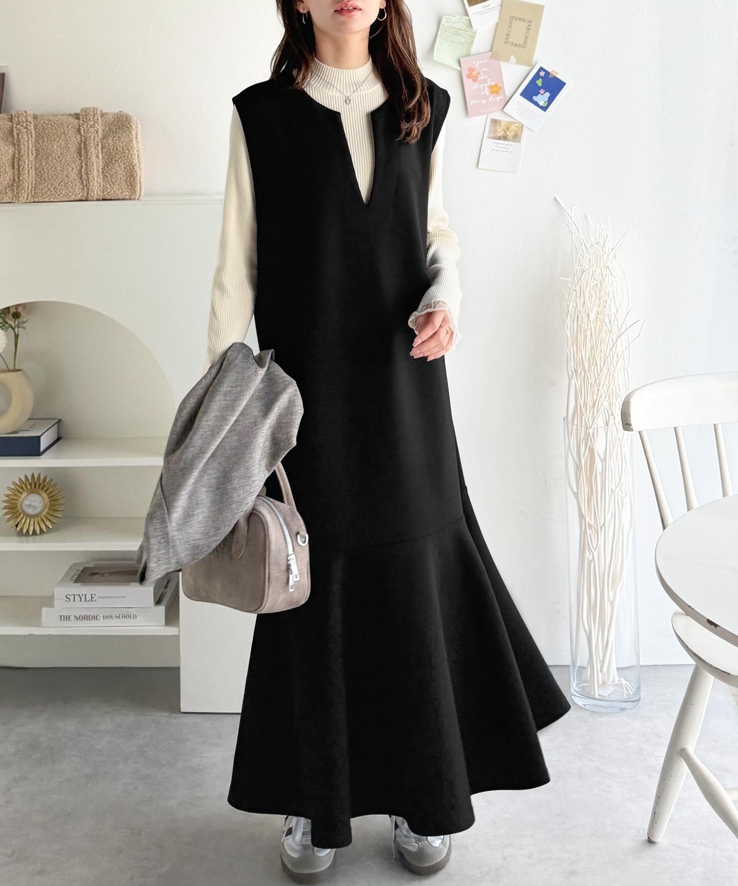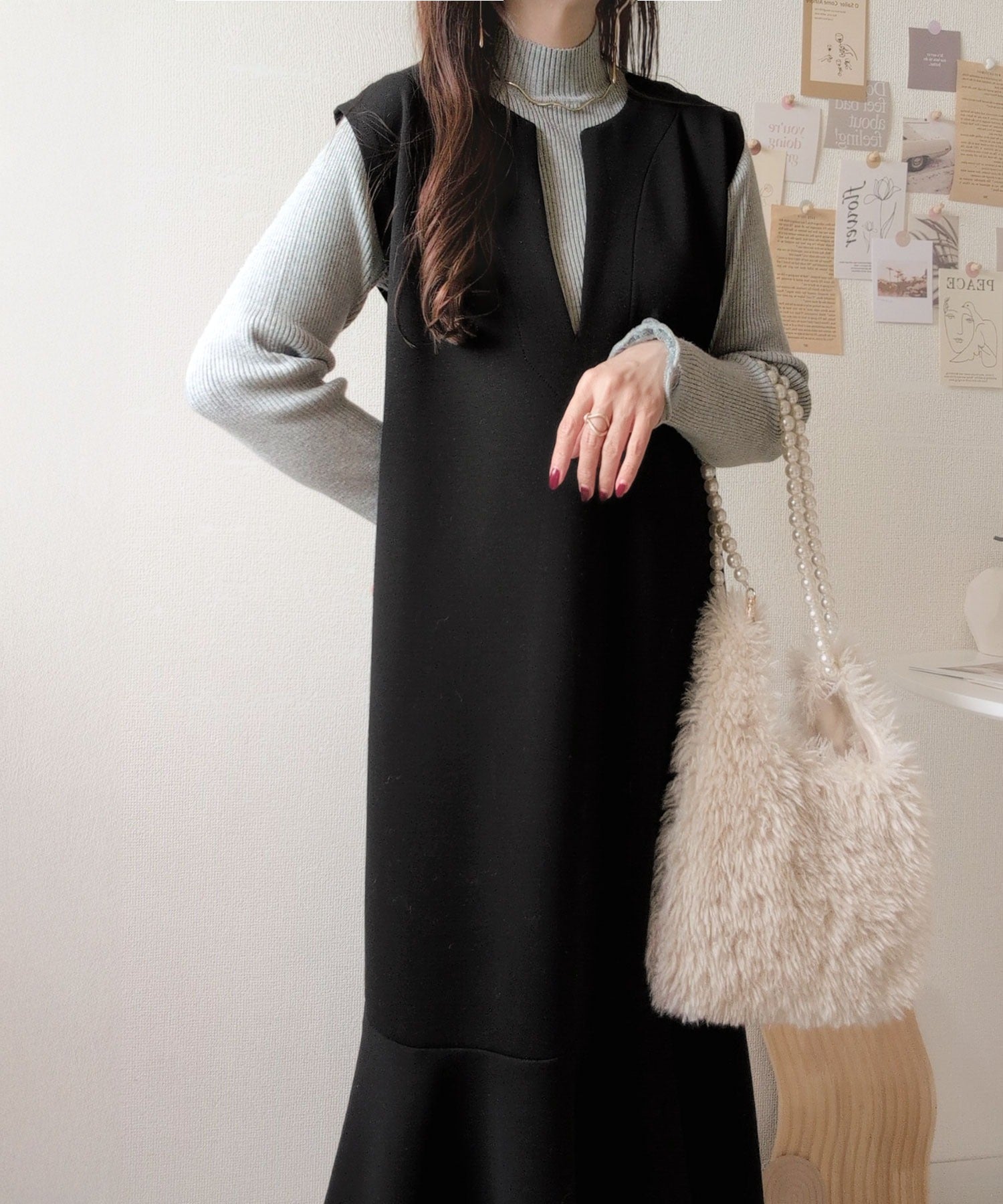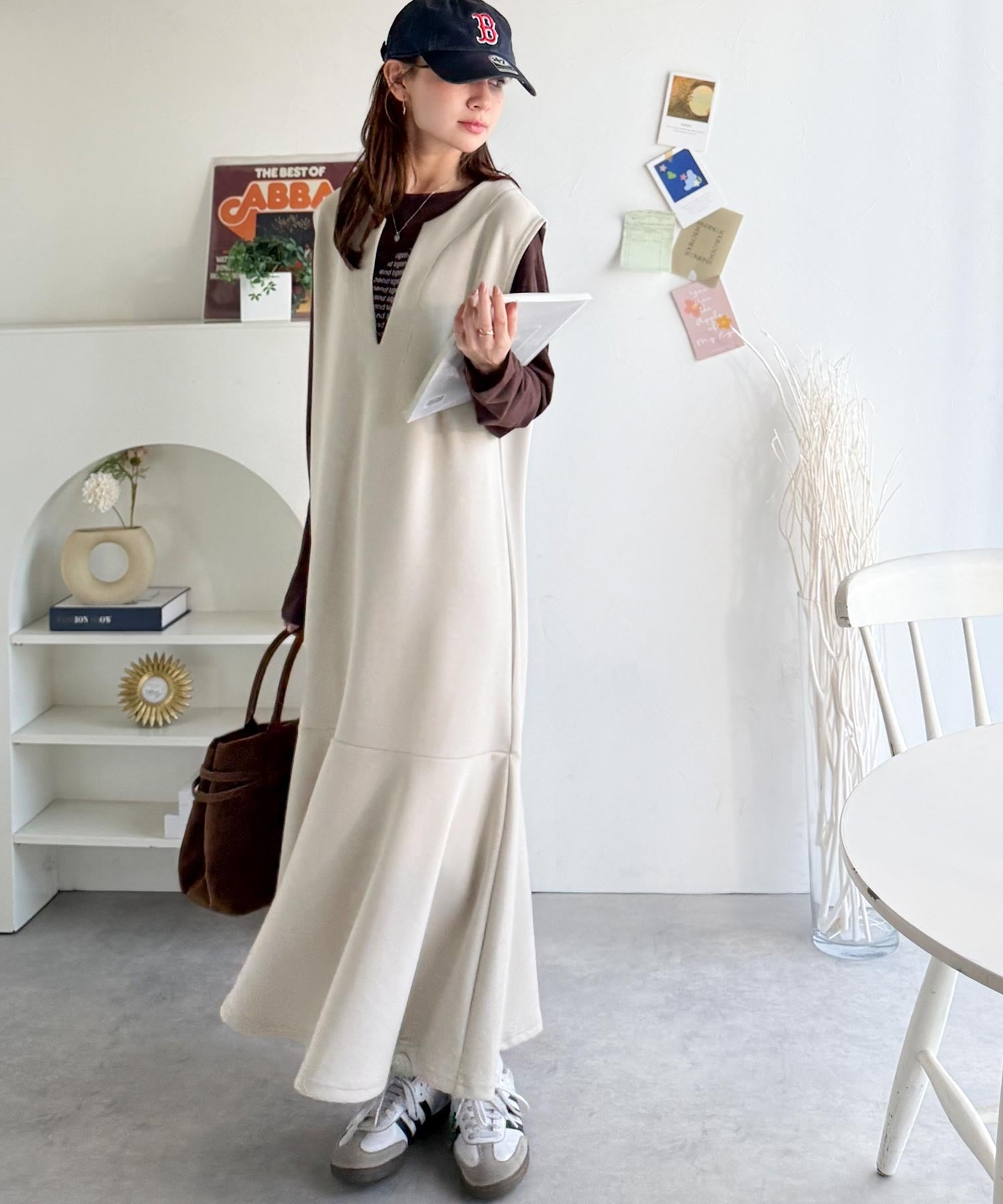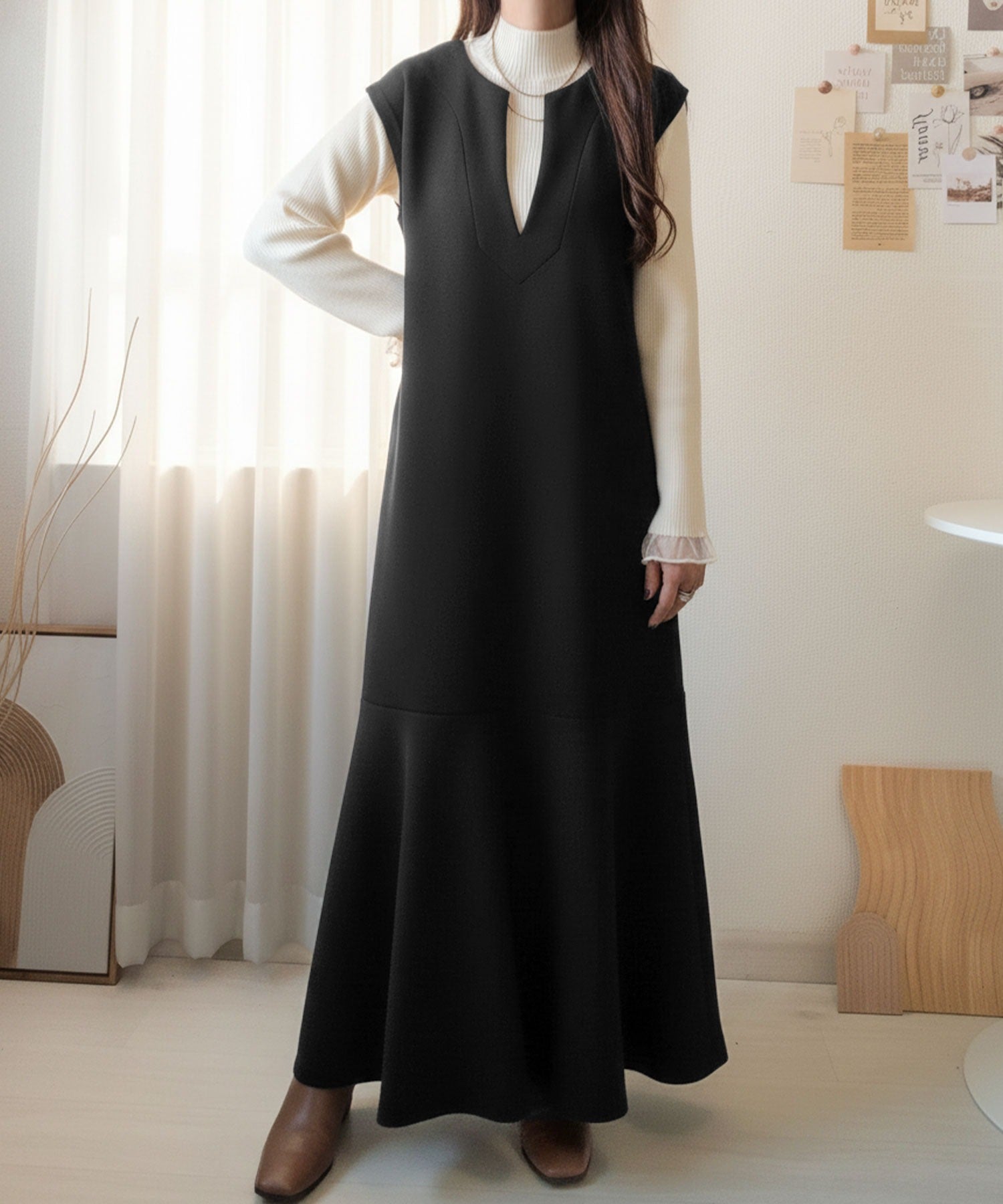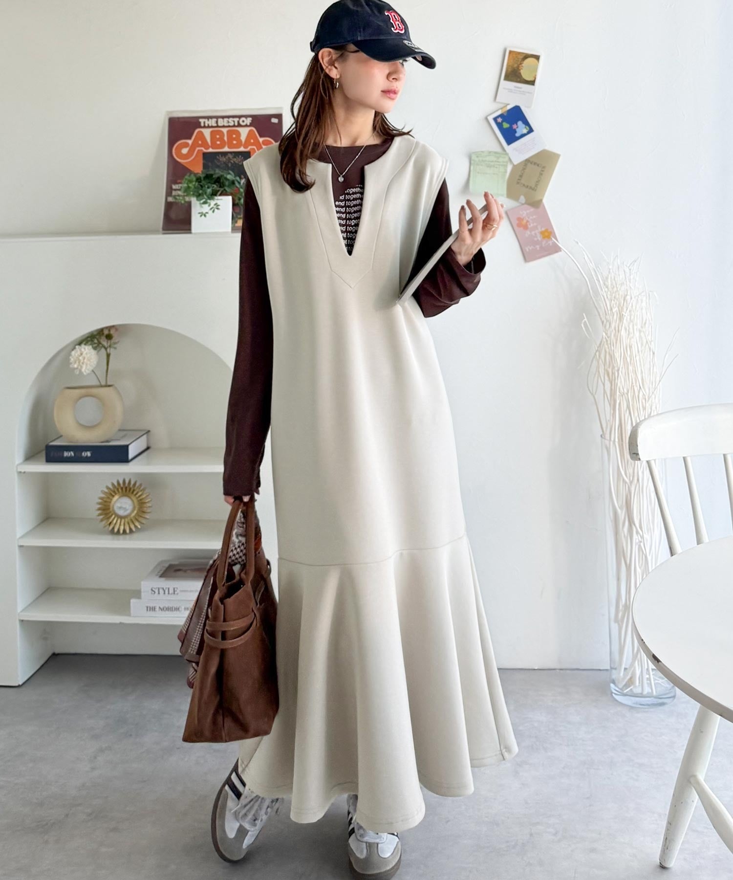 抜け感のある深Vネックと、フェミニンで動きのあるマーメイド切替がポイントのワンピース。
