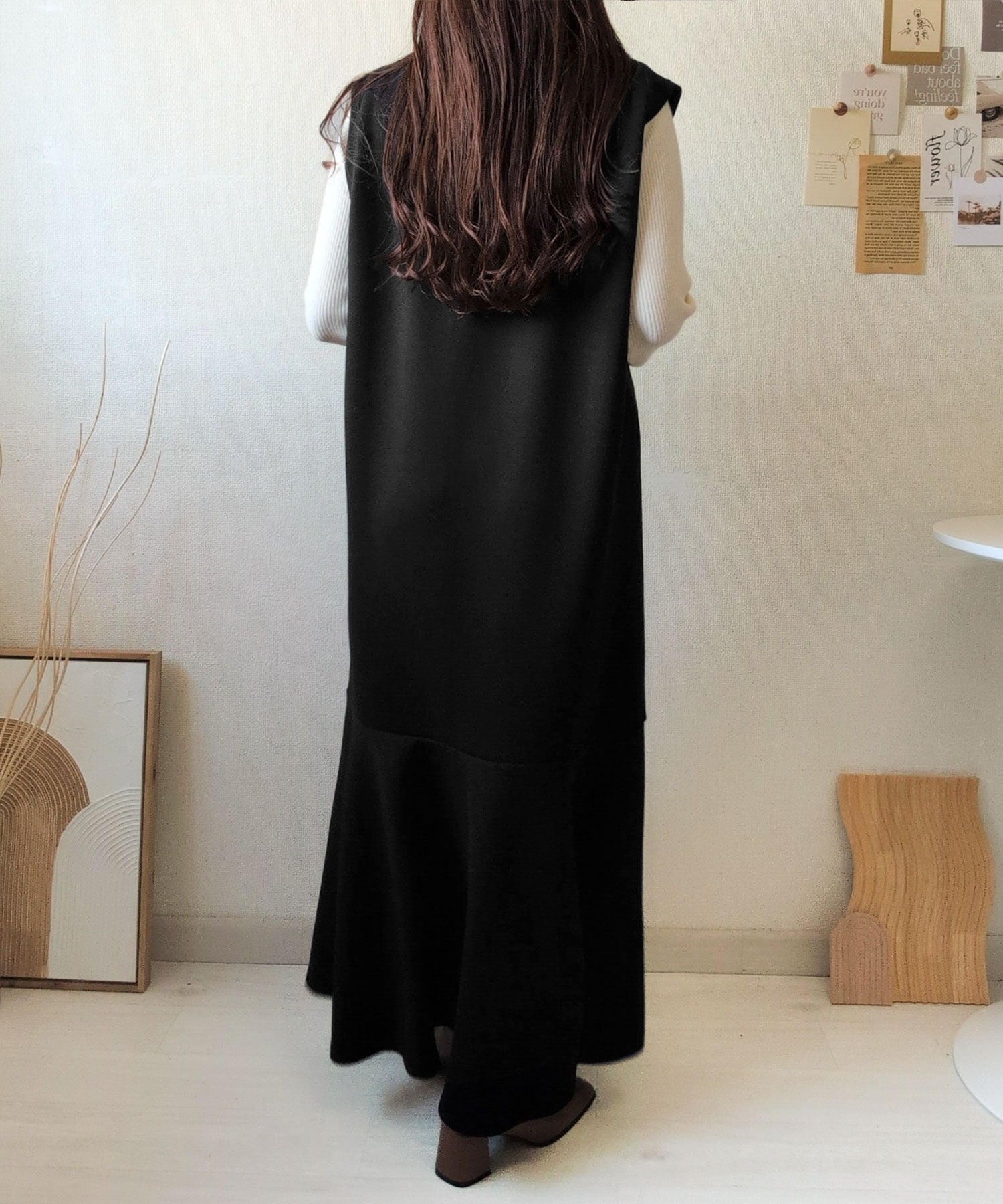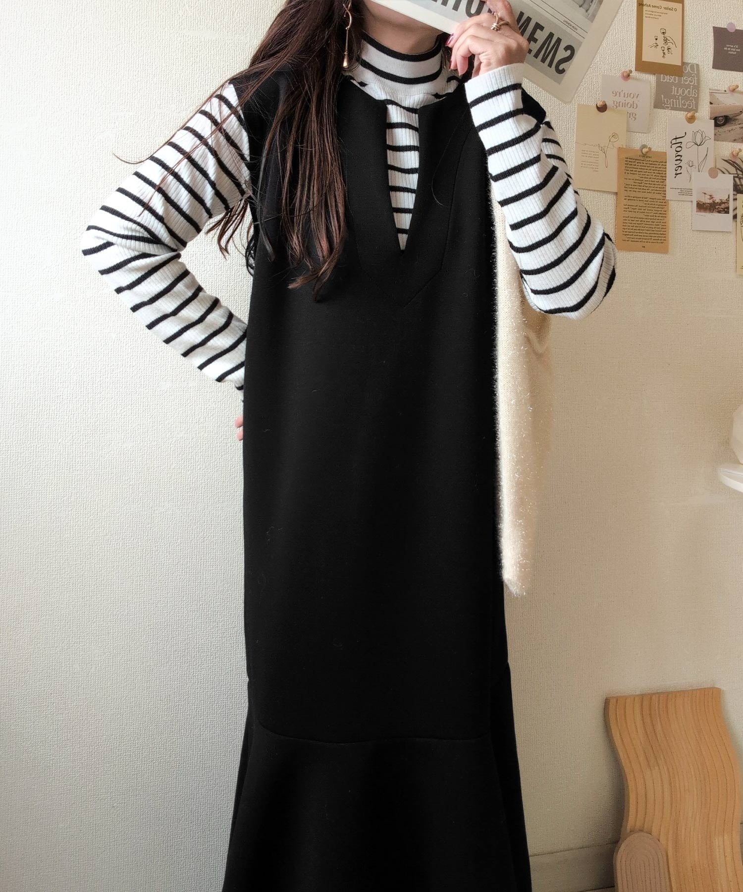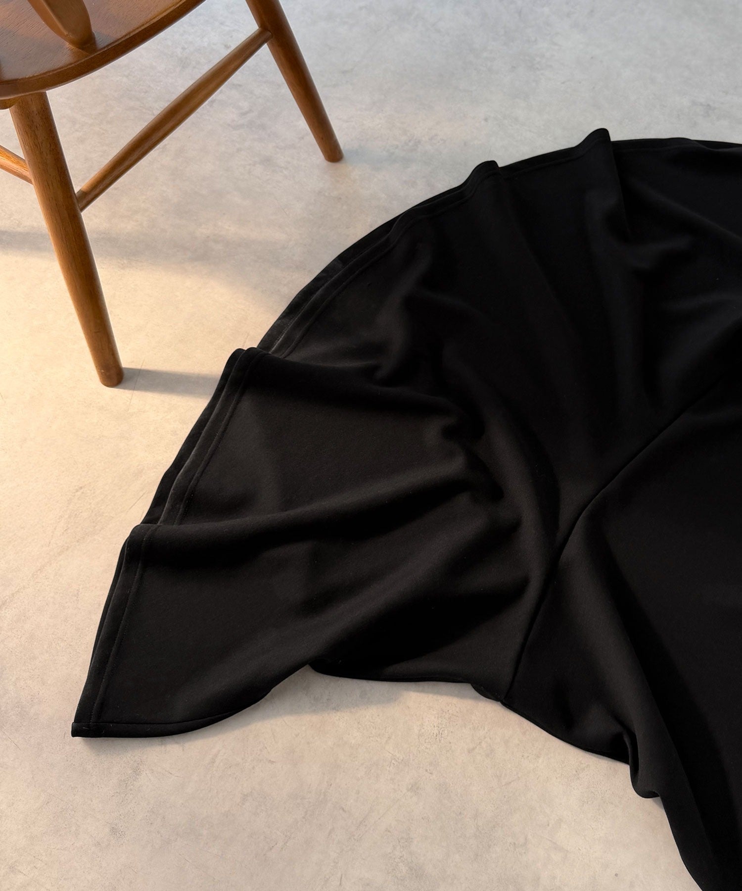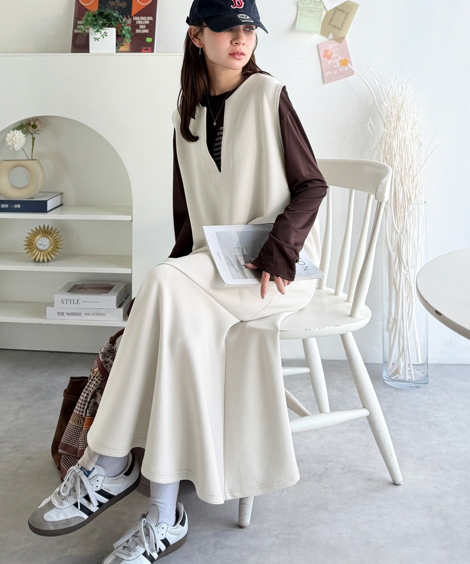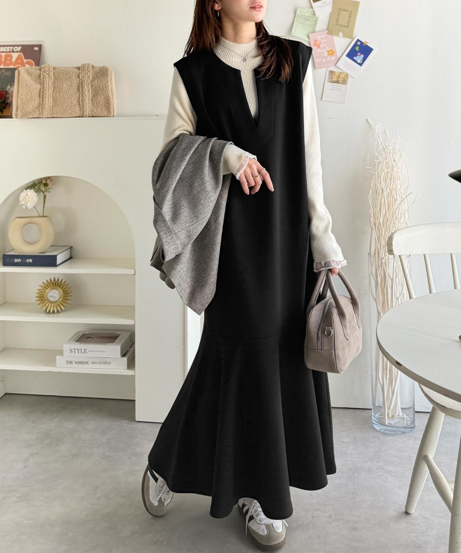 抜け感のある深Vネックと、フェミニンで動きのあるマーメイド切替がポイントのワンピース。