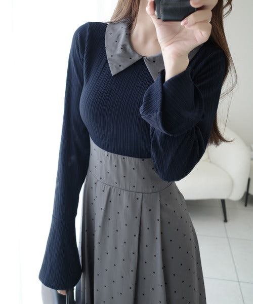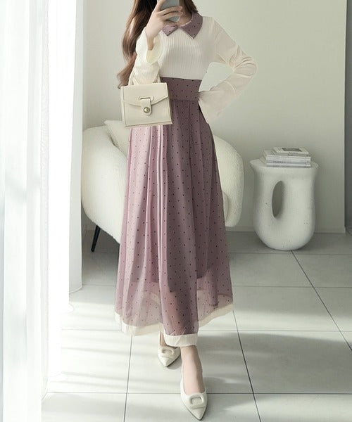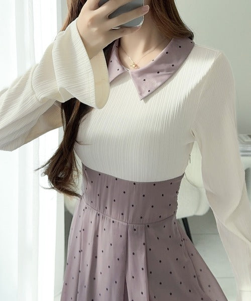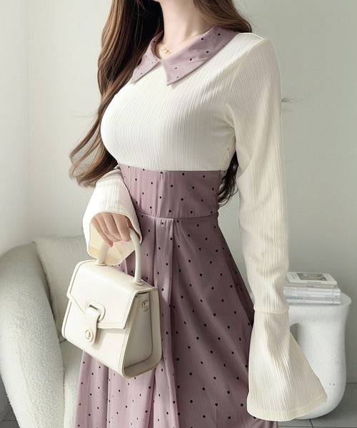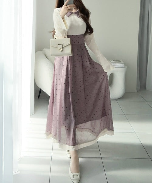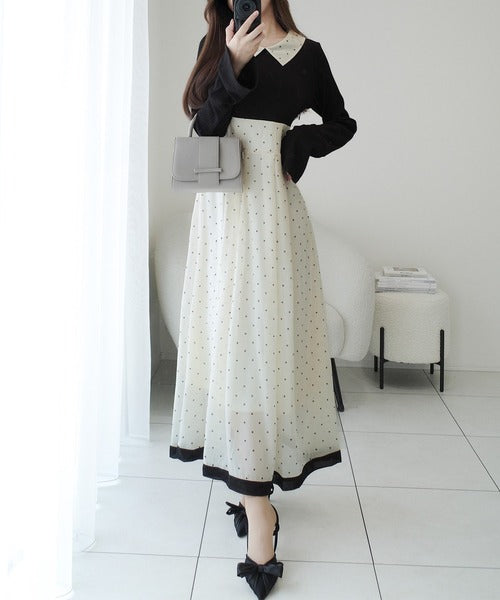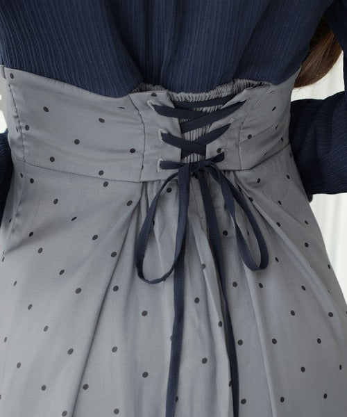 小さなドット柄がトレンド感を演出し、裾の無地切り替えが清楚な印象を与えます♪