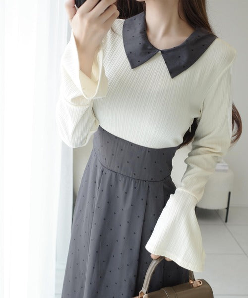 ドット柄とフレア袖で可愛さと上品さを両立♪