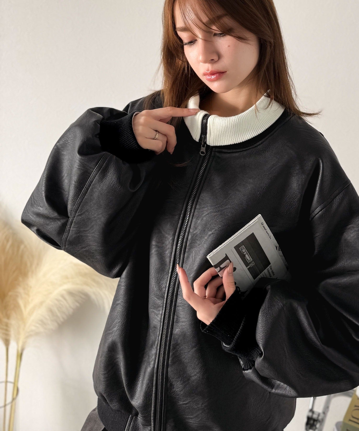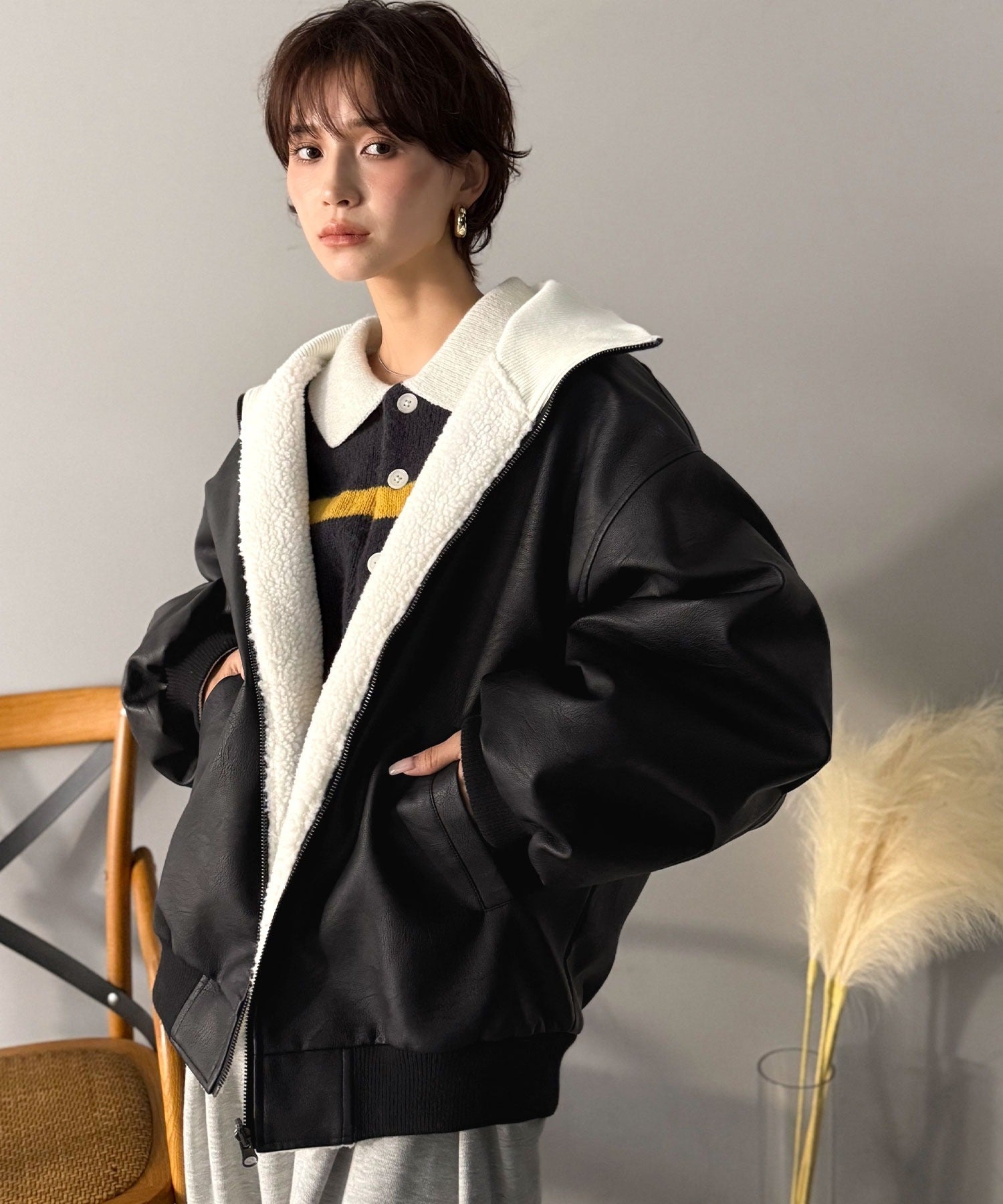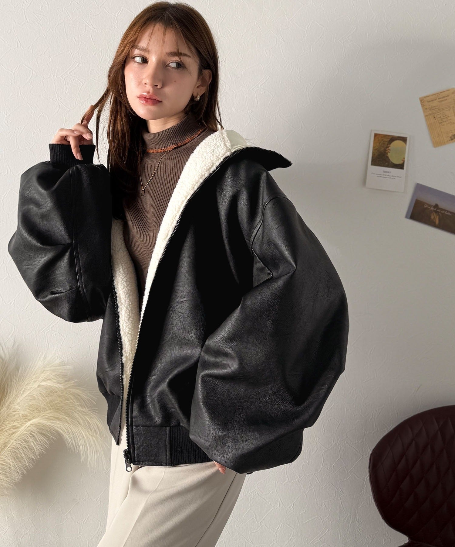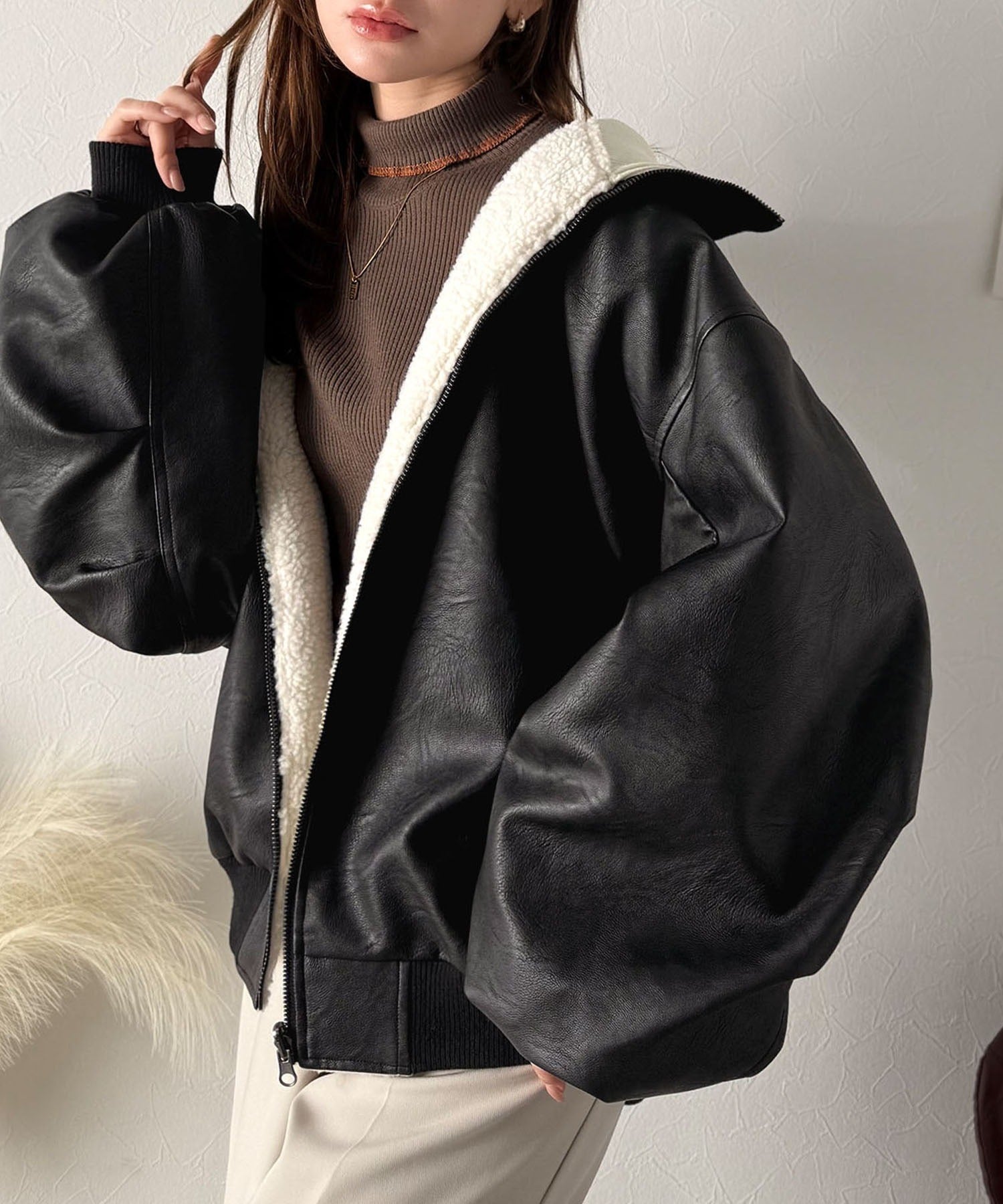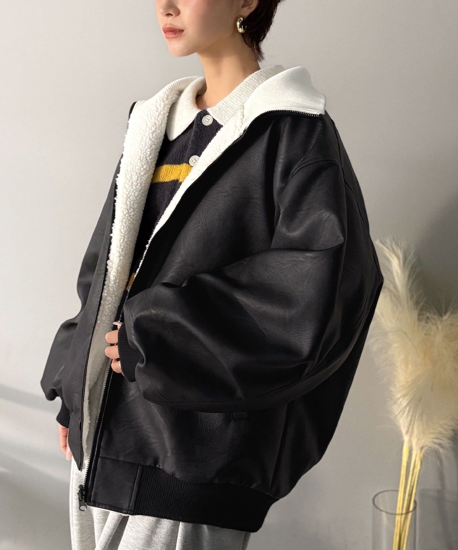 スタイリッシュなフェイクレザー×ボアブルゾン。