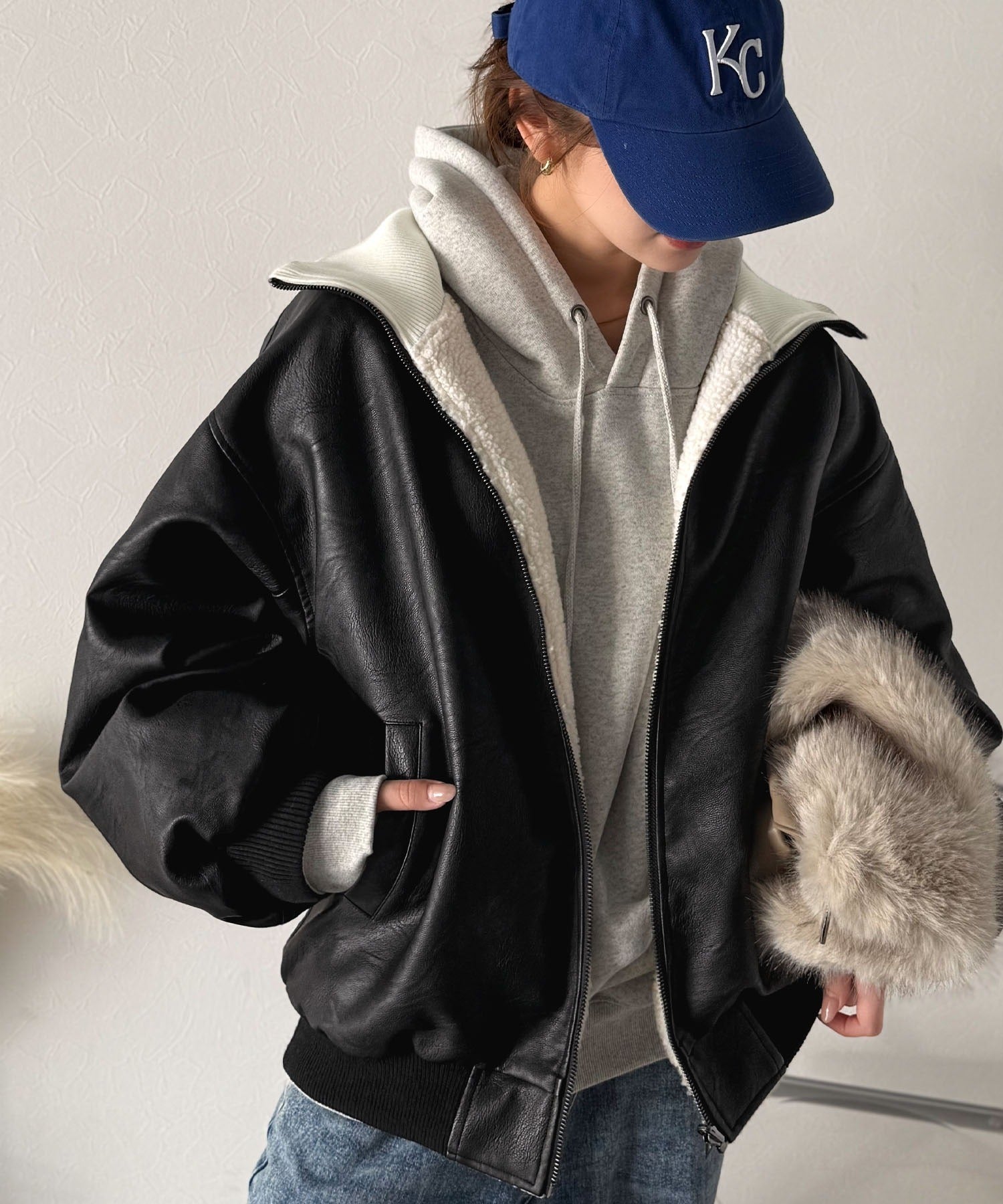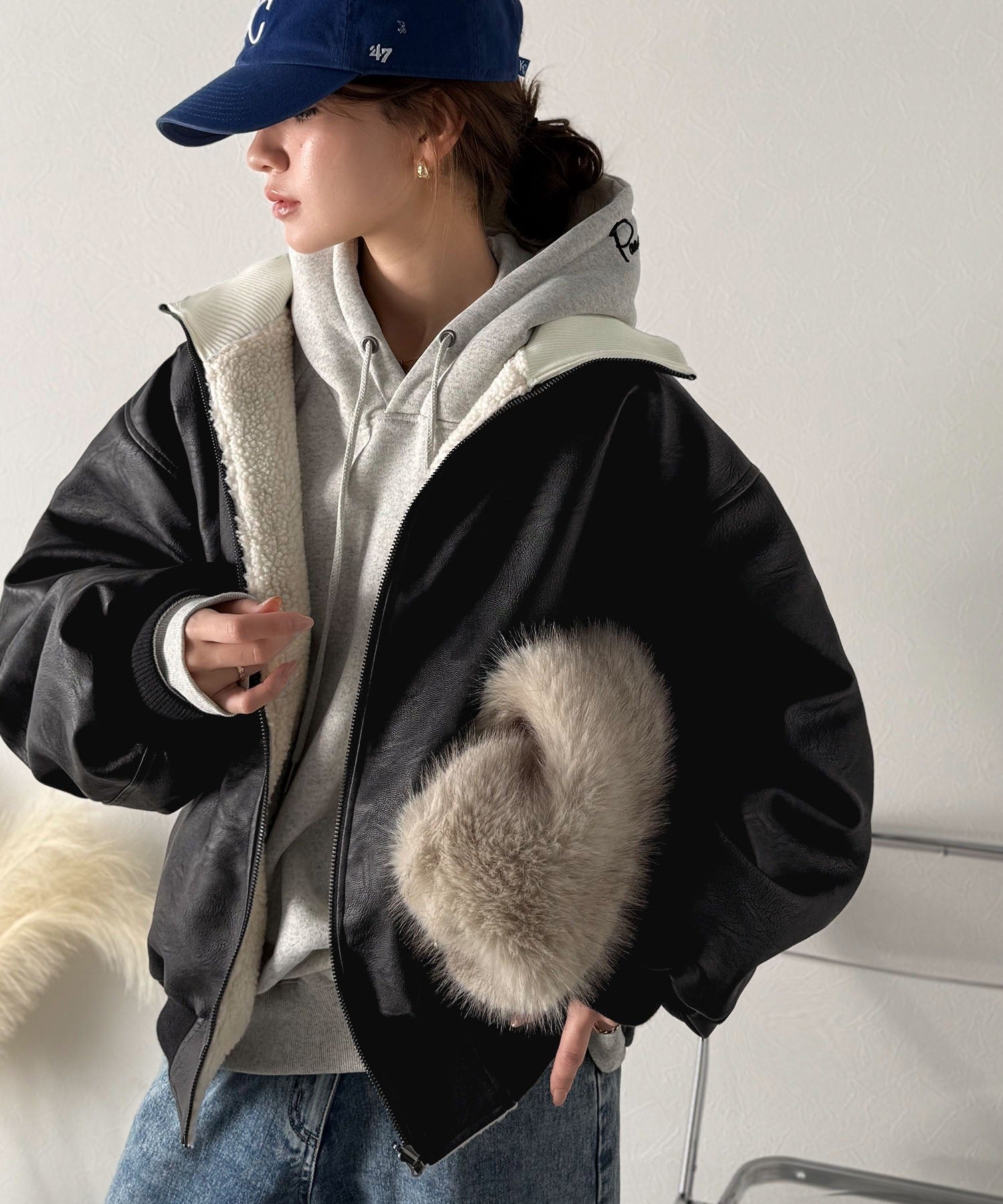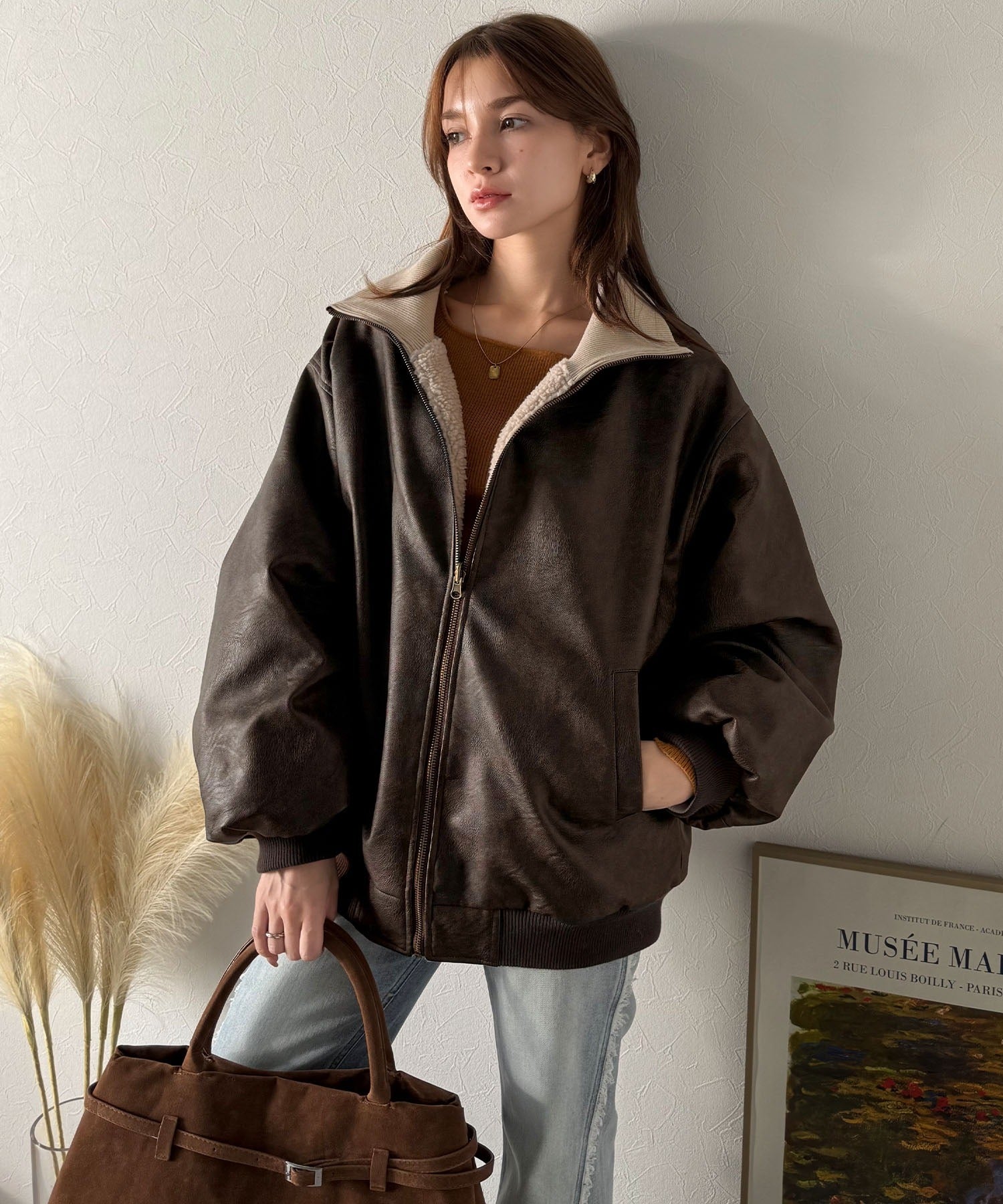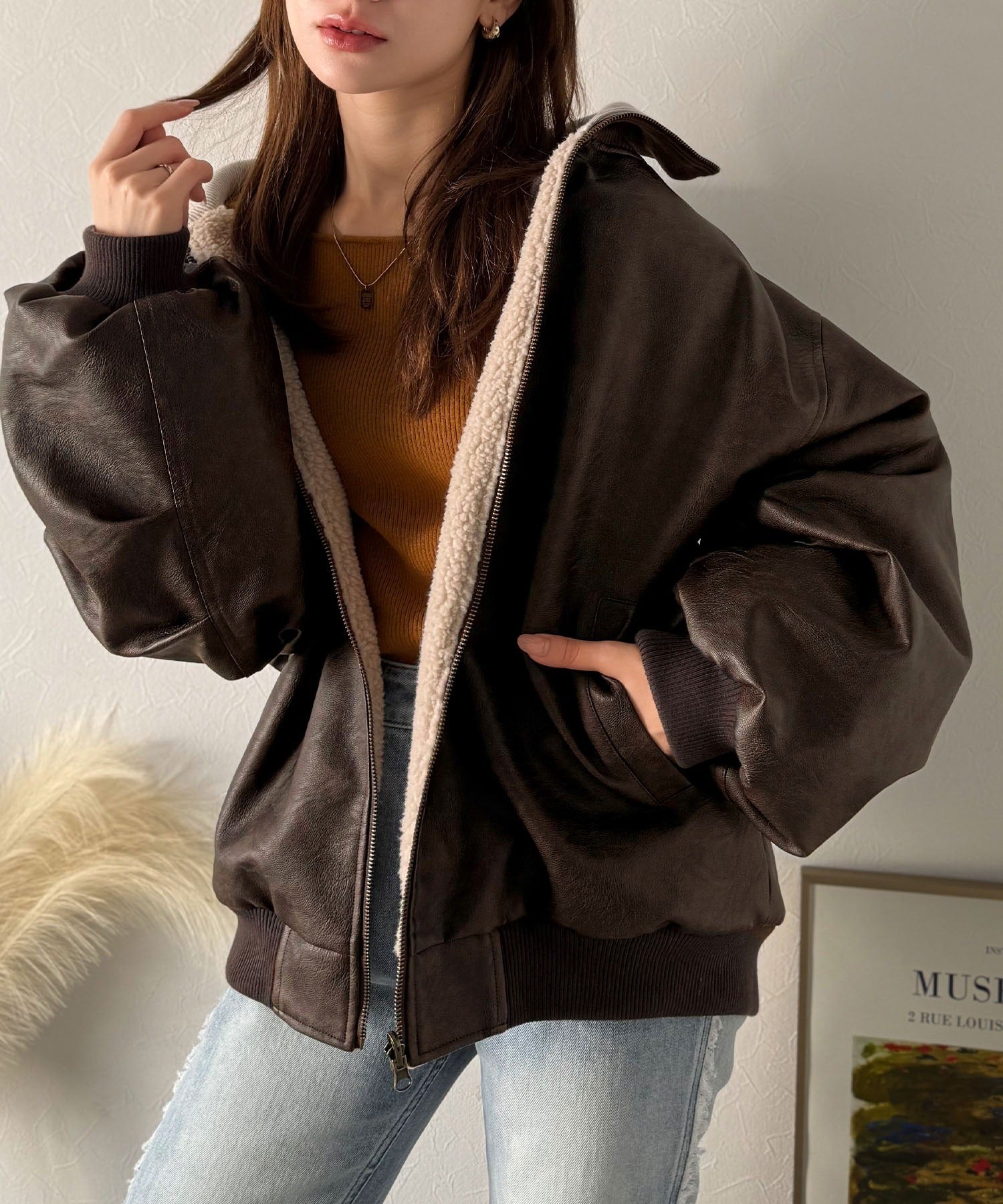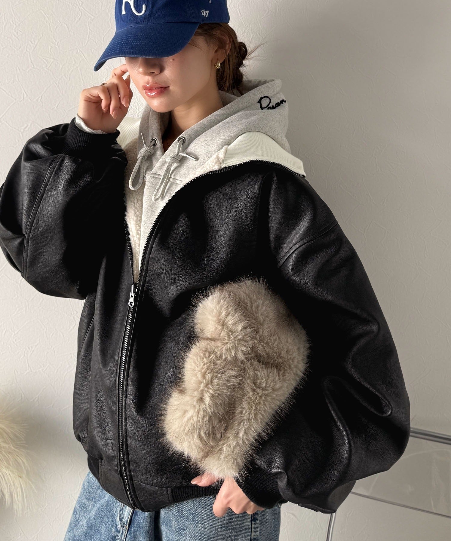 スタイリッシュなフェイクレザー×ボアブルゾン。