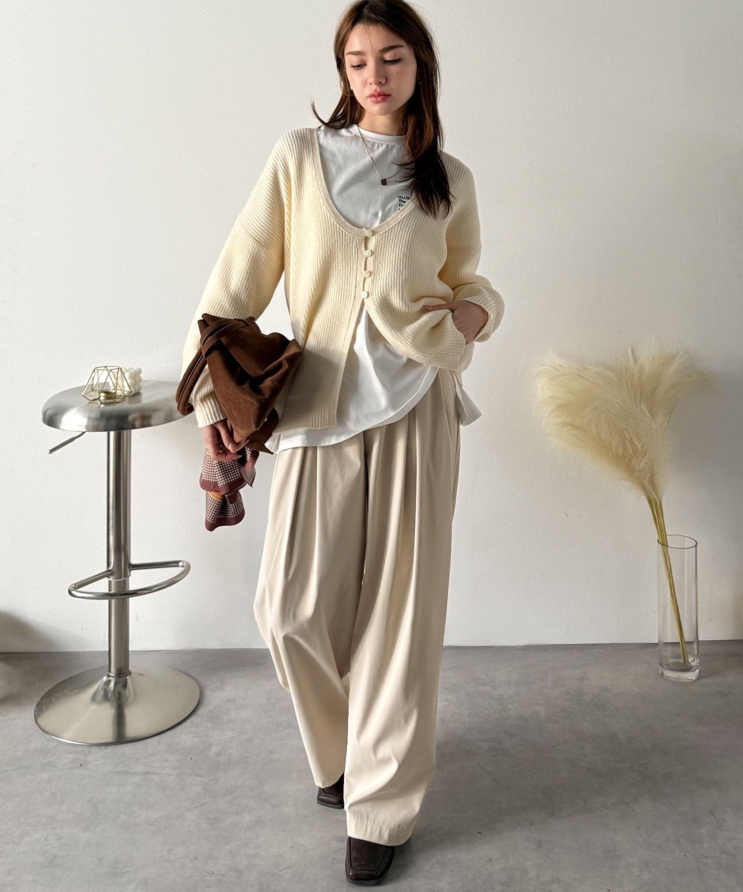 カラーはベーシックなブラック・オフホワイト・グレージュの展開で、どんなボトムとも相性抜群。
