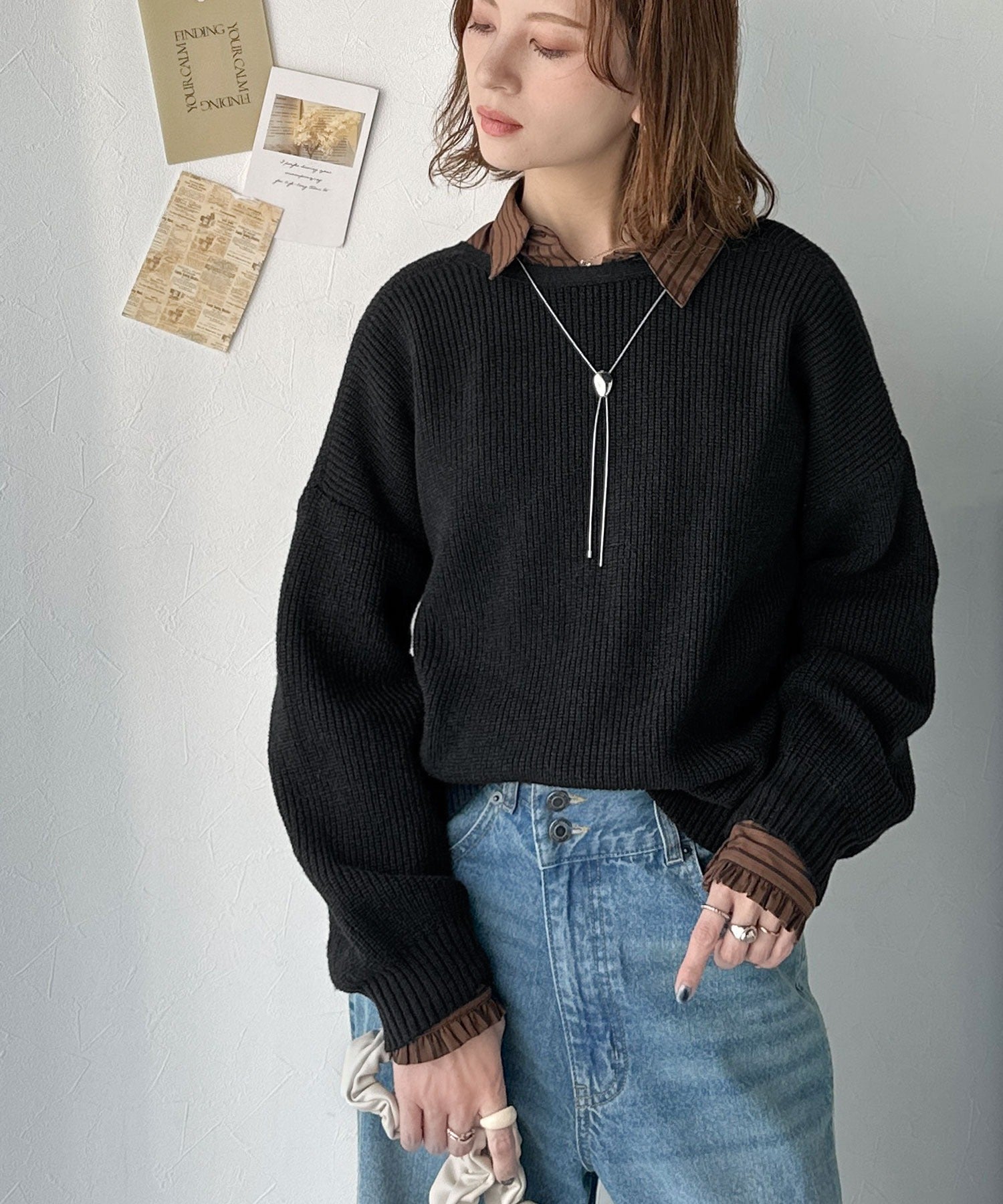 深めのUネックが顔まわりをすっきり見せ、レイヤードスタイルにも最適です♪