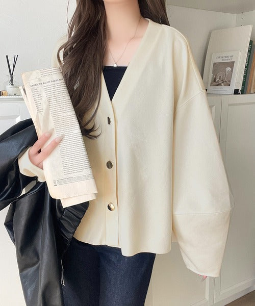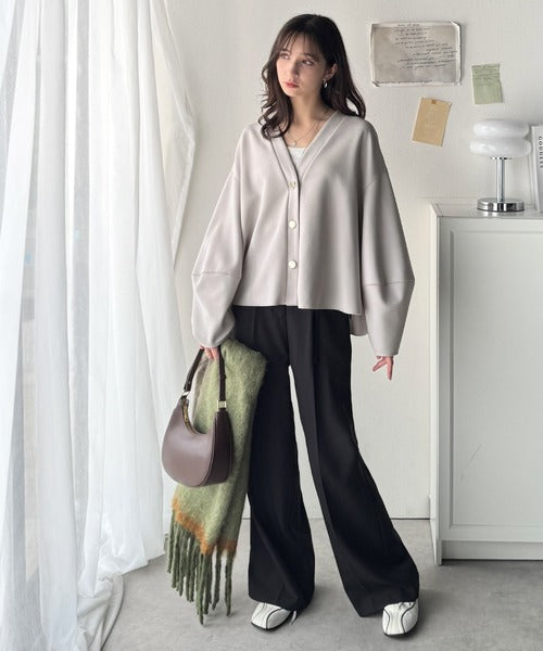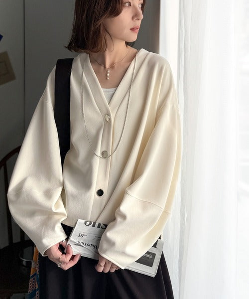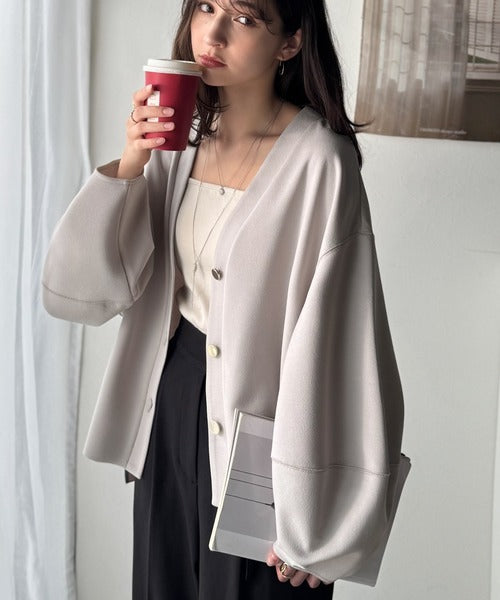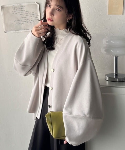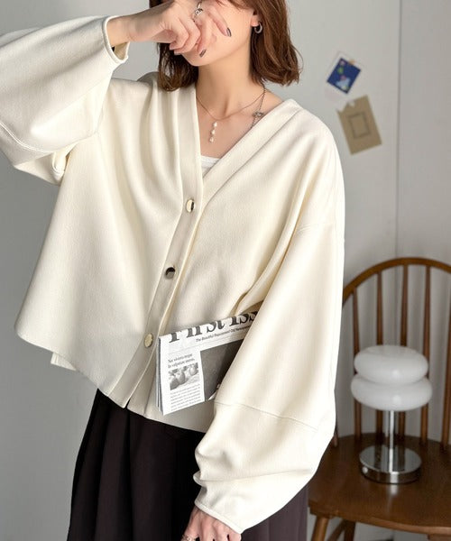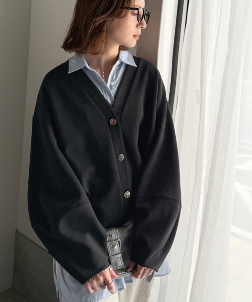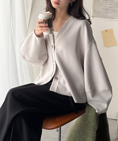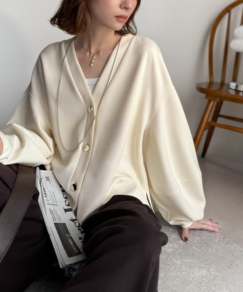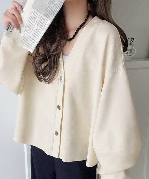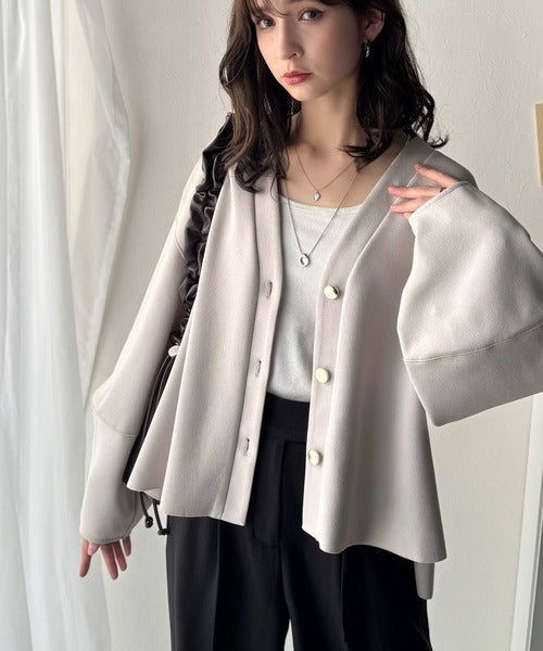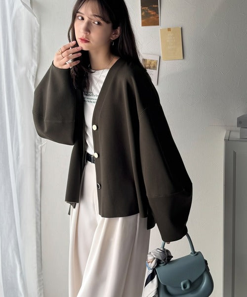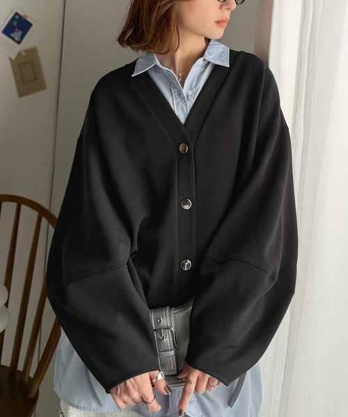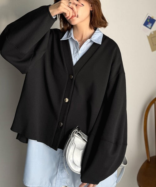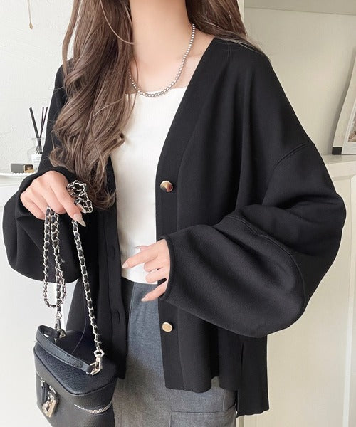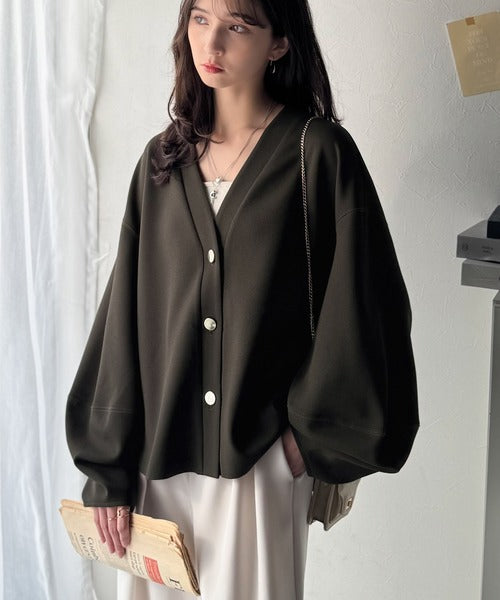 今季のトレンド、ランタンスリーブが特徴のVネックカーディガン。
