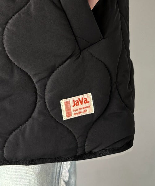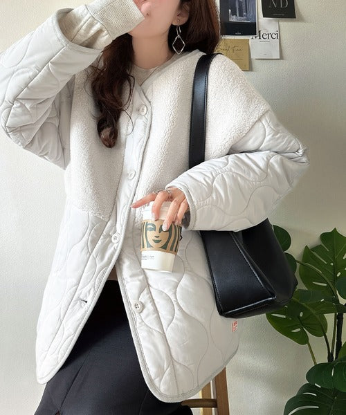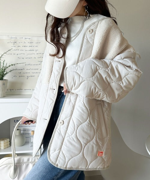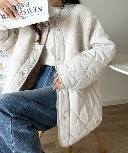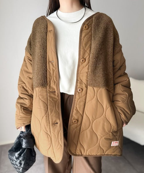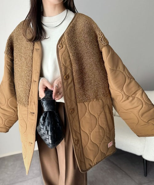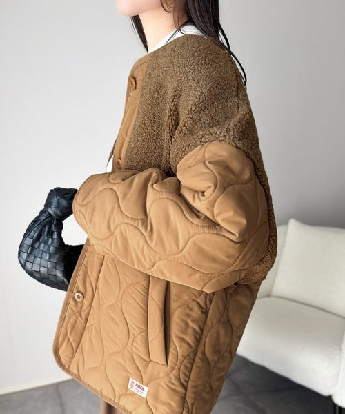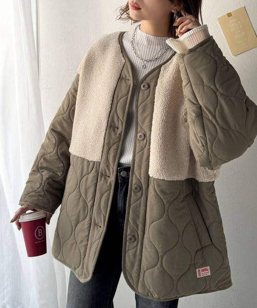 《JaVaジャバコラボ》軽くて暖かい、旬顔ボア切替♪ノーカラーひょうたんキルティングコート jv1240103