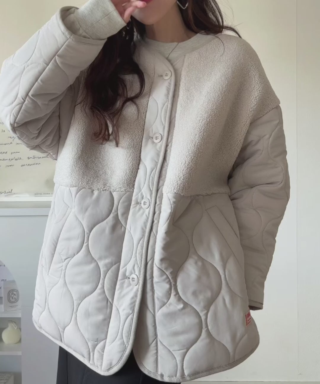 ボリューム感のあるテディベアボアとトレンドライクなキルティングの切替で、