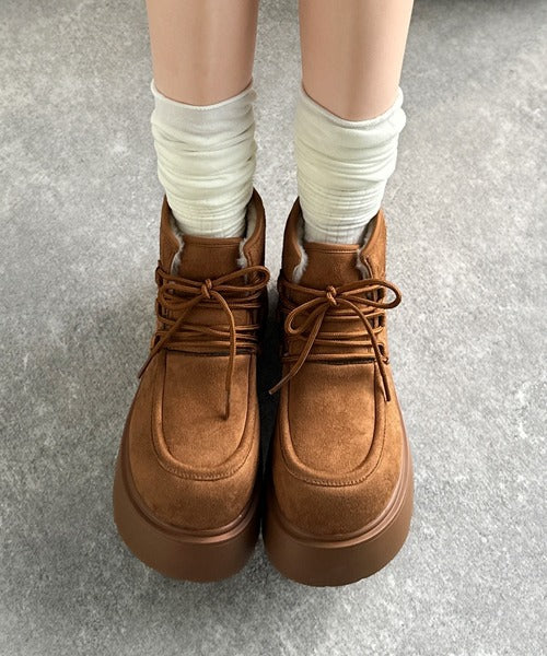 ヌバック調のフェイクレザーを使用したムートンブーツ。
