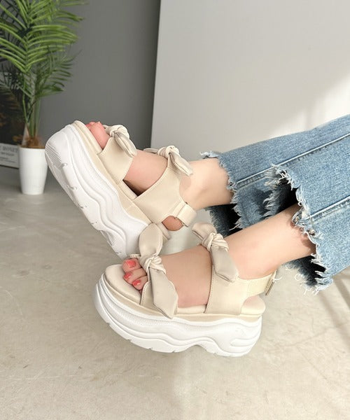 リボンデザインが目を惹くこちらの厚底サンダルは