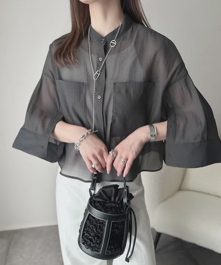 ワイドスリーブがこなれ感を演出する、冷房対策にも抜群のシアーシャツ。