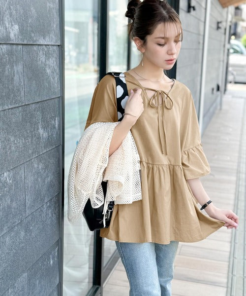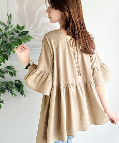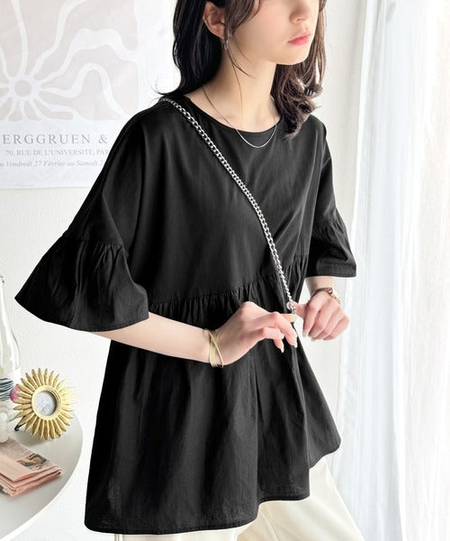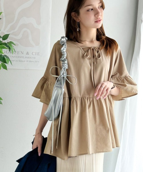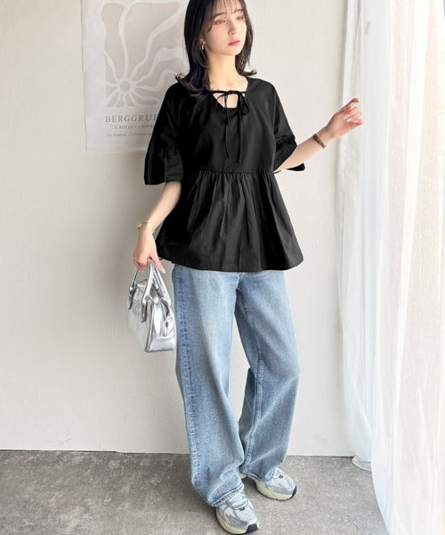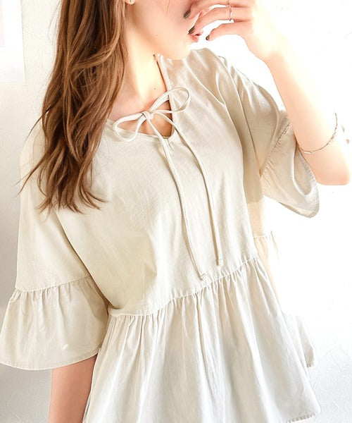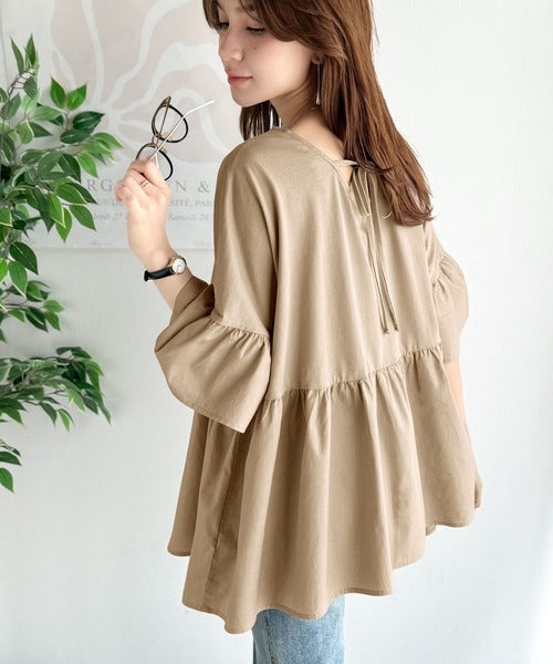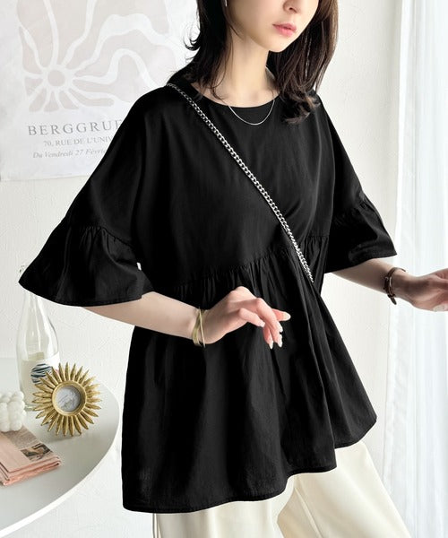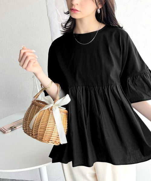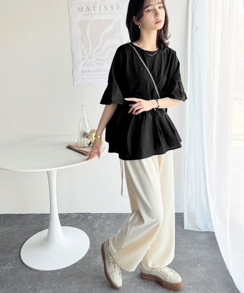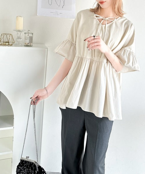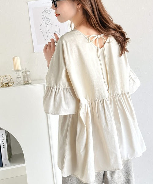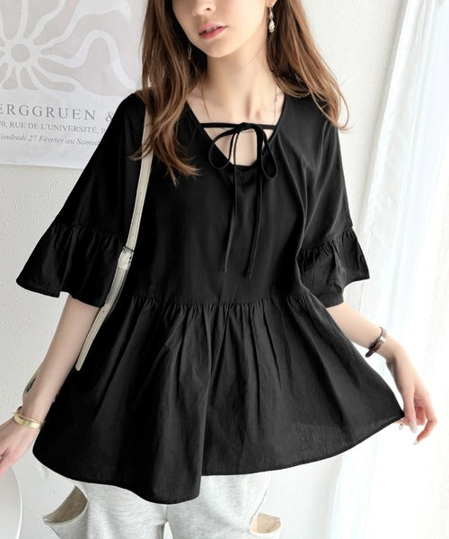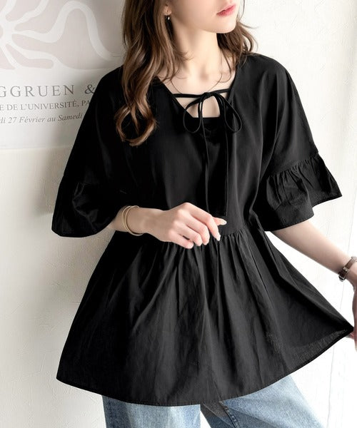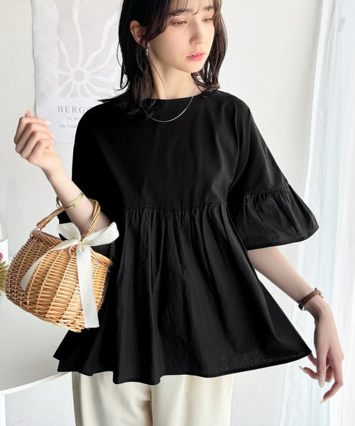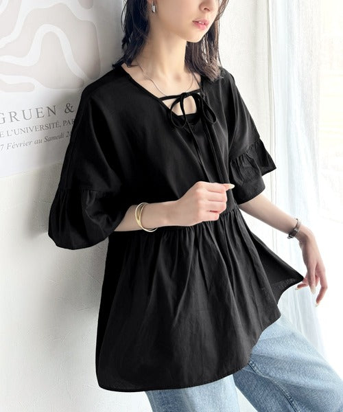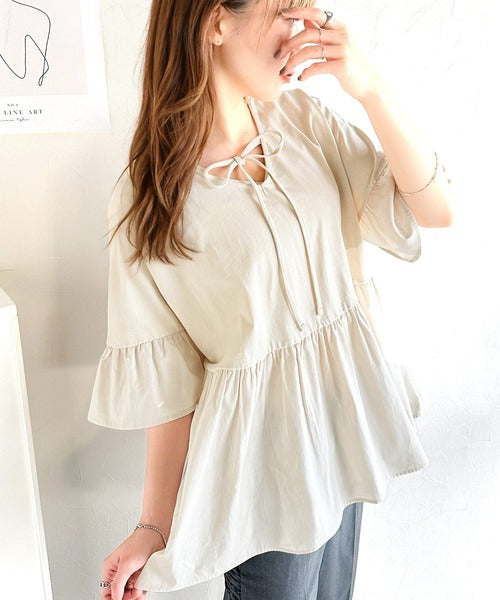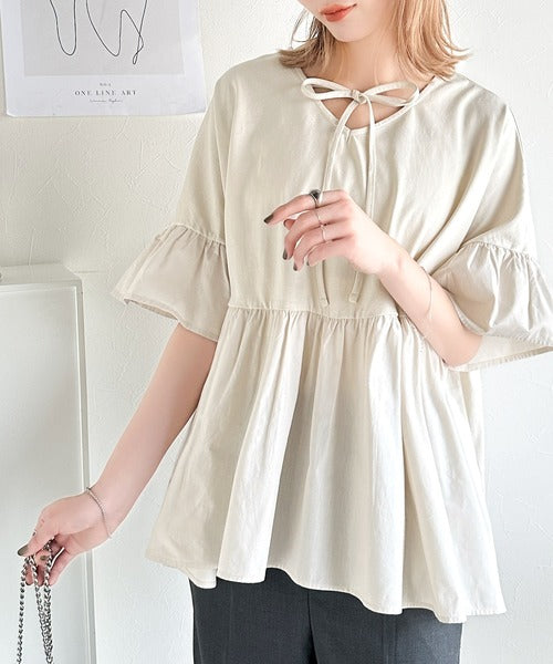 Tシャツより上品に、ブラウスより気軽に。綿100%前後2WAYシルケット加工布帛コンビリボンペプラムトップス(半袖) ce1260383