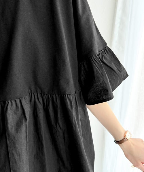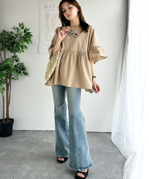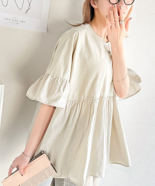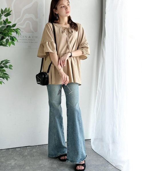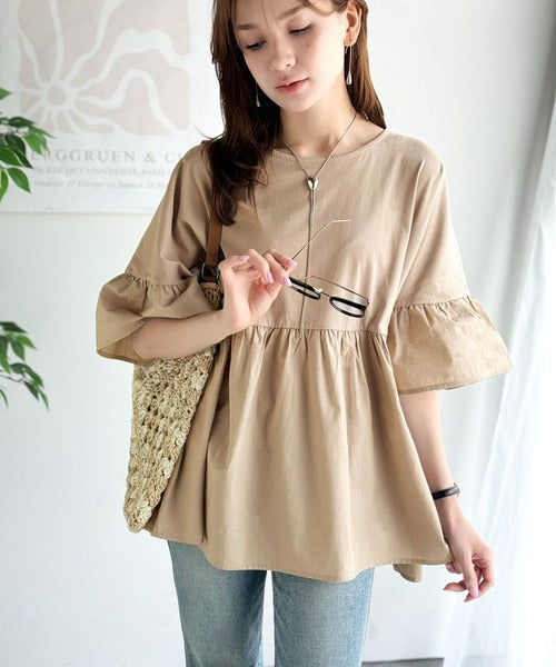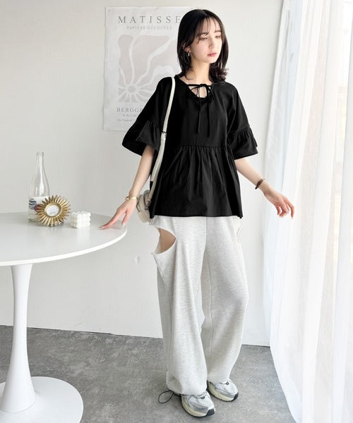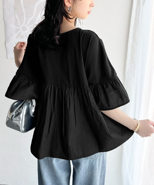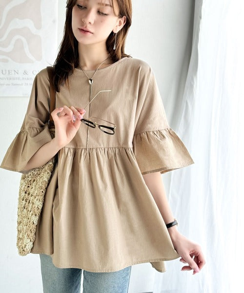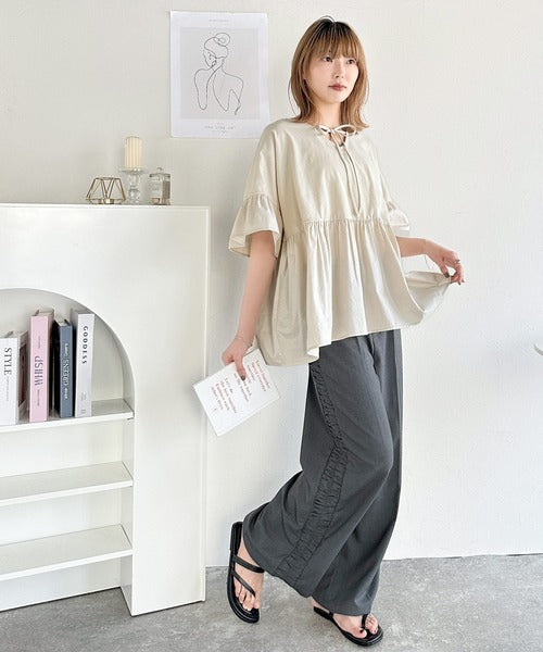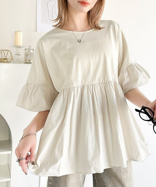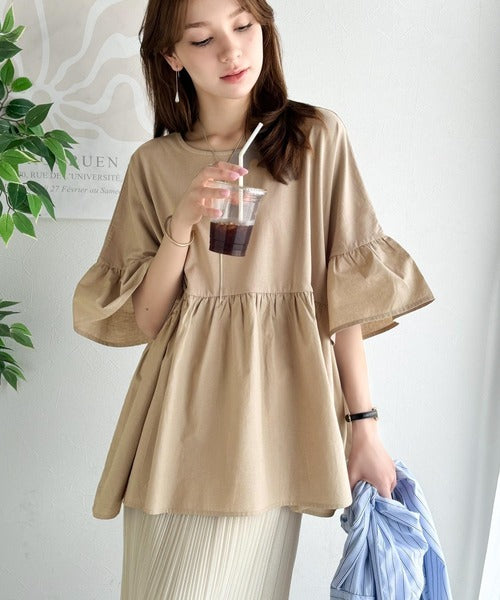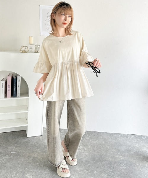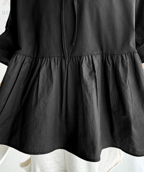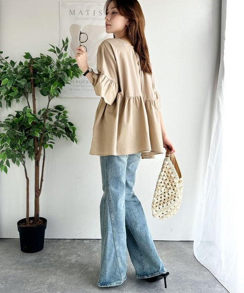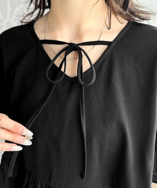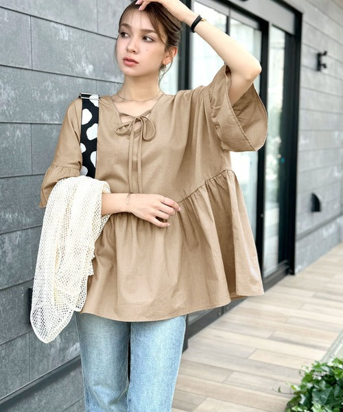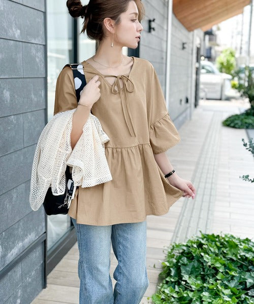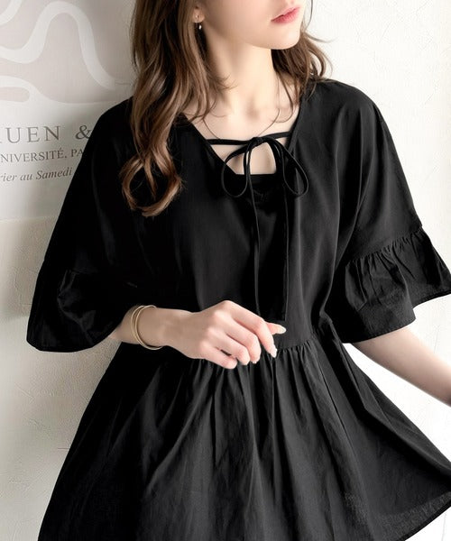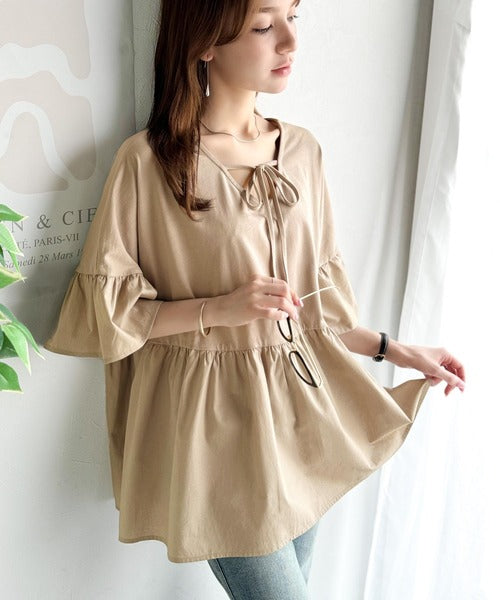 Tシャツより上品に、ブラウスより気軽に。綿100%前後2WAYシルケット加工布帛コンビリボンペプラムトップス(半袖) ce1260383