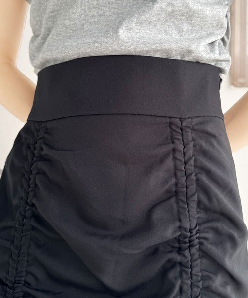 フロントに2本づつ共地のドロストを使用したシャーリング仕様。