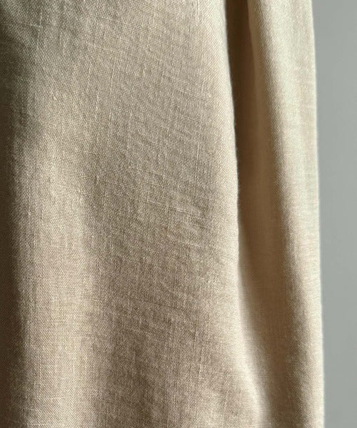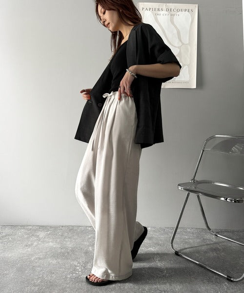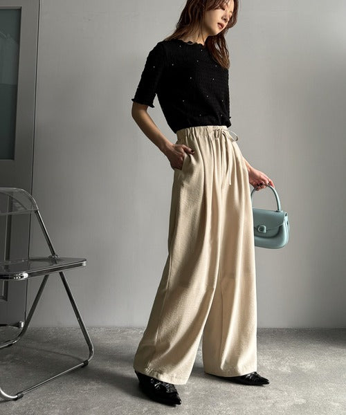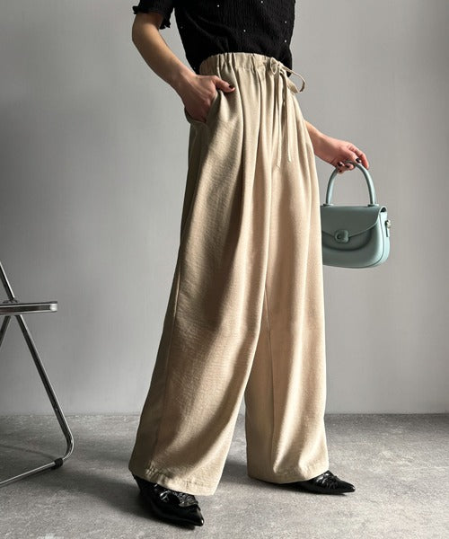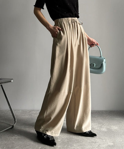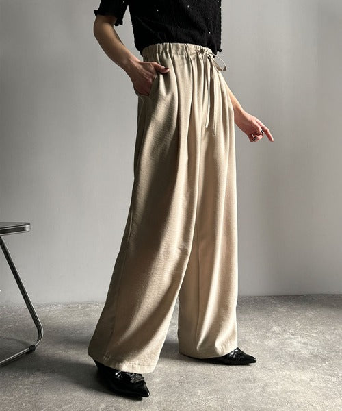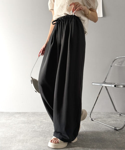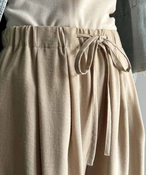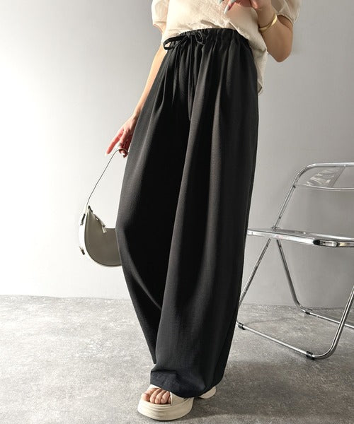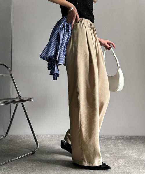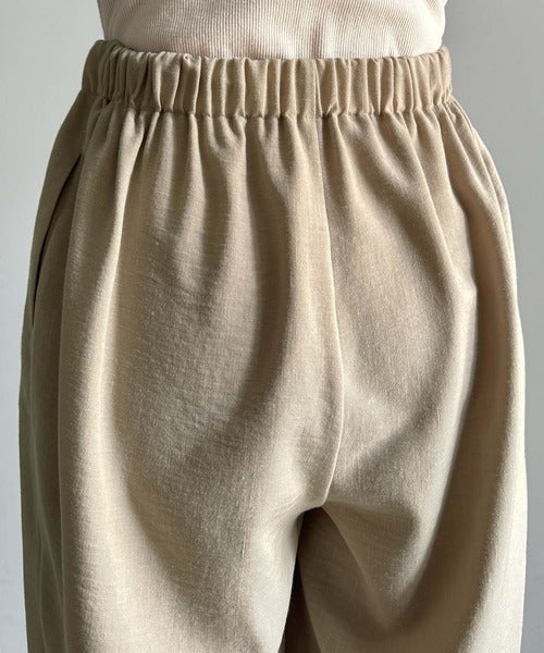 シンプルなデザインに深めのタックを施し、ウエスト部分にギャザーを加えた立体感のある仕上がり。