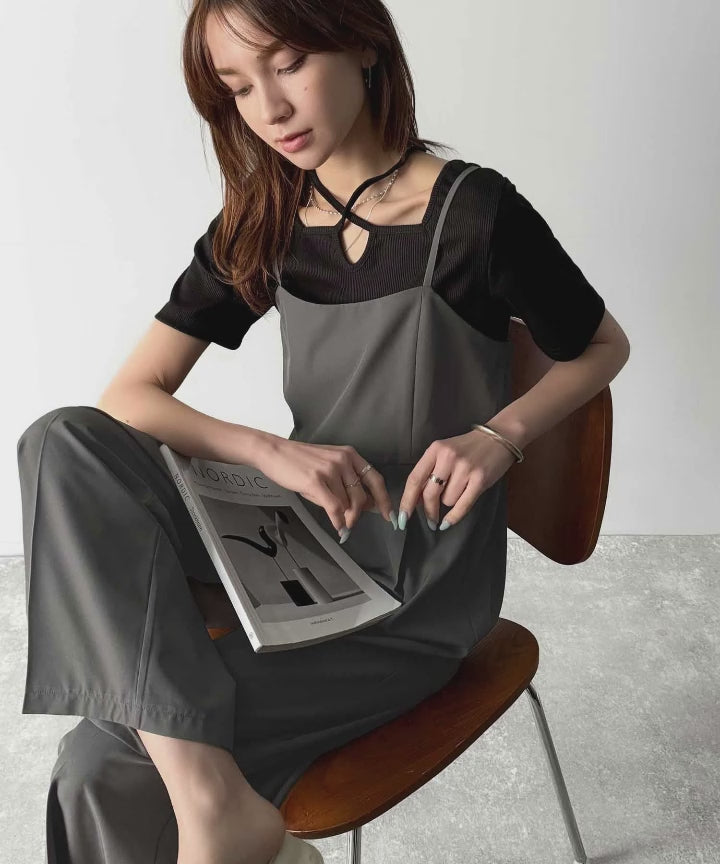 このキャミサロペットは、シンプルなデザインながら、着るだけで美脚を引き出す優れもの。