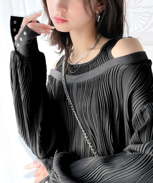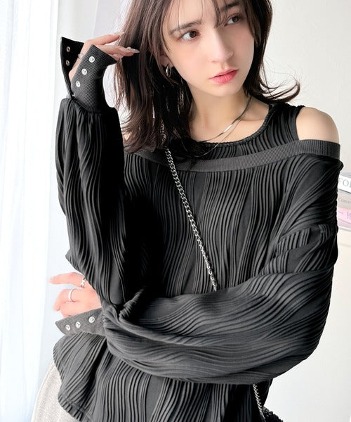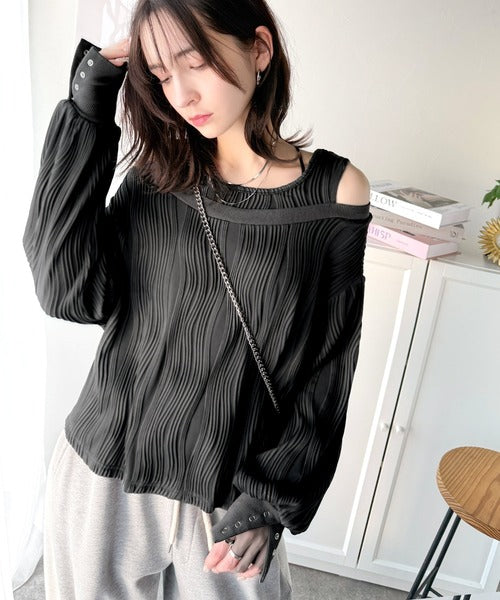ウェーブ柄生地とレイヤード風デザインデザインのトップス。