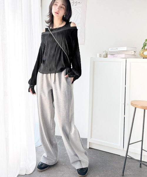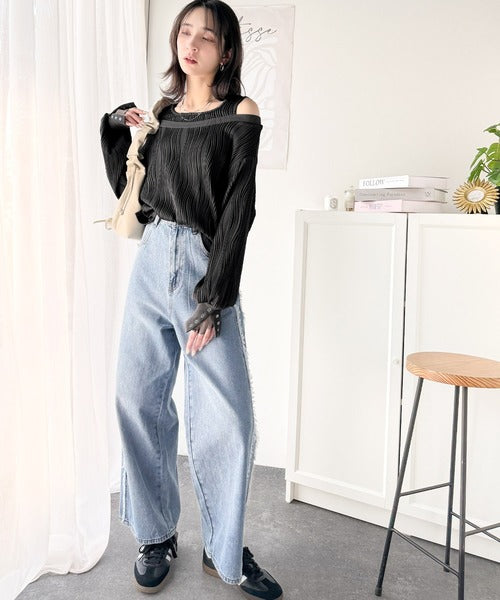 華やかな印象を与えるこのトップスは、さりげないオフショルデザインが魅力的!