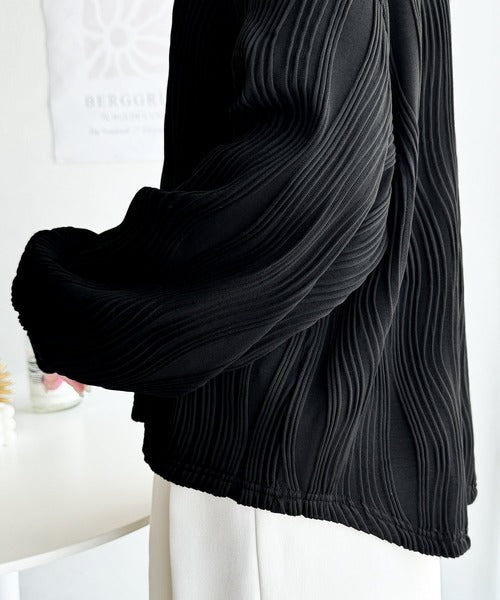 フェイクレイヤードデザインでシルエットが崩れにくく、立体的なウェーブ柄生地が高級感を演出します。