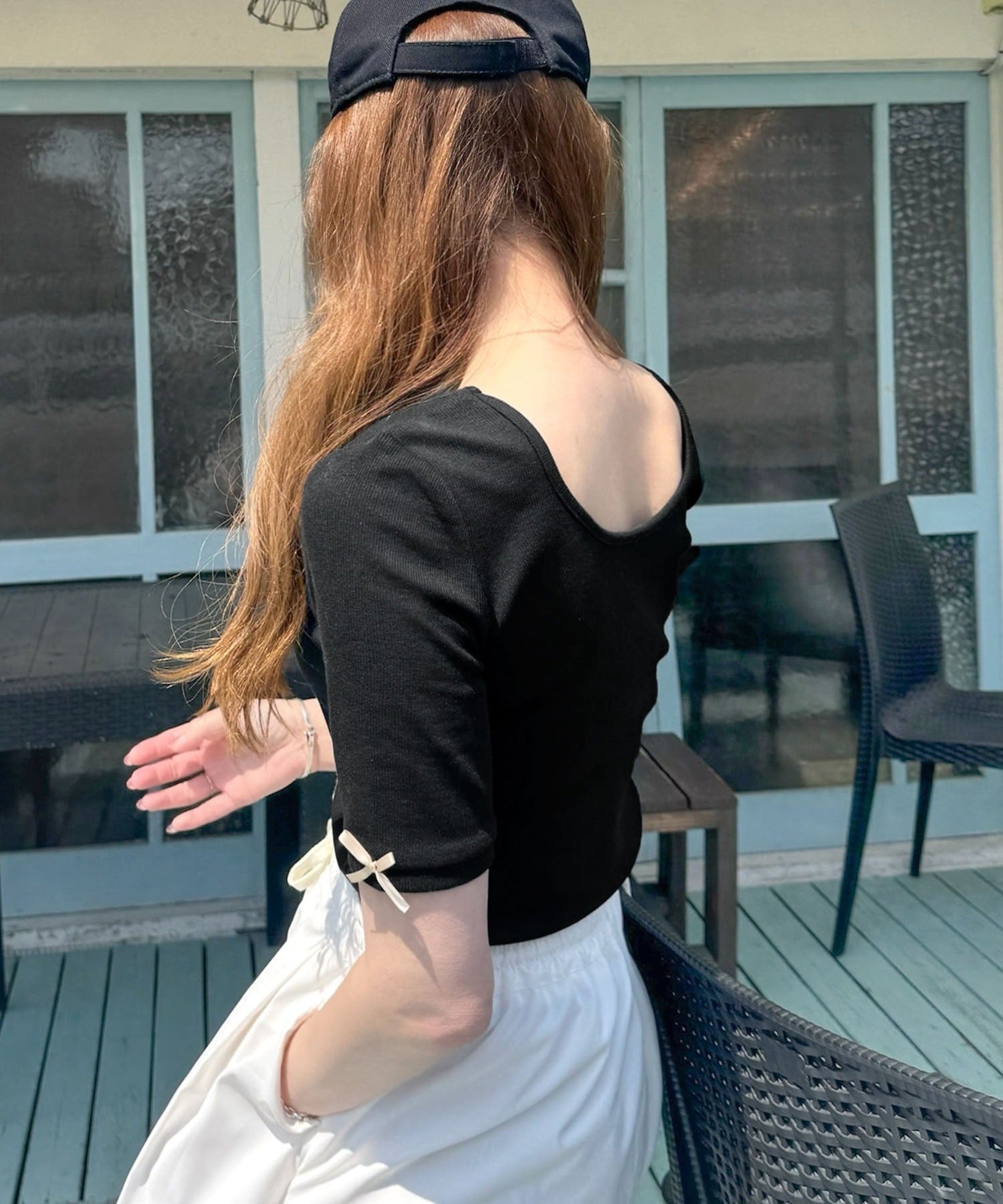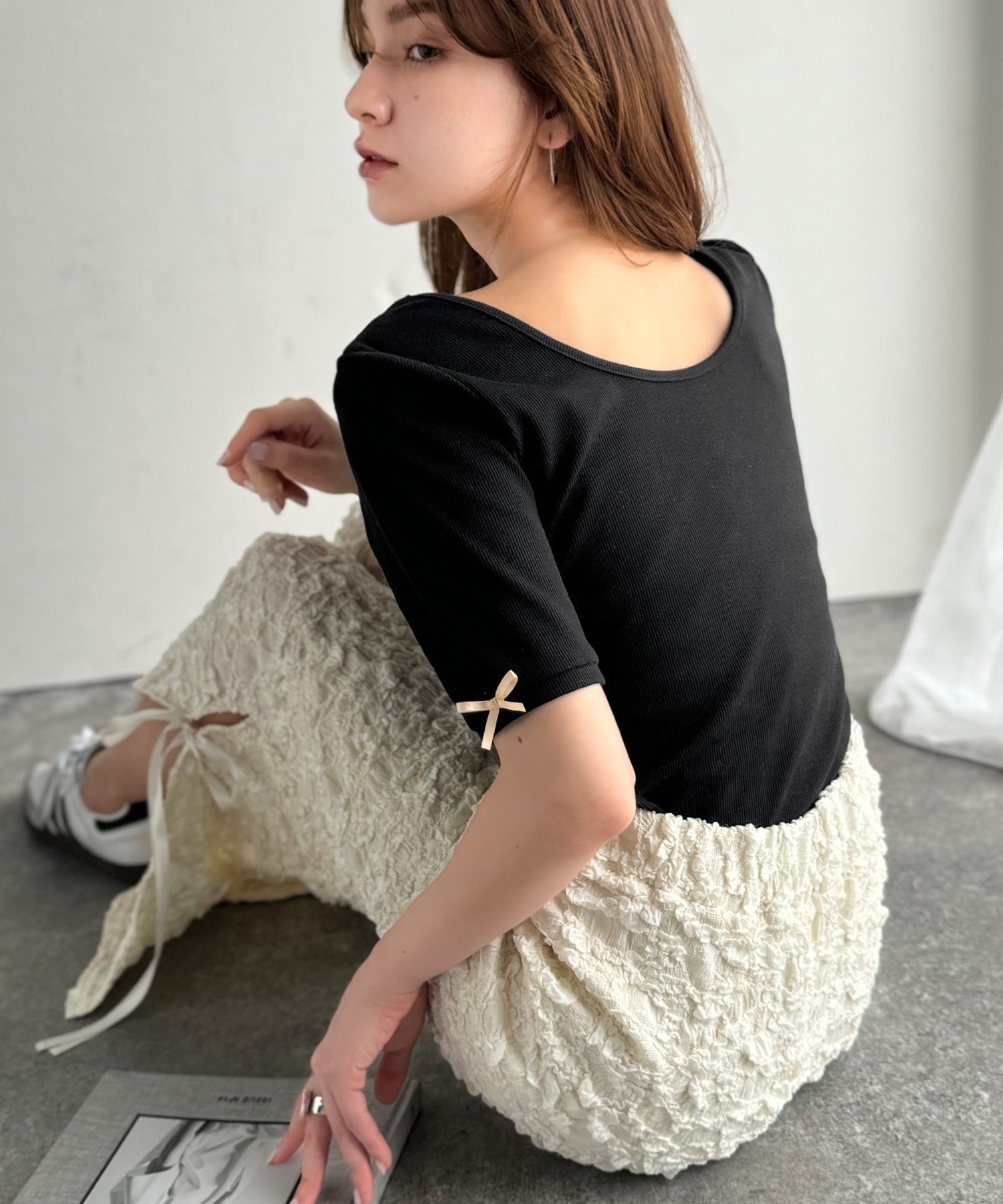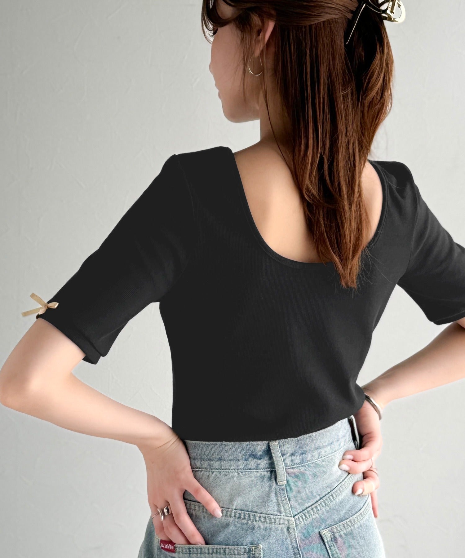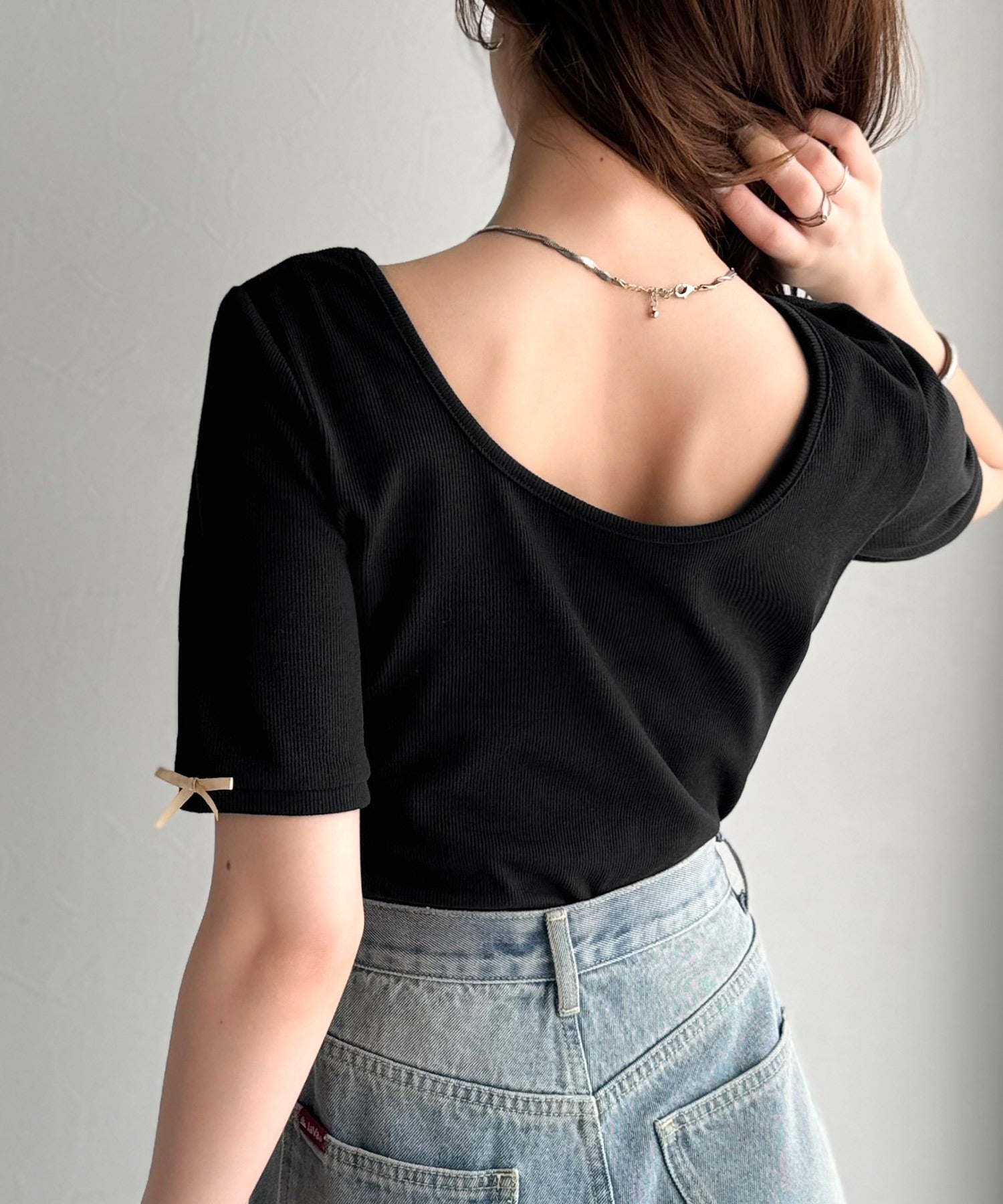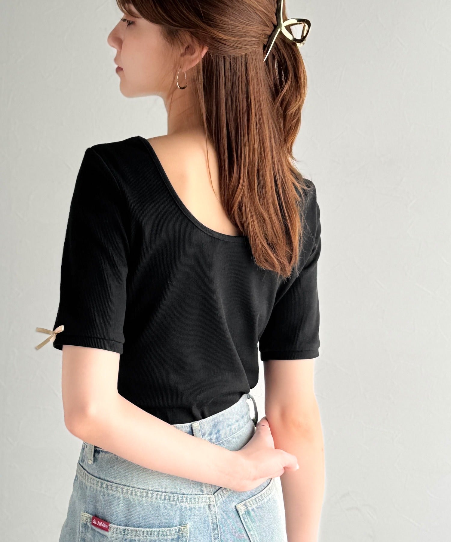 背中開き×袖リボンのフェミニンなアクセントが魅力のリブトップス。