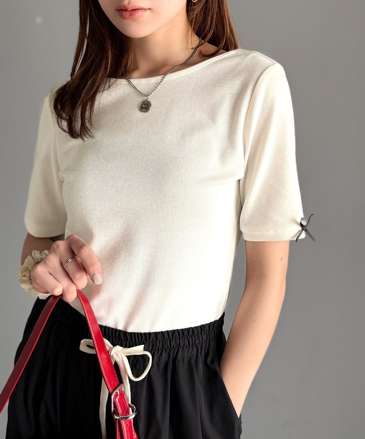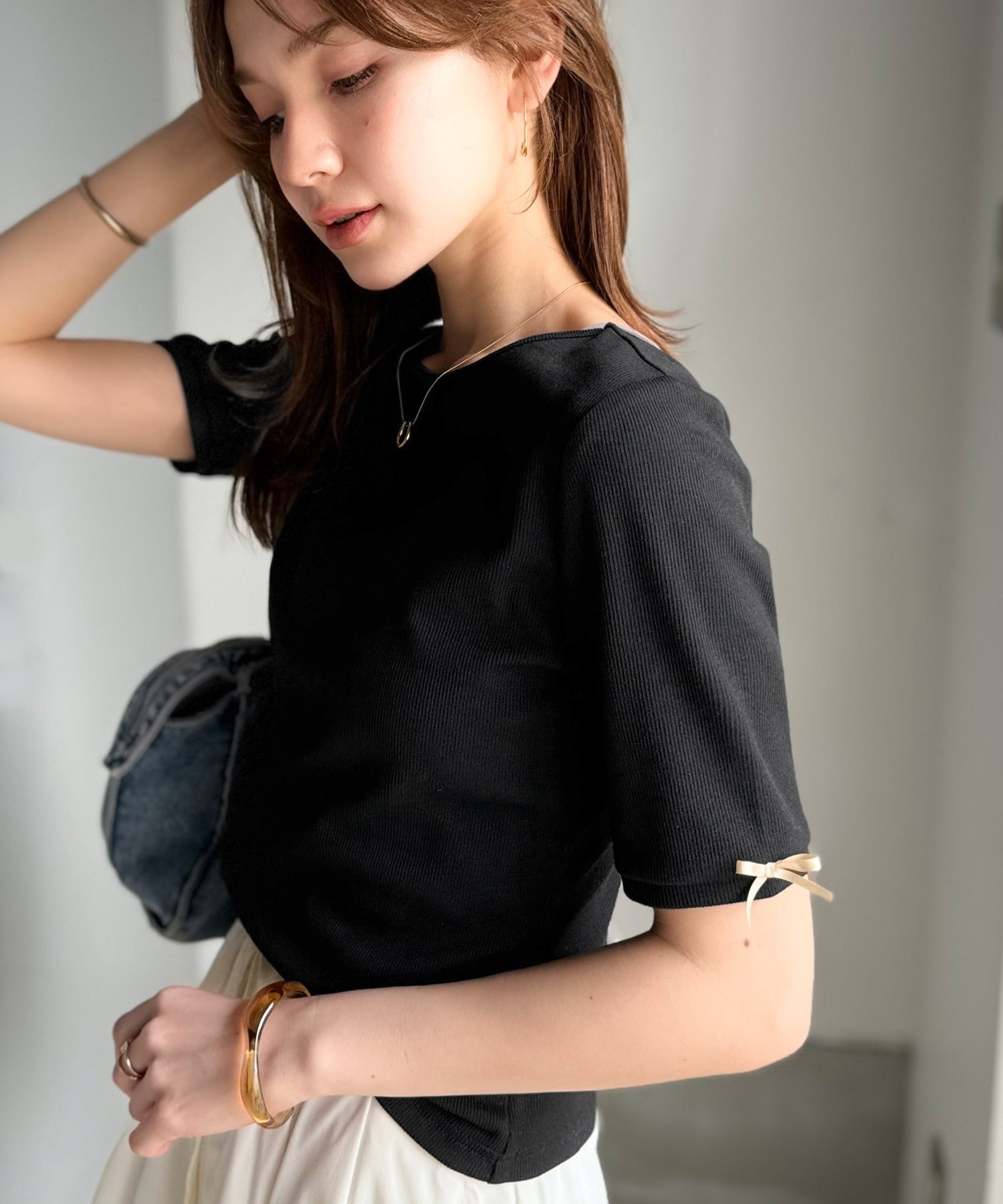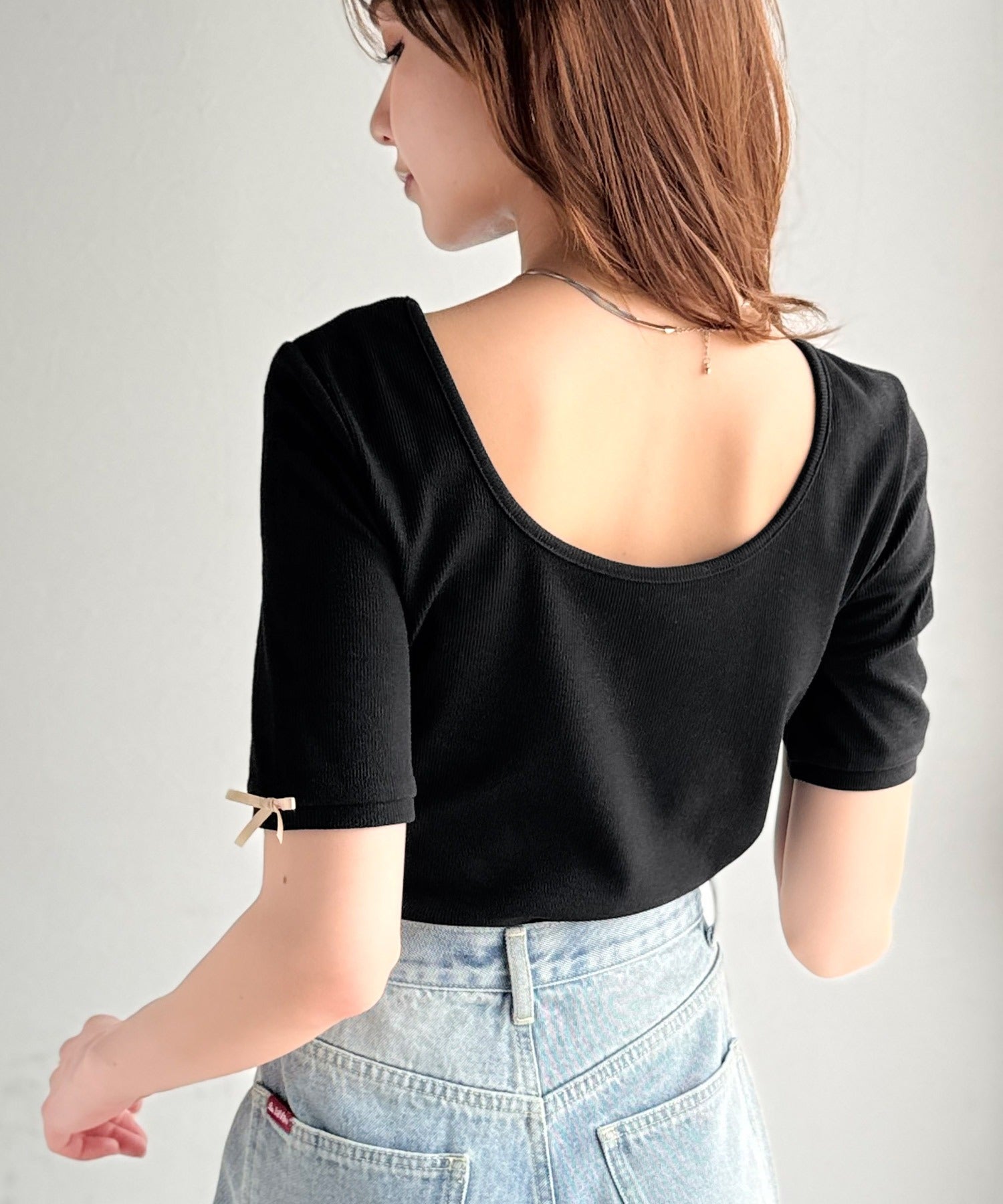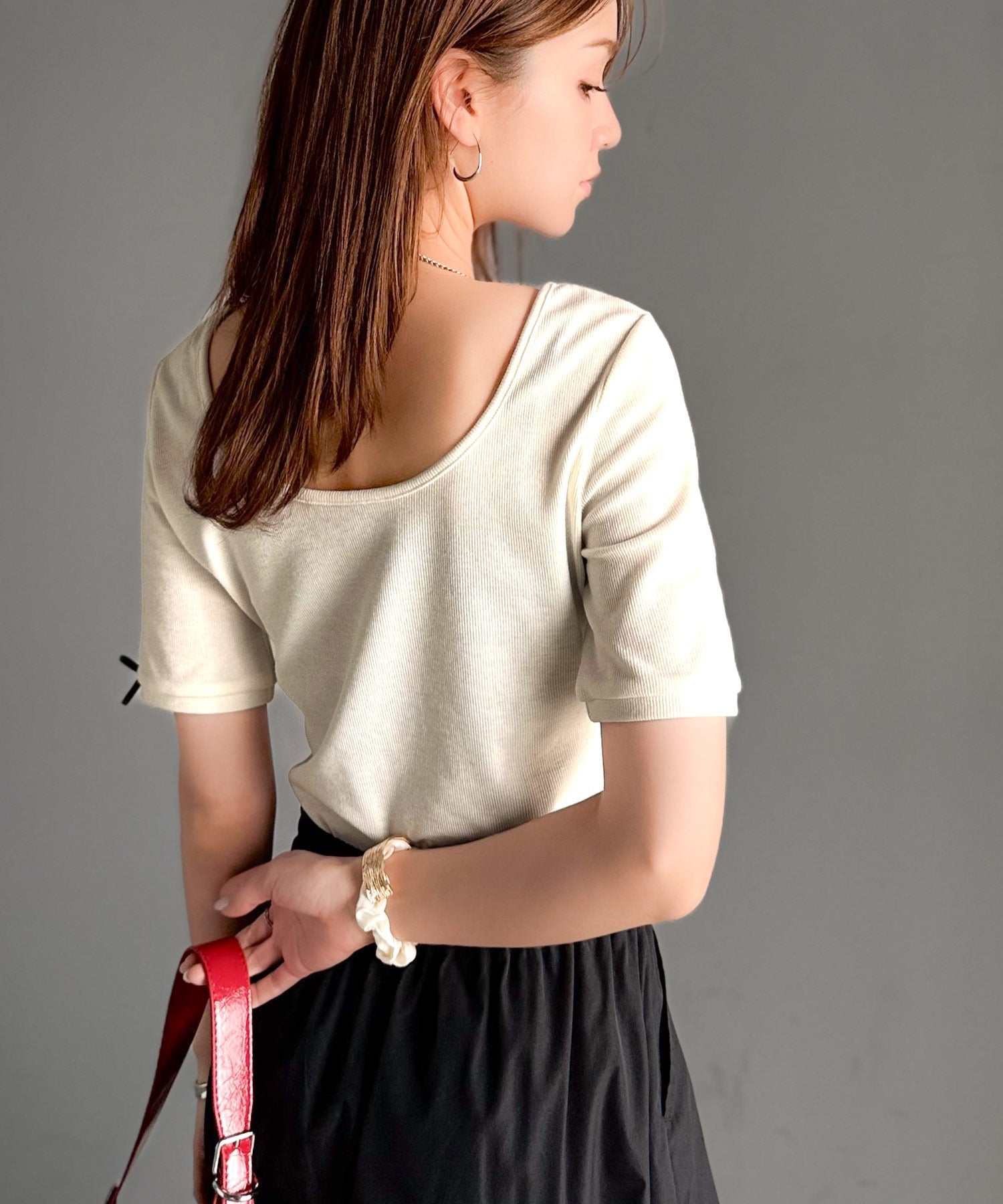 背中開き×袖リボンのフェミニンなアクセントが魅力のリブトップス。