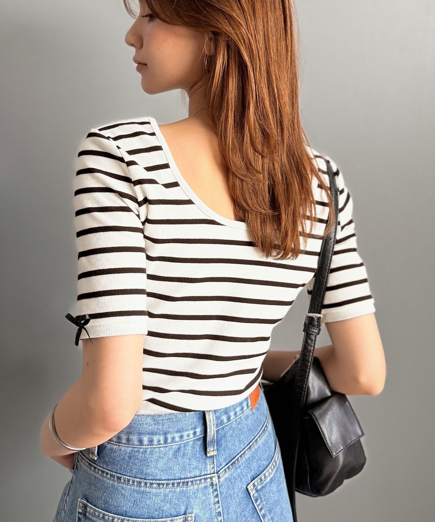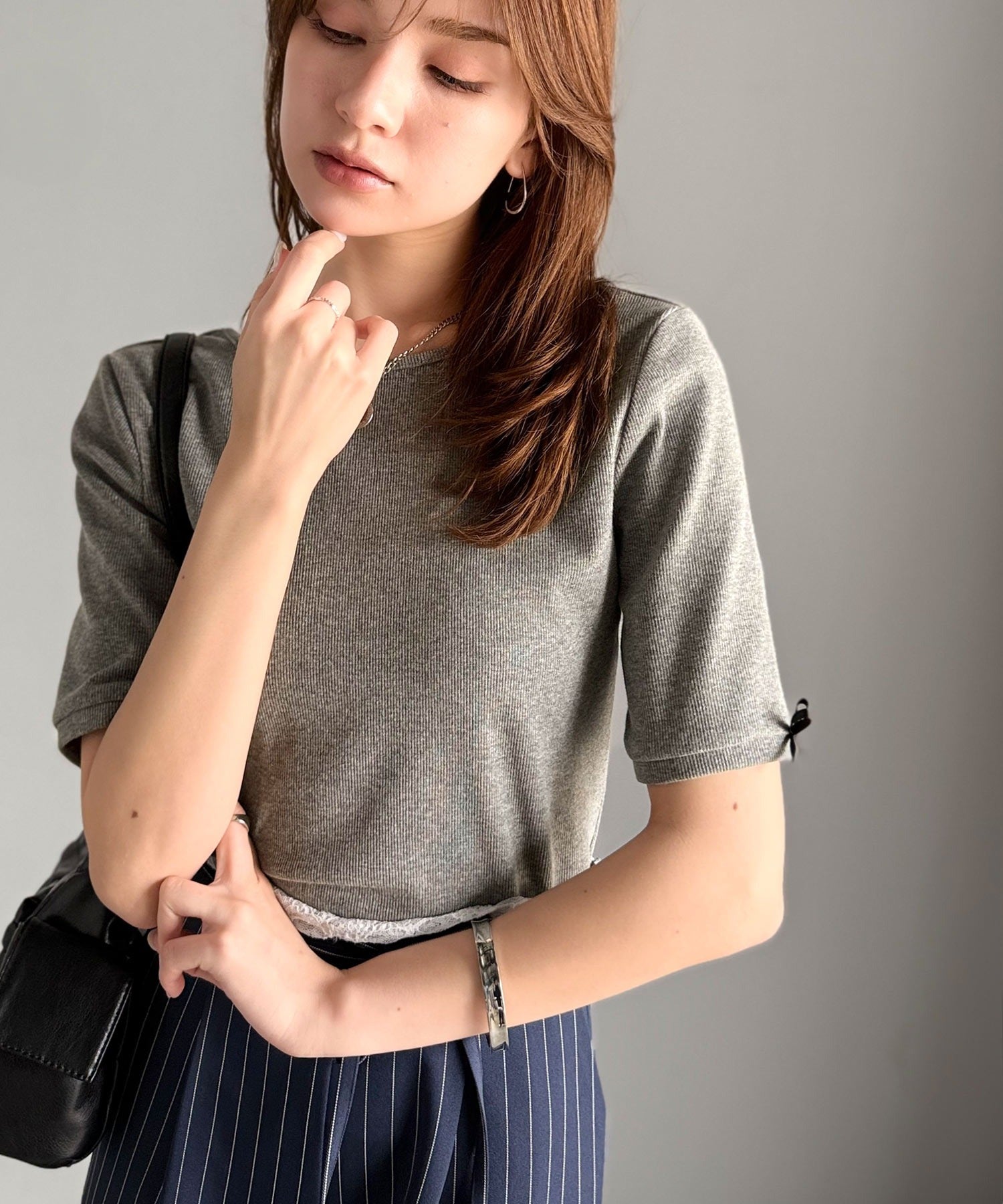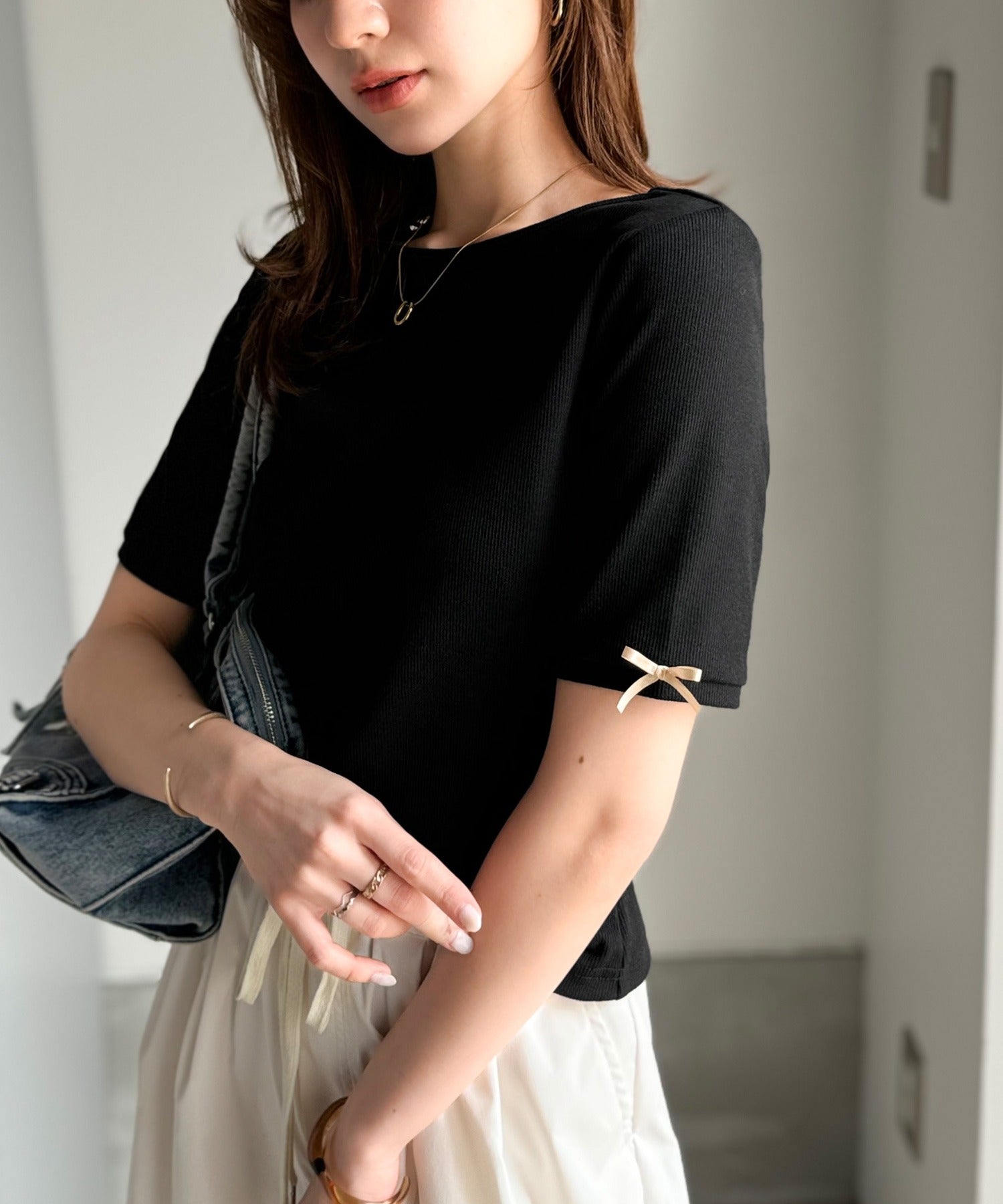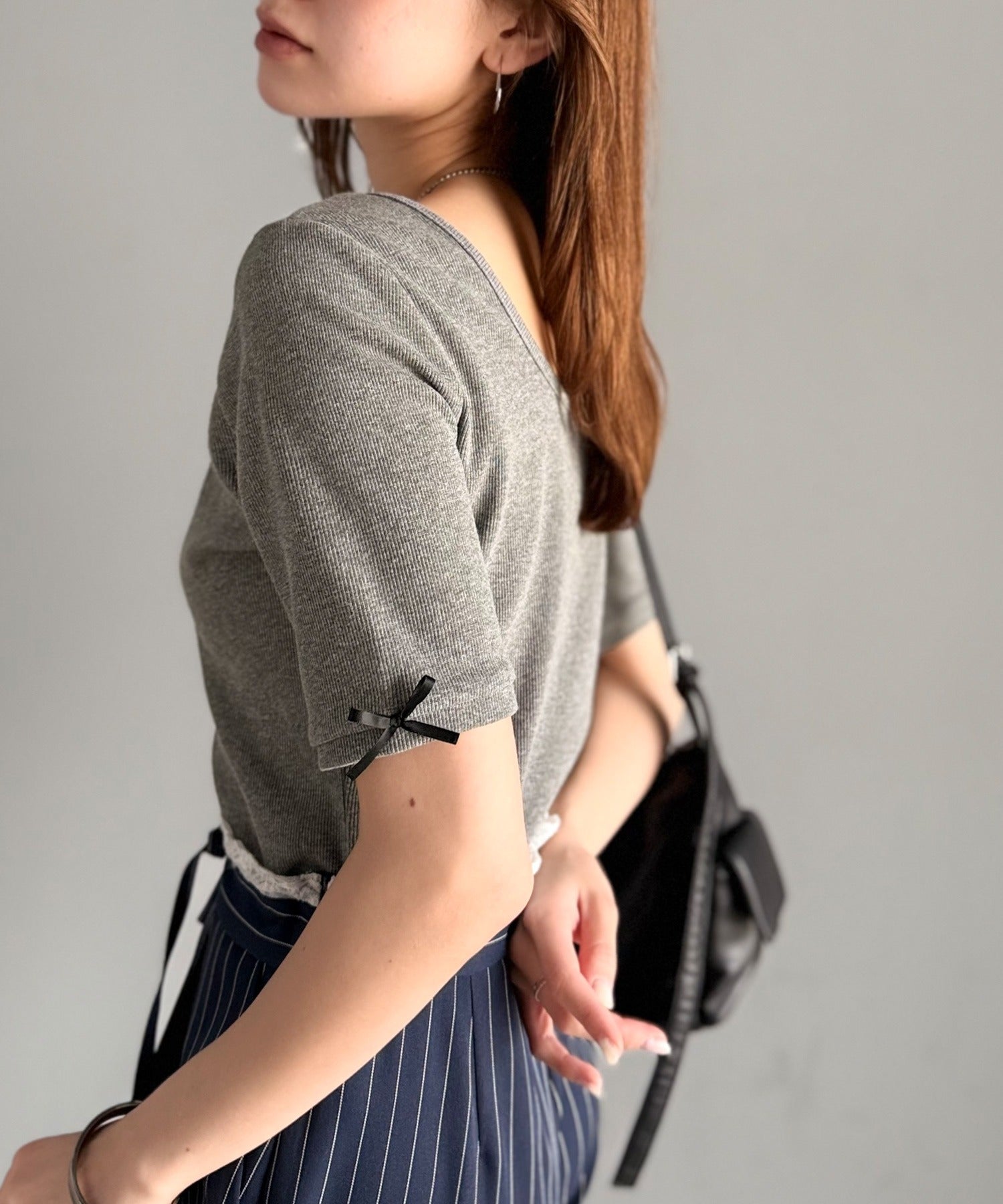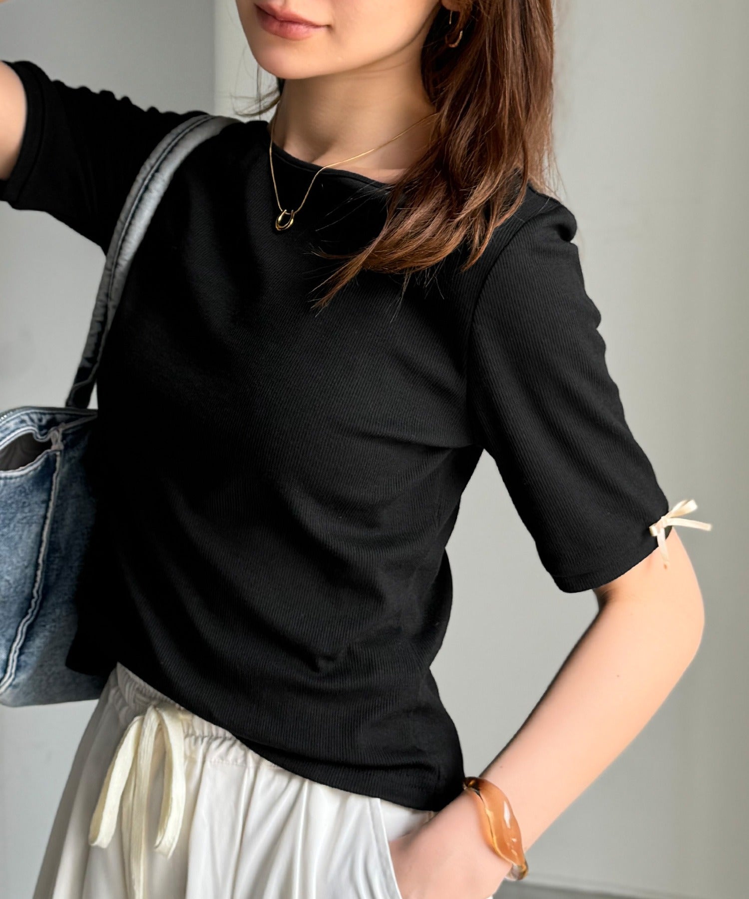 背中開き×袖リボンのフェミニンなアクセントが魅力のリブトップス。