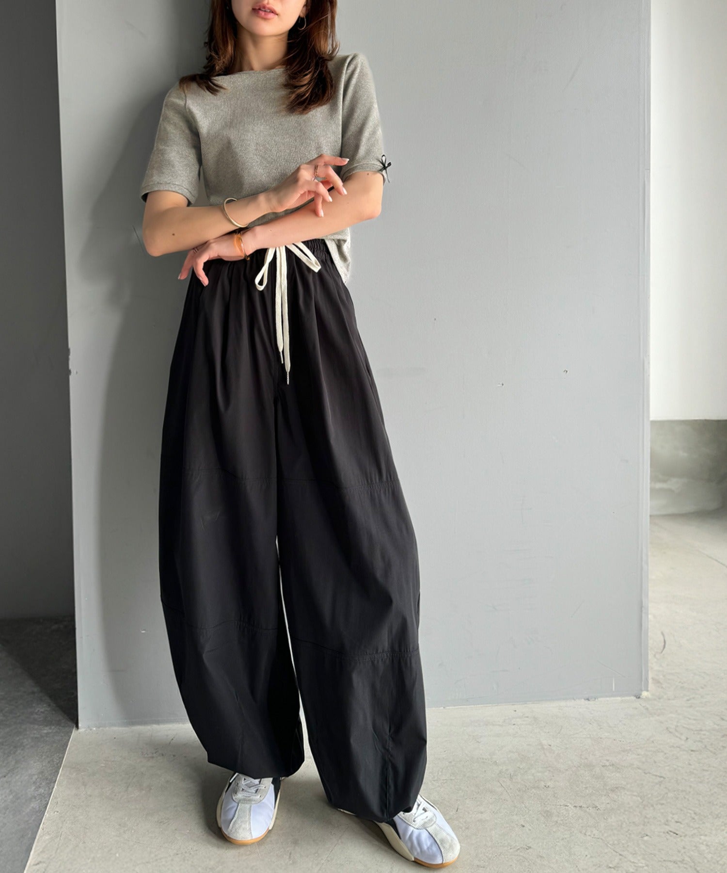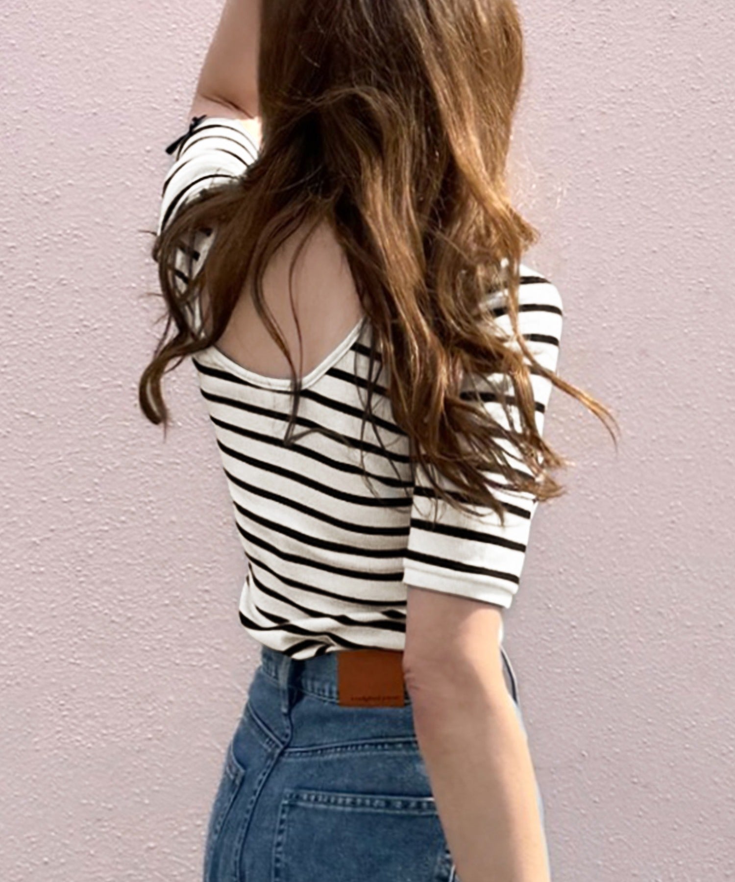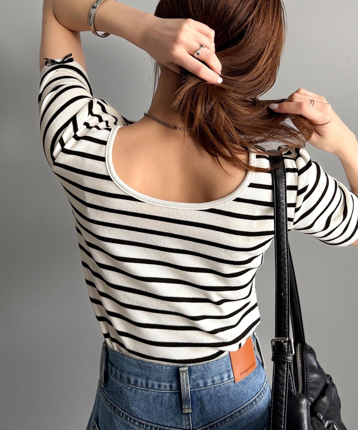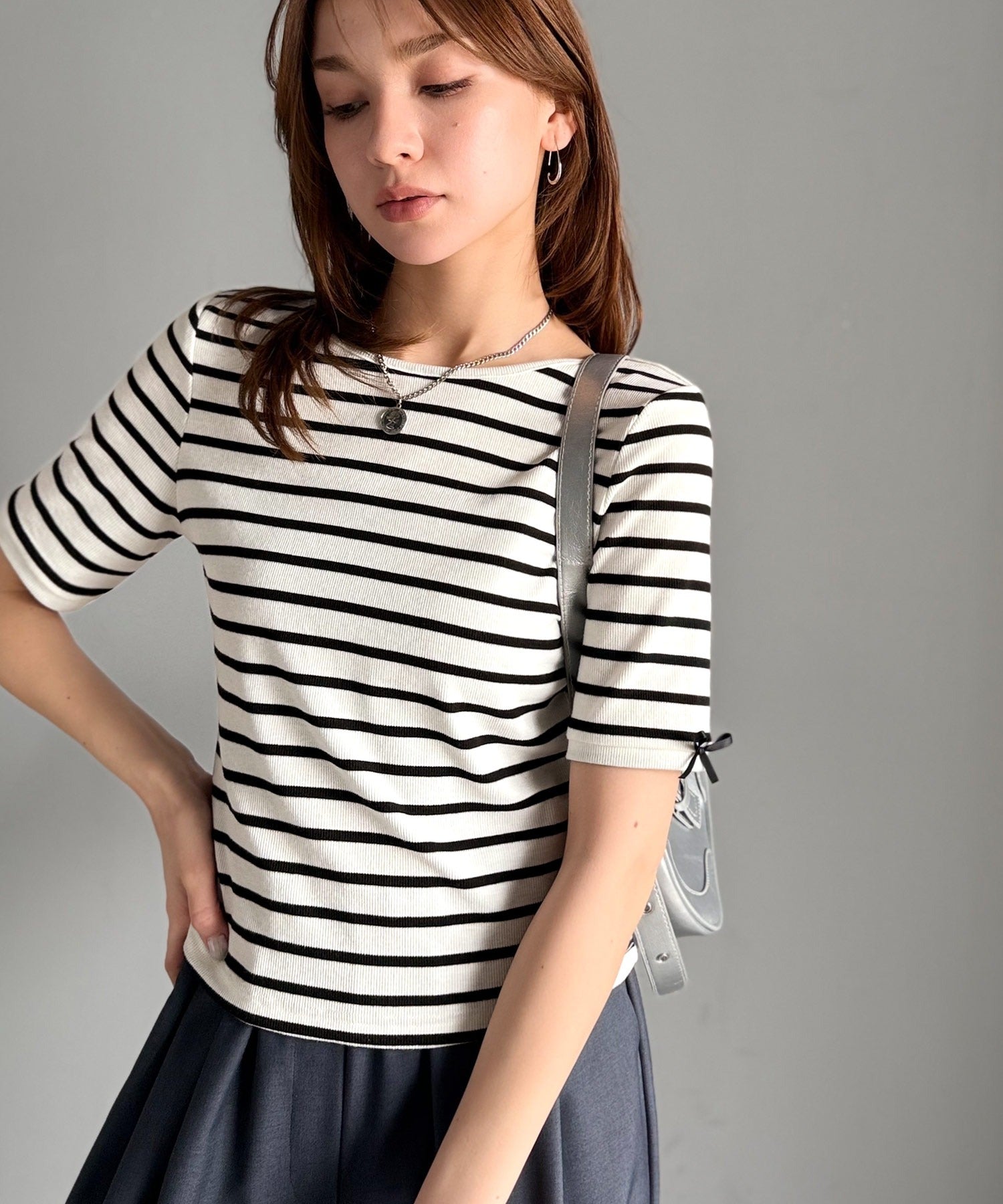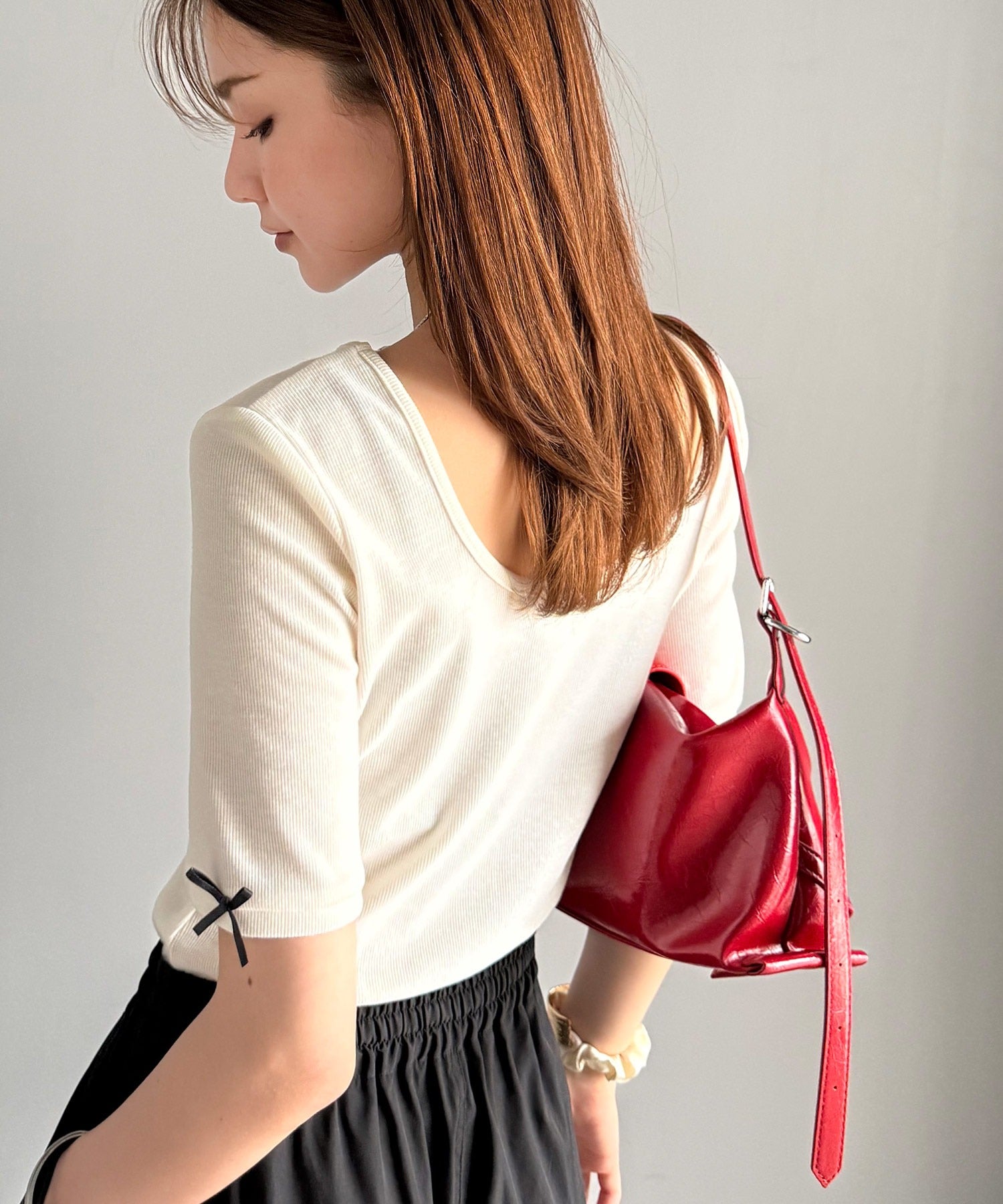 背中開き×袖リボンのフェミニンなアクセントが魅力のリブトップス。