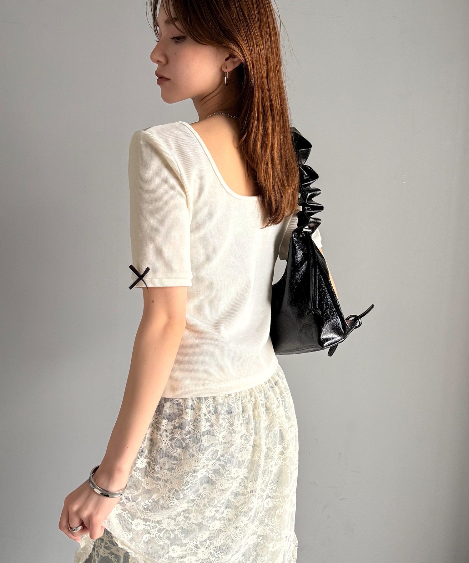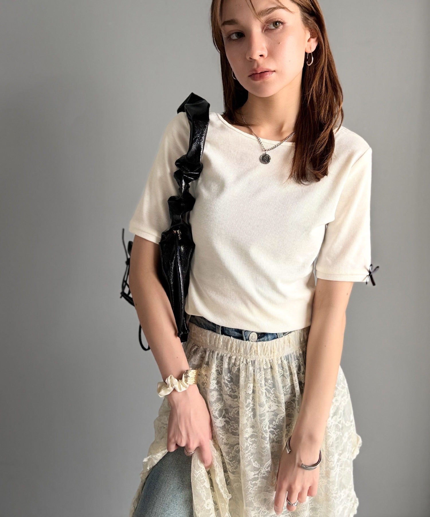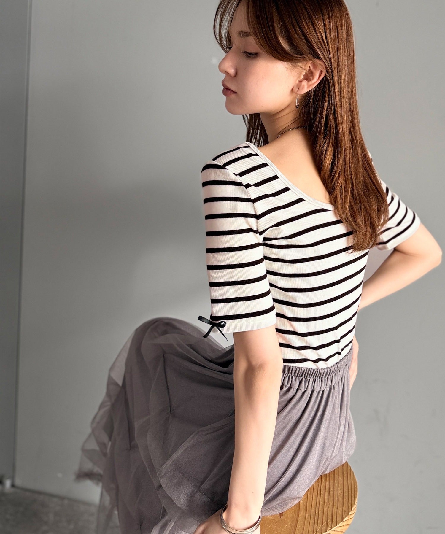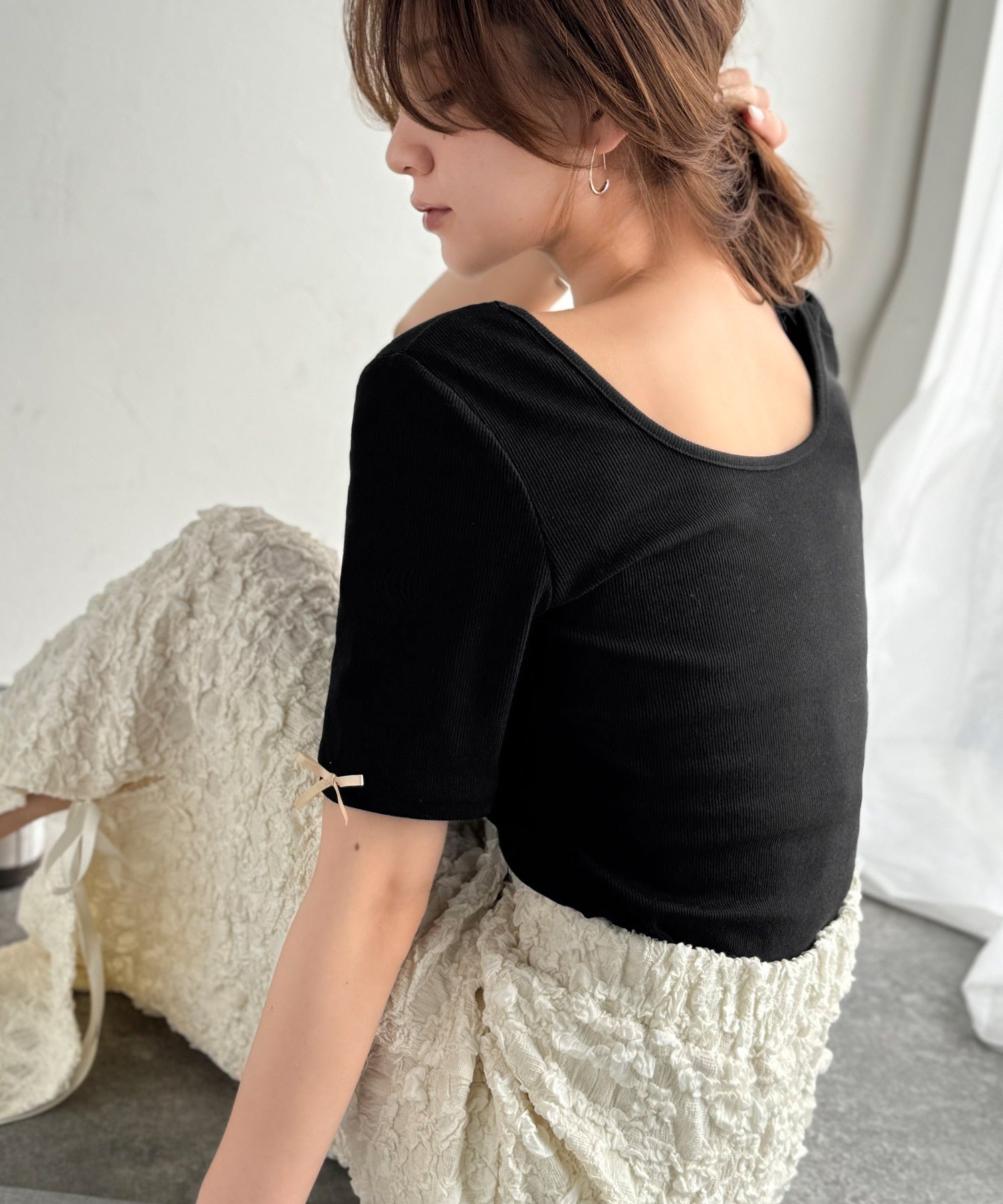 《AYA×クラシカルエルフコラボ》大人可愛いを叶える。前後2way袖リボンバックオープンリブトップス(半袖) ce1010432