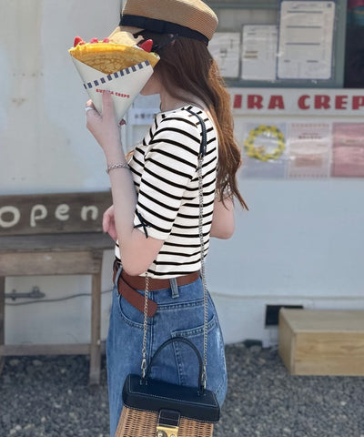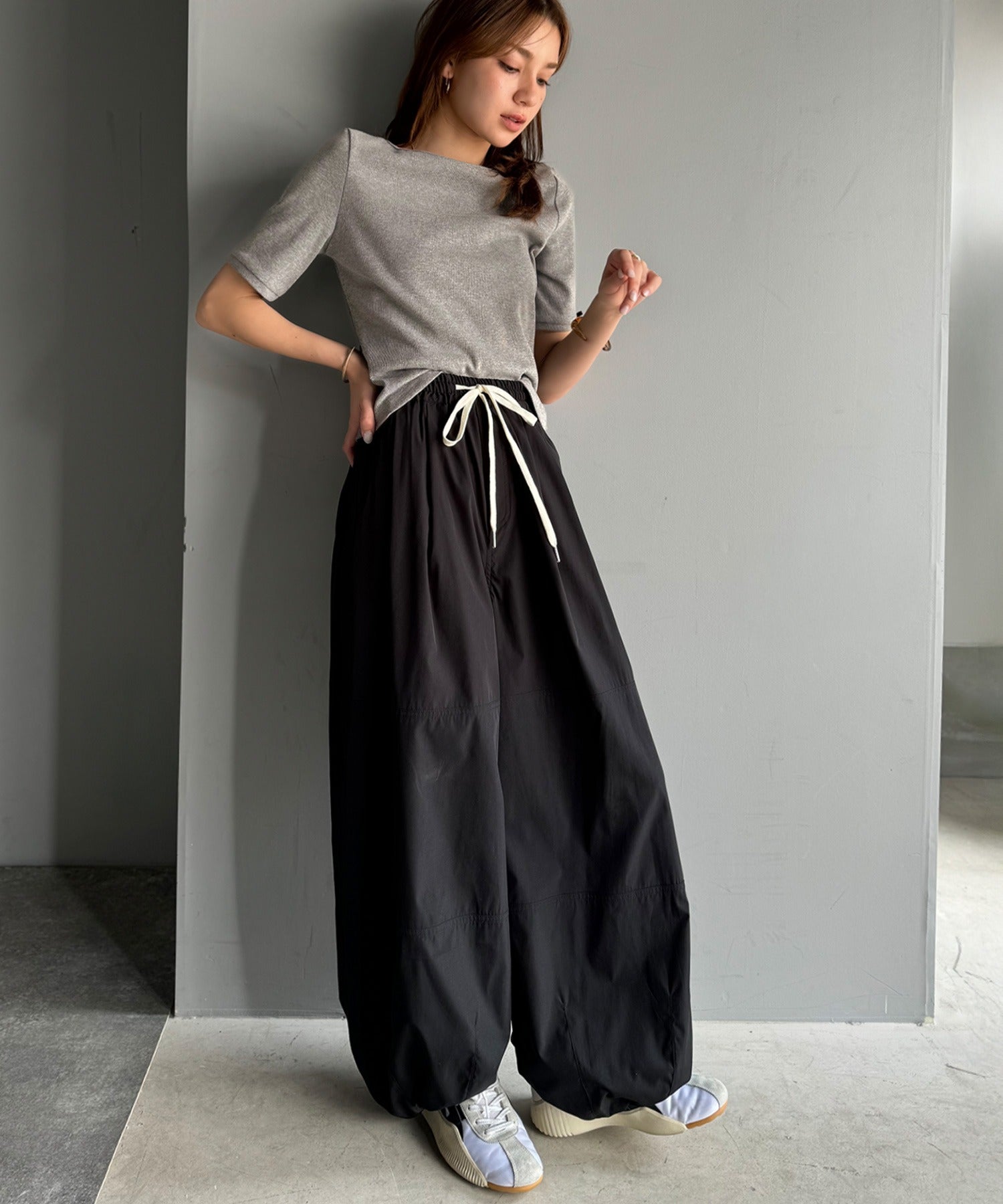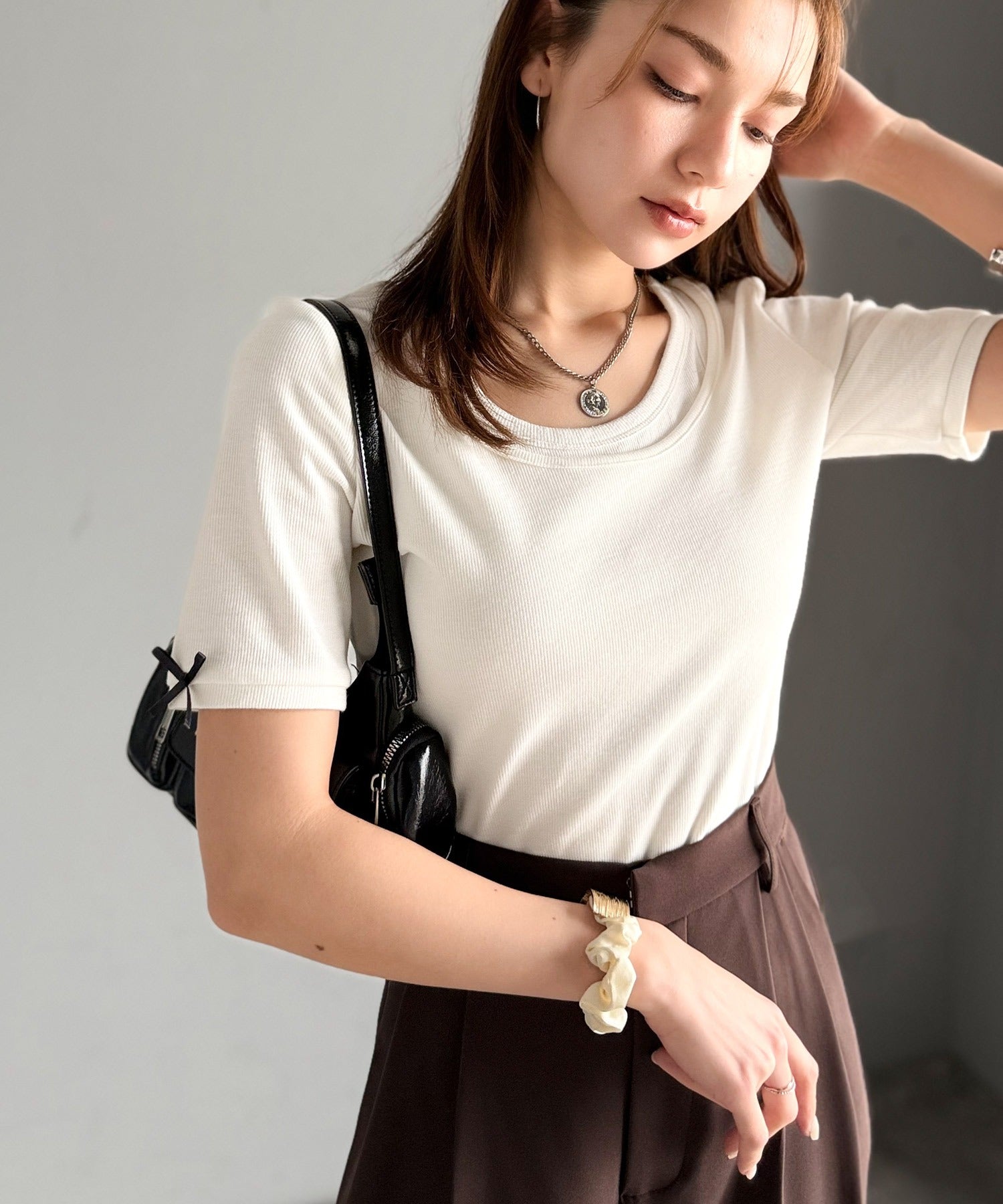 トレンドを取り入れた高級感漂うデザインの半袖リブトップス。