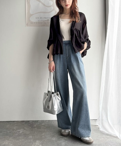 ボタンを閉めてペプラム風に一枚で着ても存在感のあるブラウスですが、綺麗めにもカジュアルにも合わせやすく