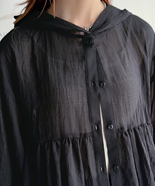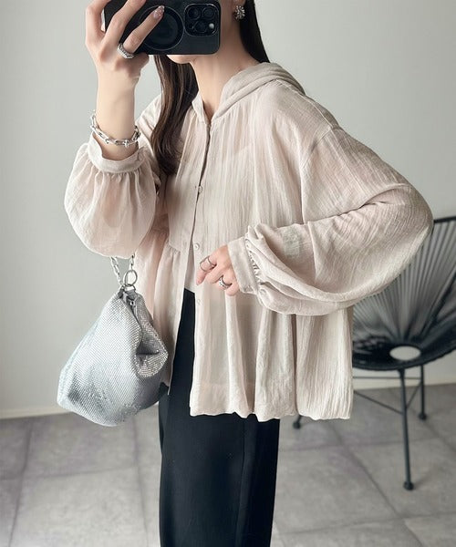 エアリーなシアー素材が魅力のフード付きブラウス。