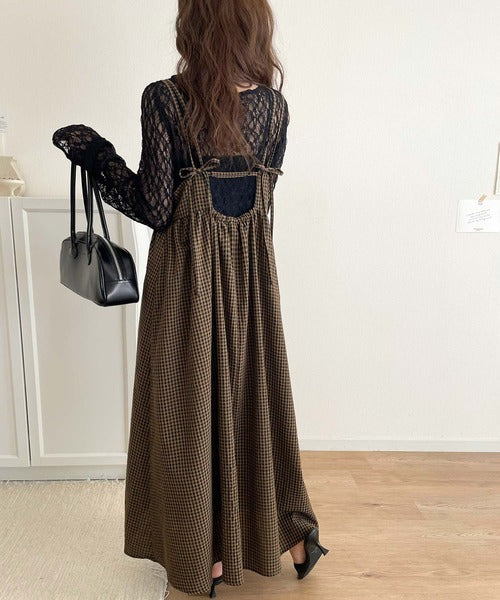 肩紐はダブルストラップ仕様で、後ろのリボンで長さ調節が可能。
