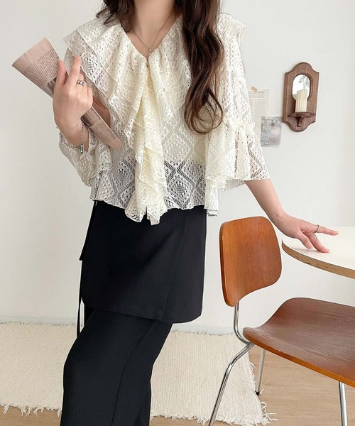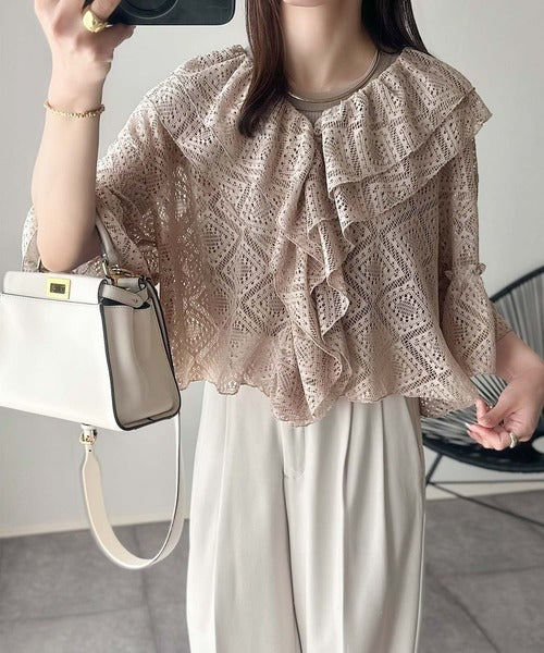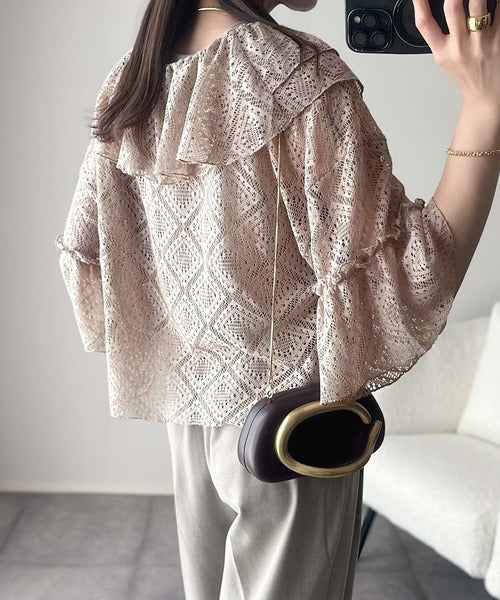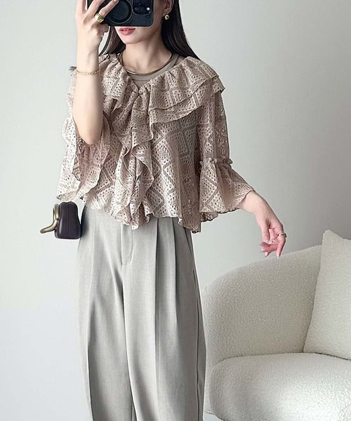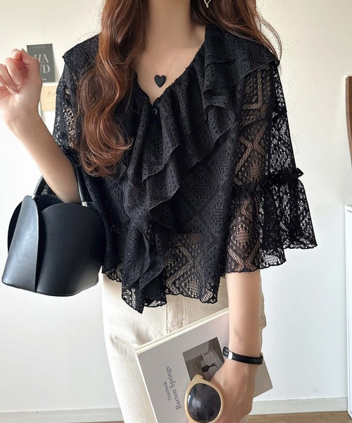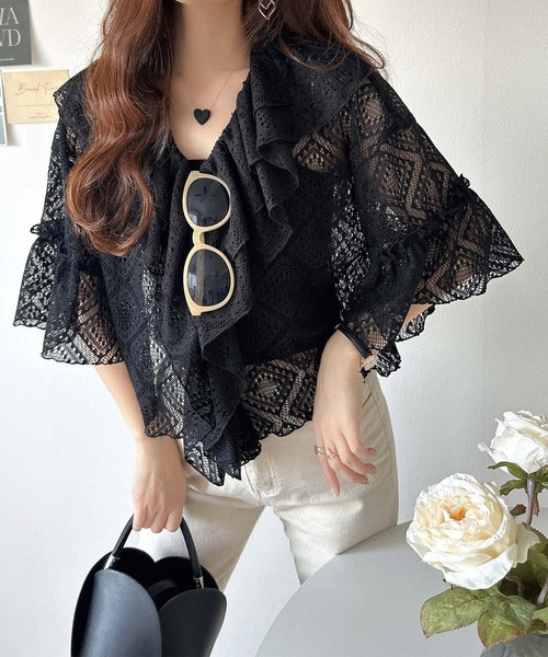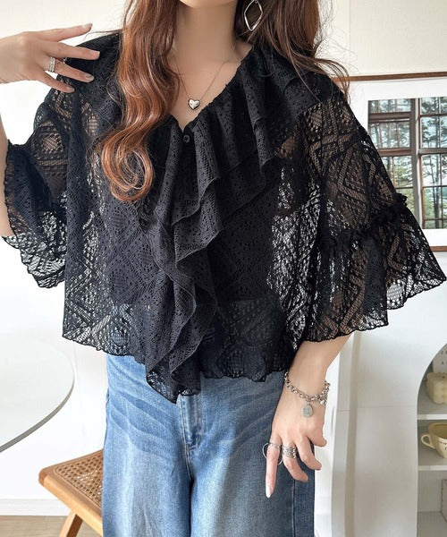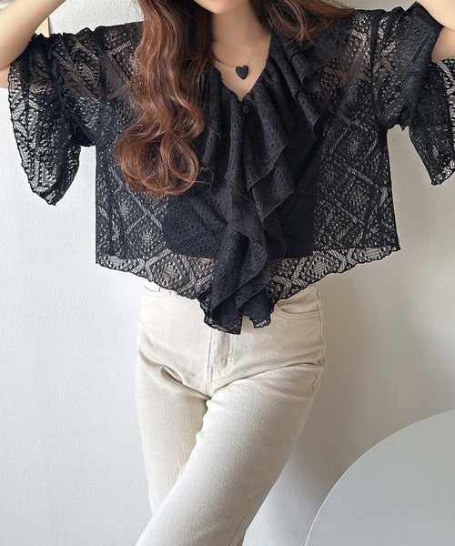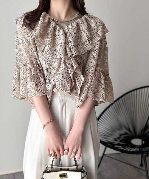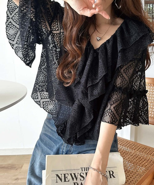 繊細な総レースと大胆なラッフルフリルが目を惹くラッフルフリルレースブラウス。