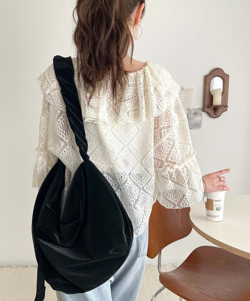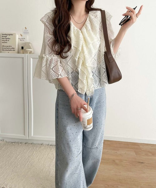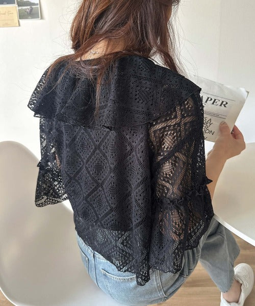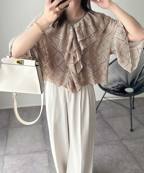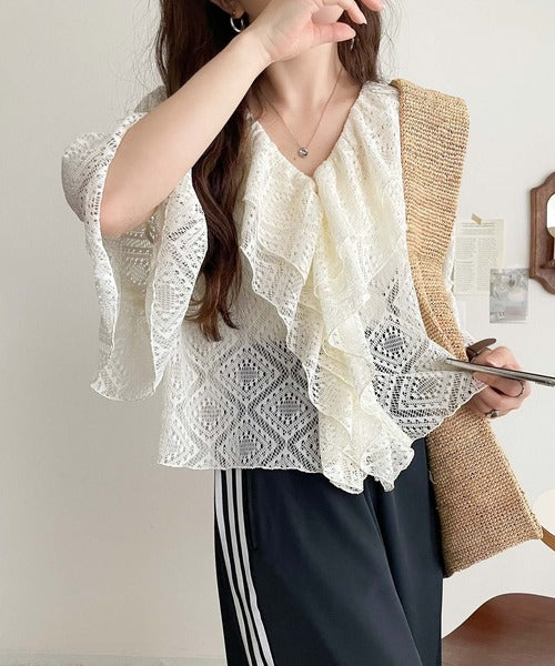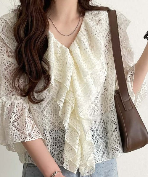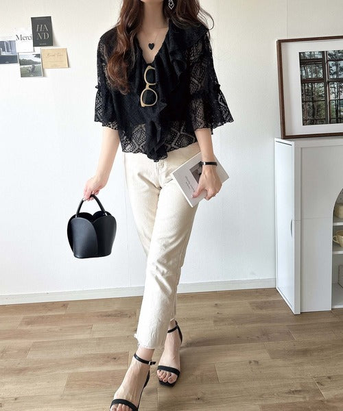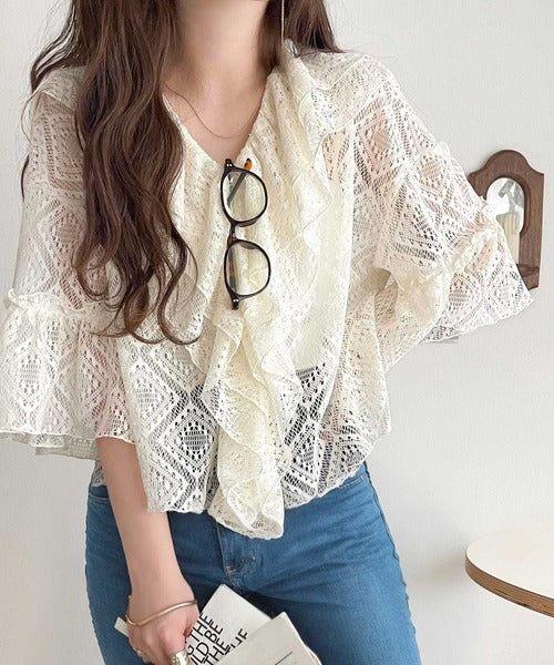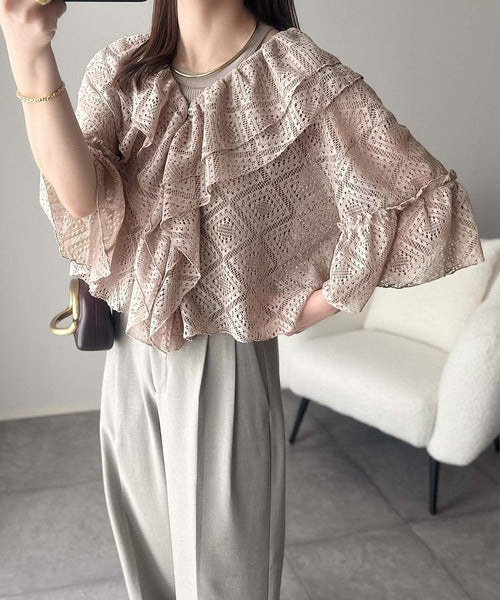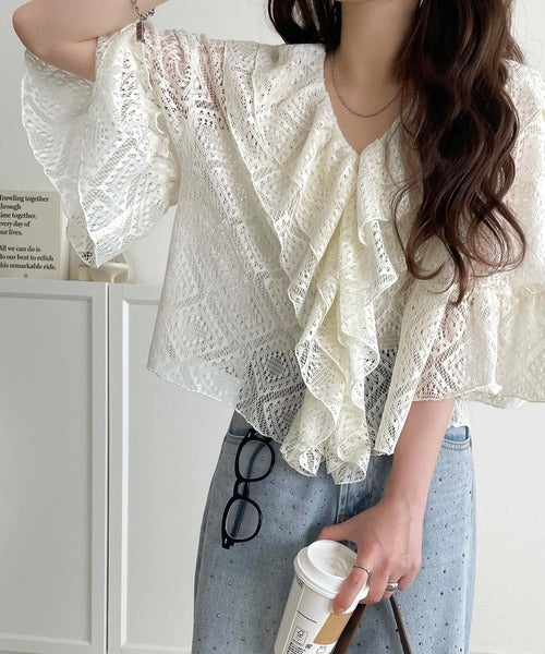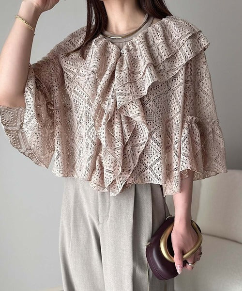 繊細な総レースと大胆なラッフルフリルが目を惹くラッフルフリルレースブラウス。