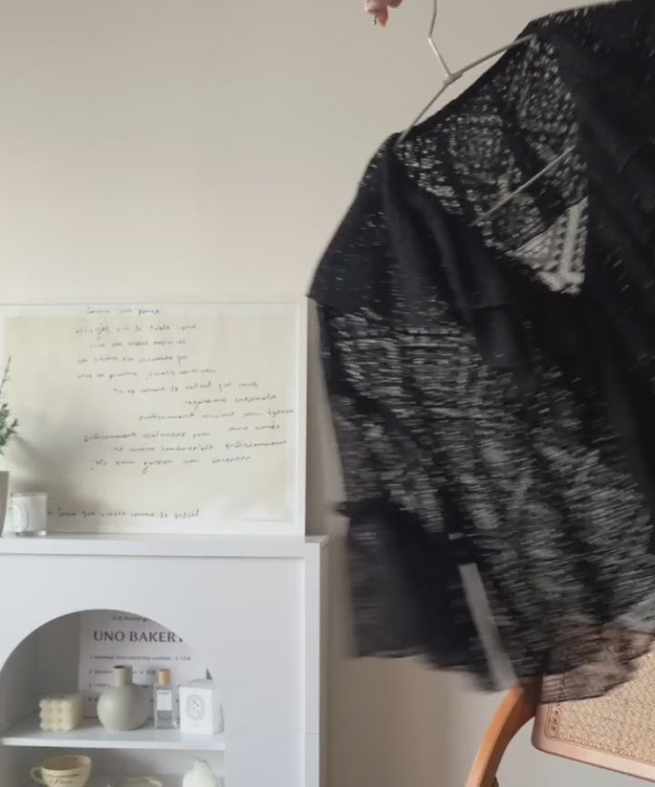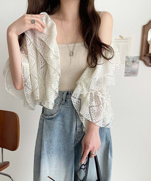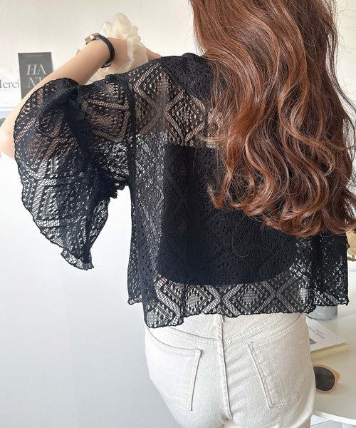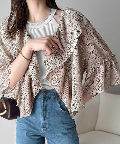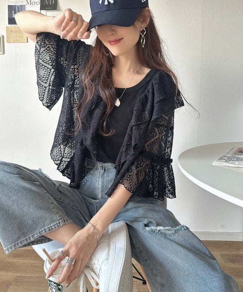 一枚で着てもレースとフリルが存在感のあるブラウスですが、カーデのように羽織ってみたり、