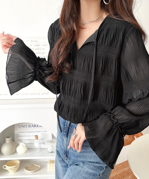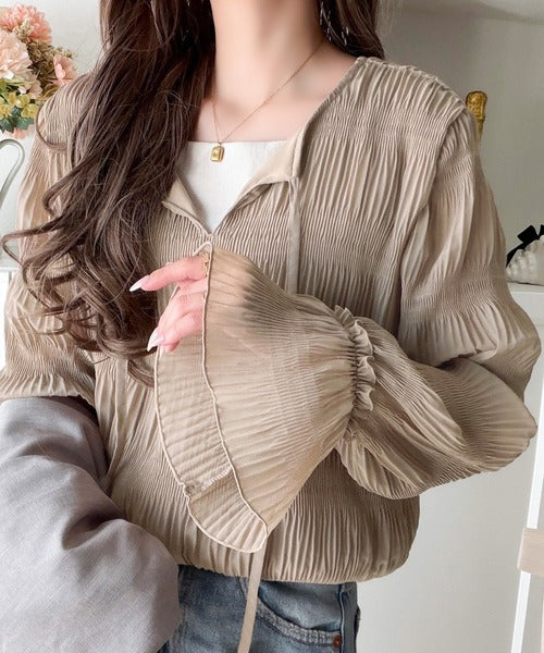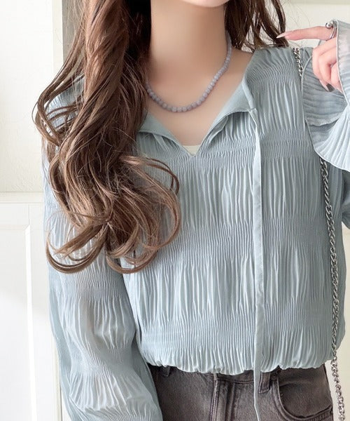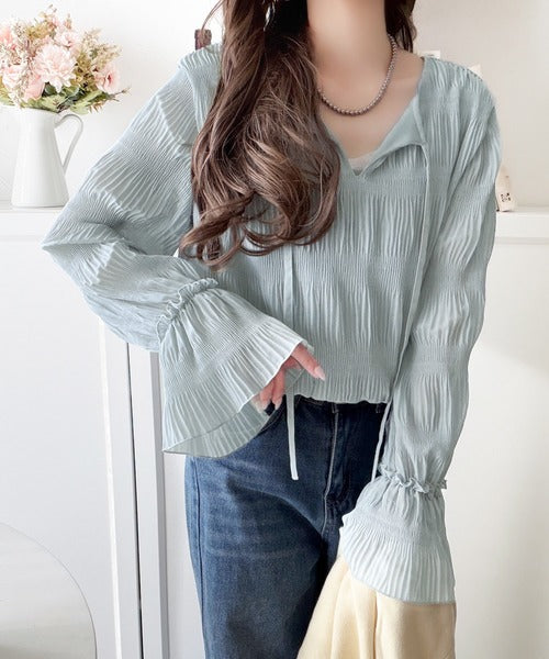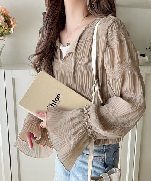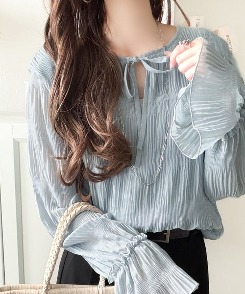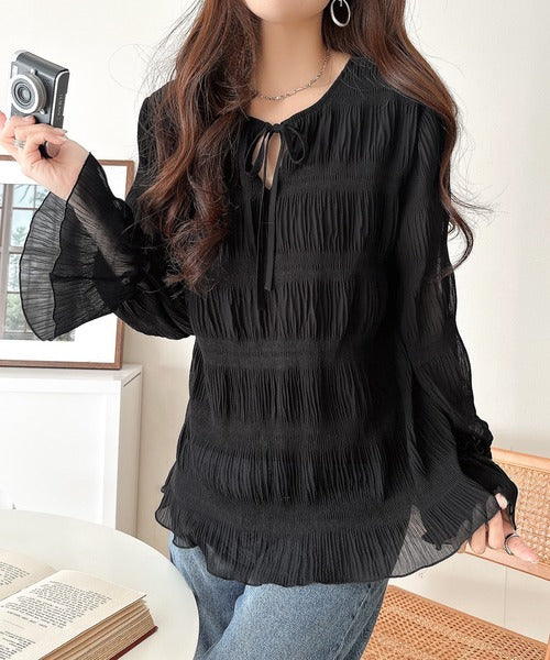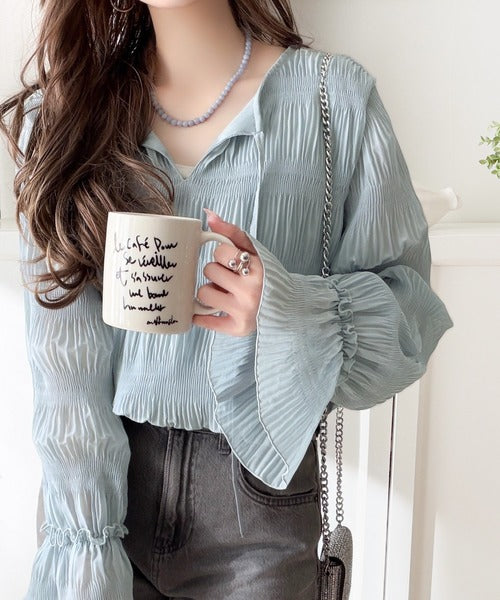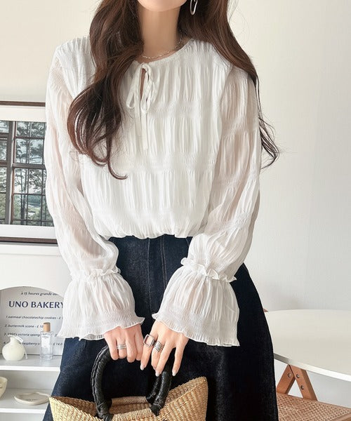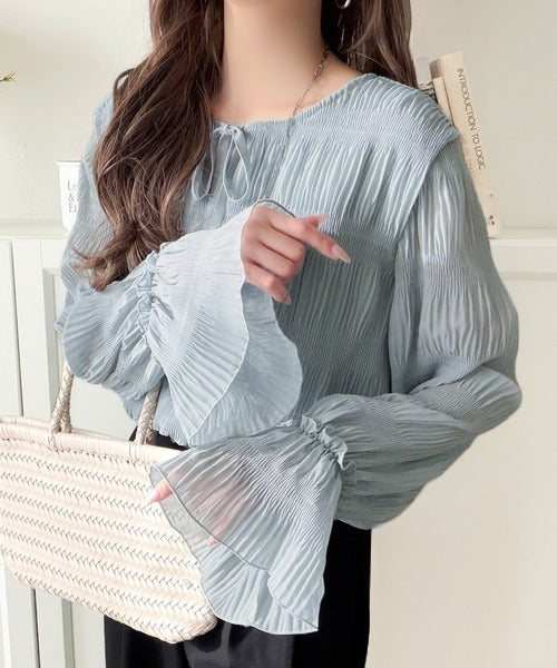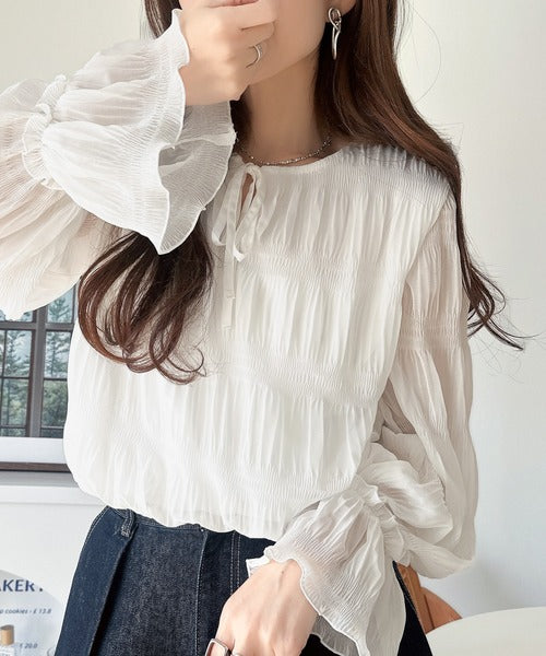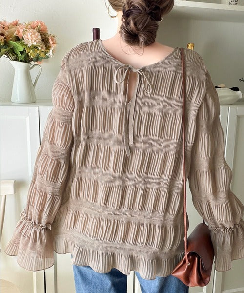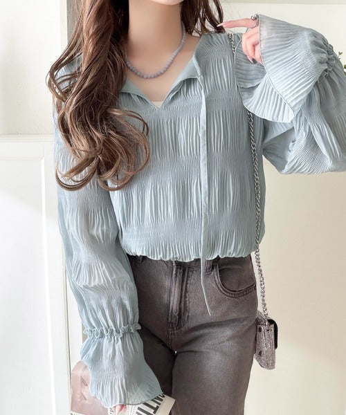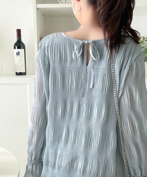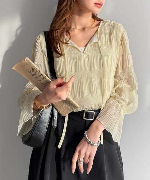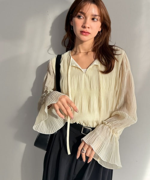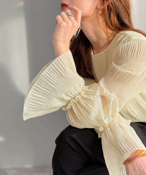 涼やかに、品よく、愛らしく。前後2wayリボンキャンディスリーブシアープリーツブラウス(長袖) ce1010538