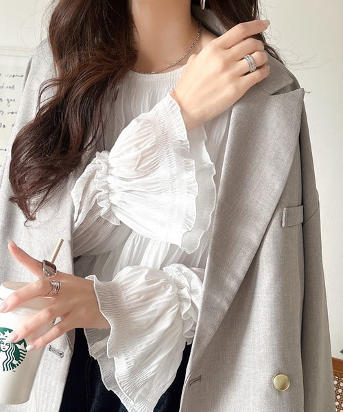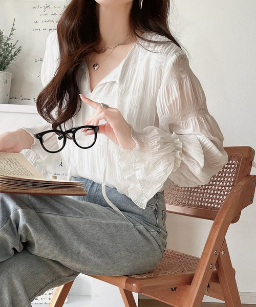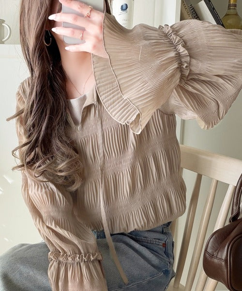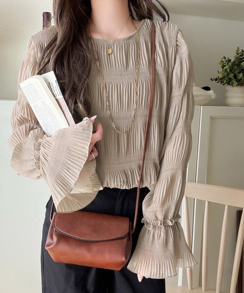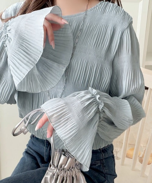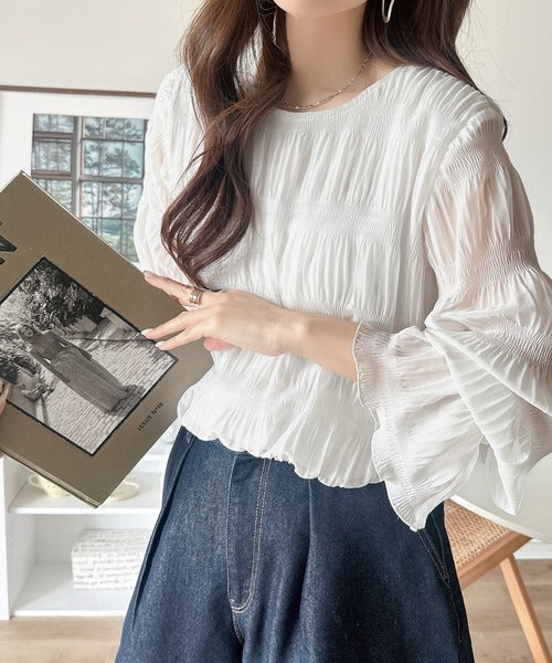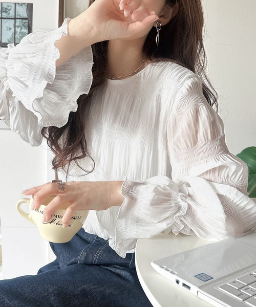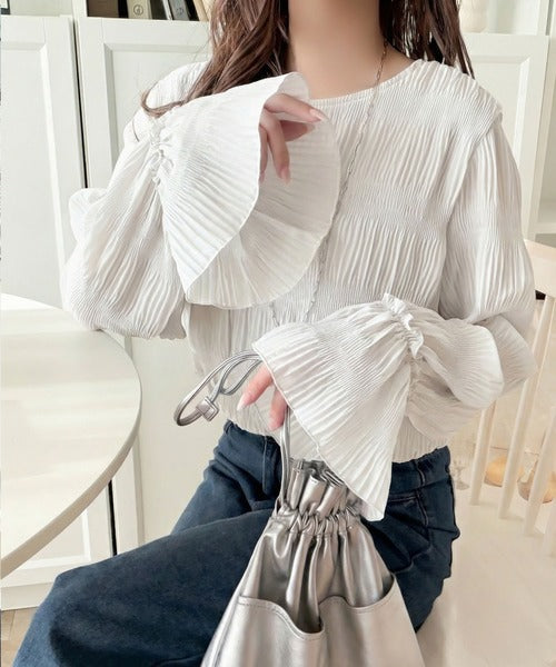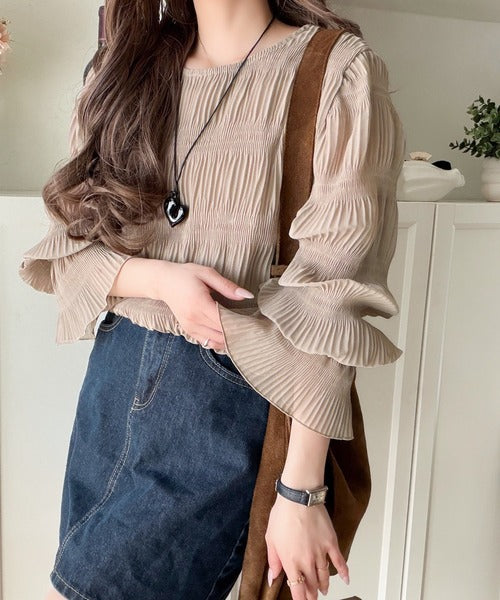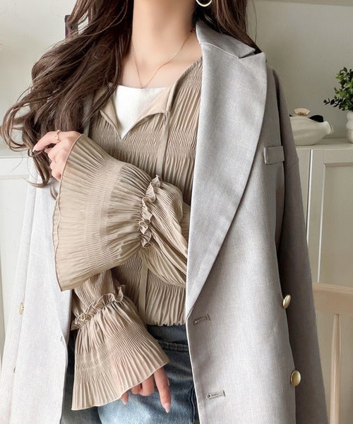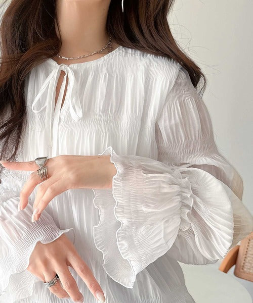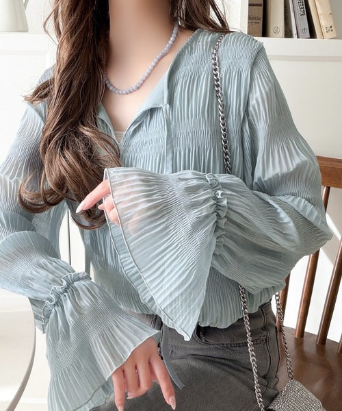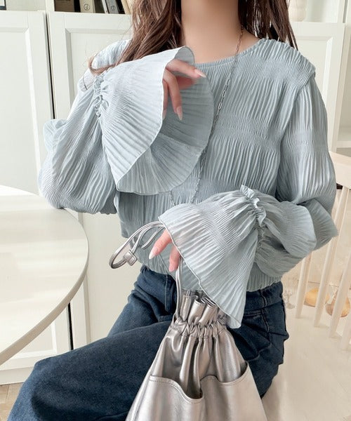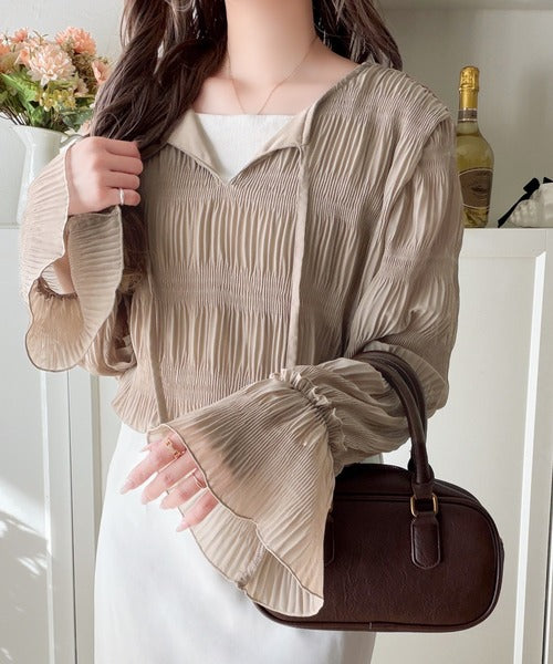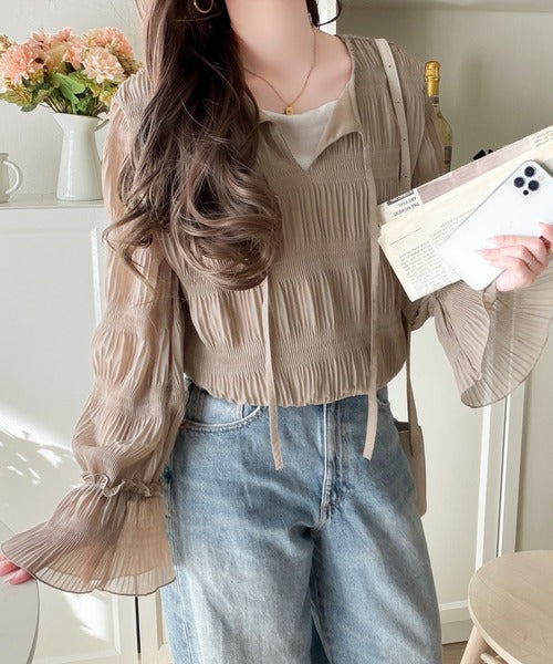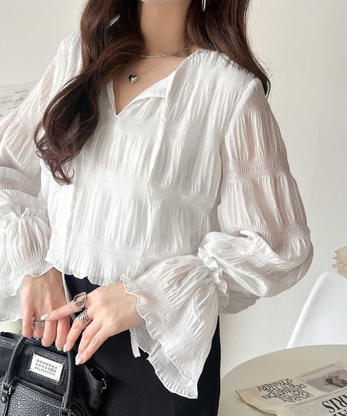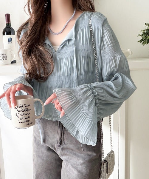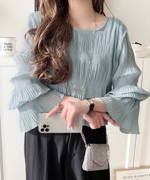涼やかに、品よく、愛らしく。前後2wayリボンキャンディスリーブシアープリーツブラウス(長袖) ce1010538