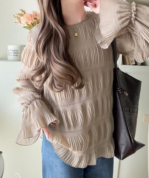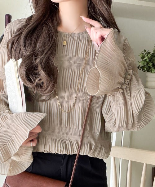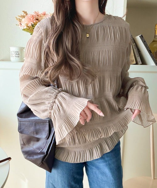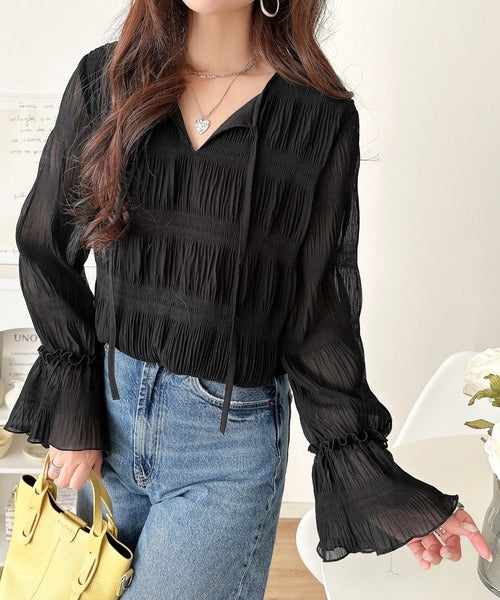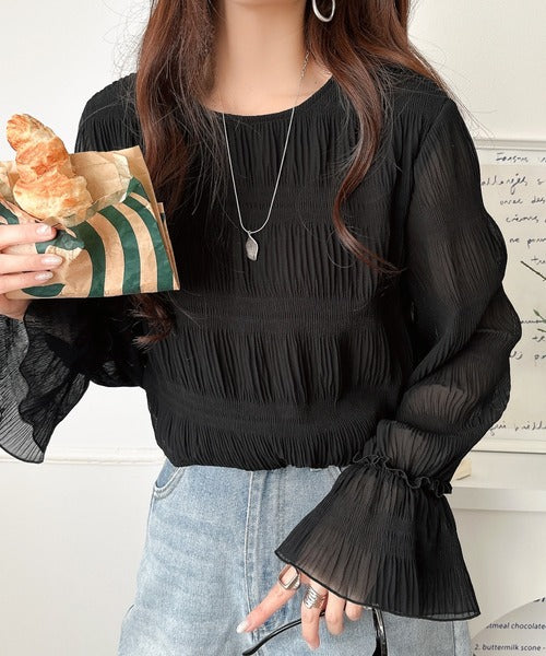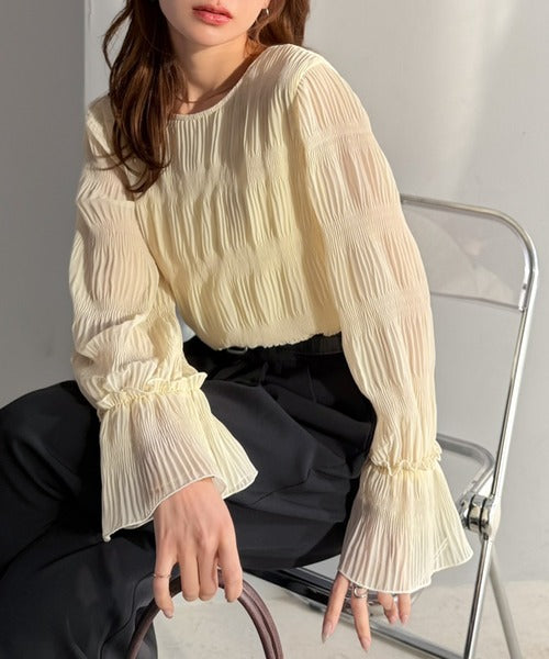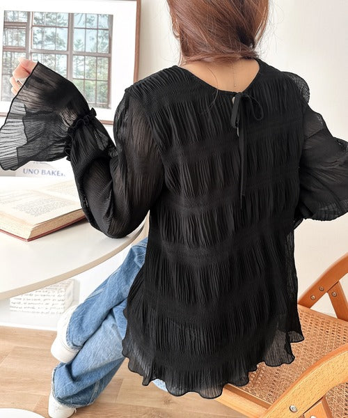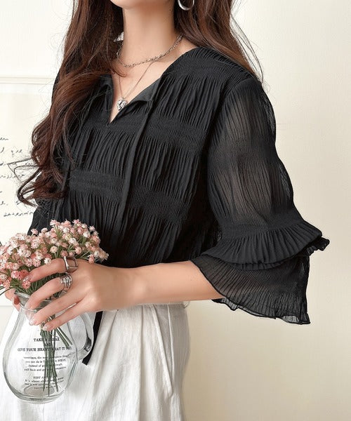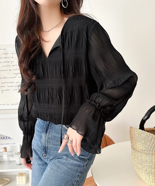 透け感あるシフォン素材に軽やかなプリーツを施した、上品なシアーブラウス♪