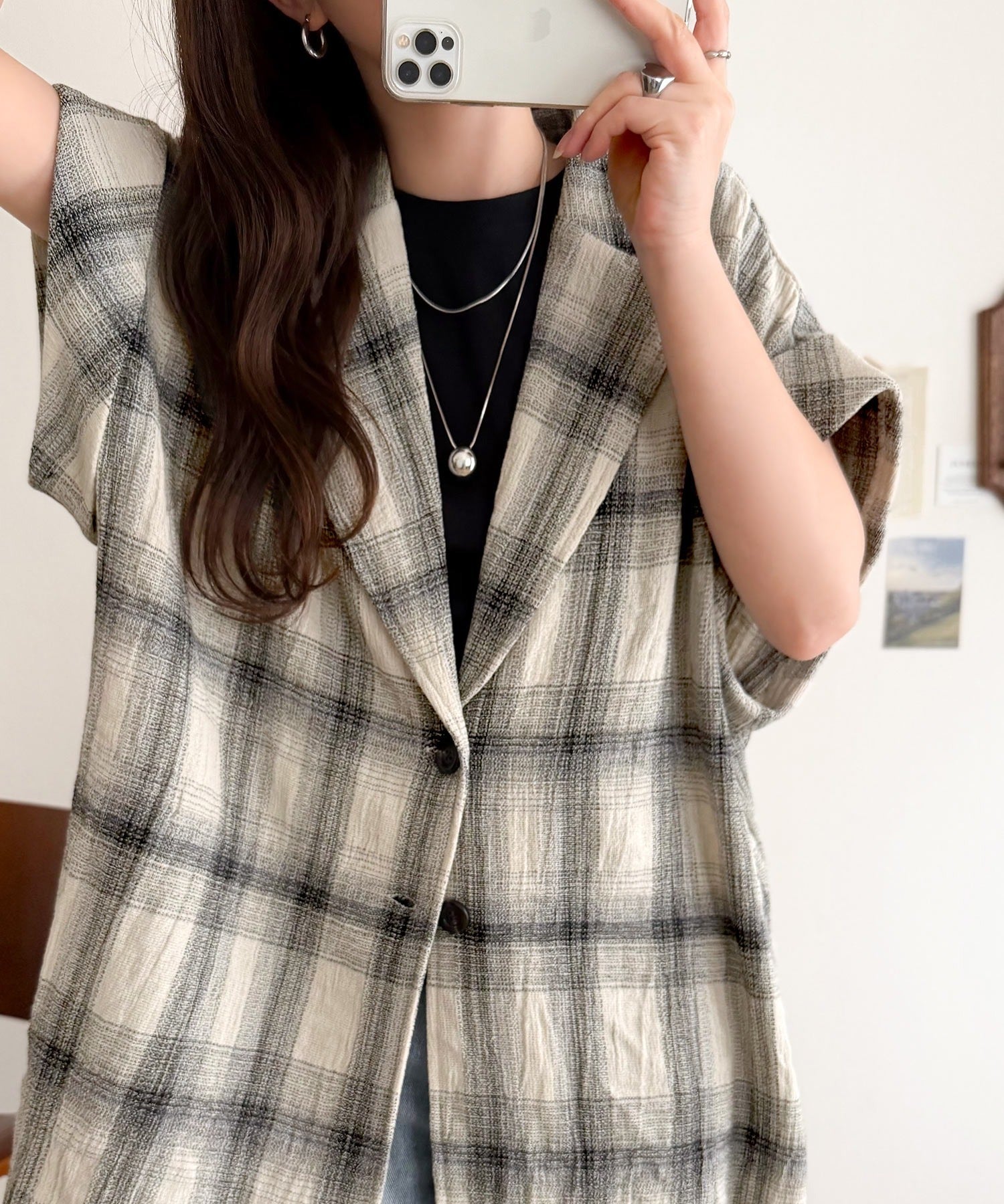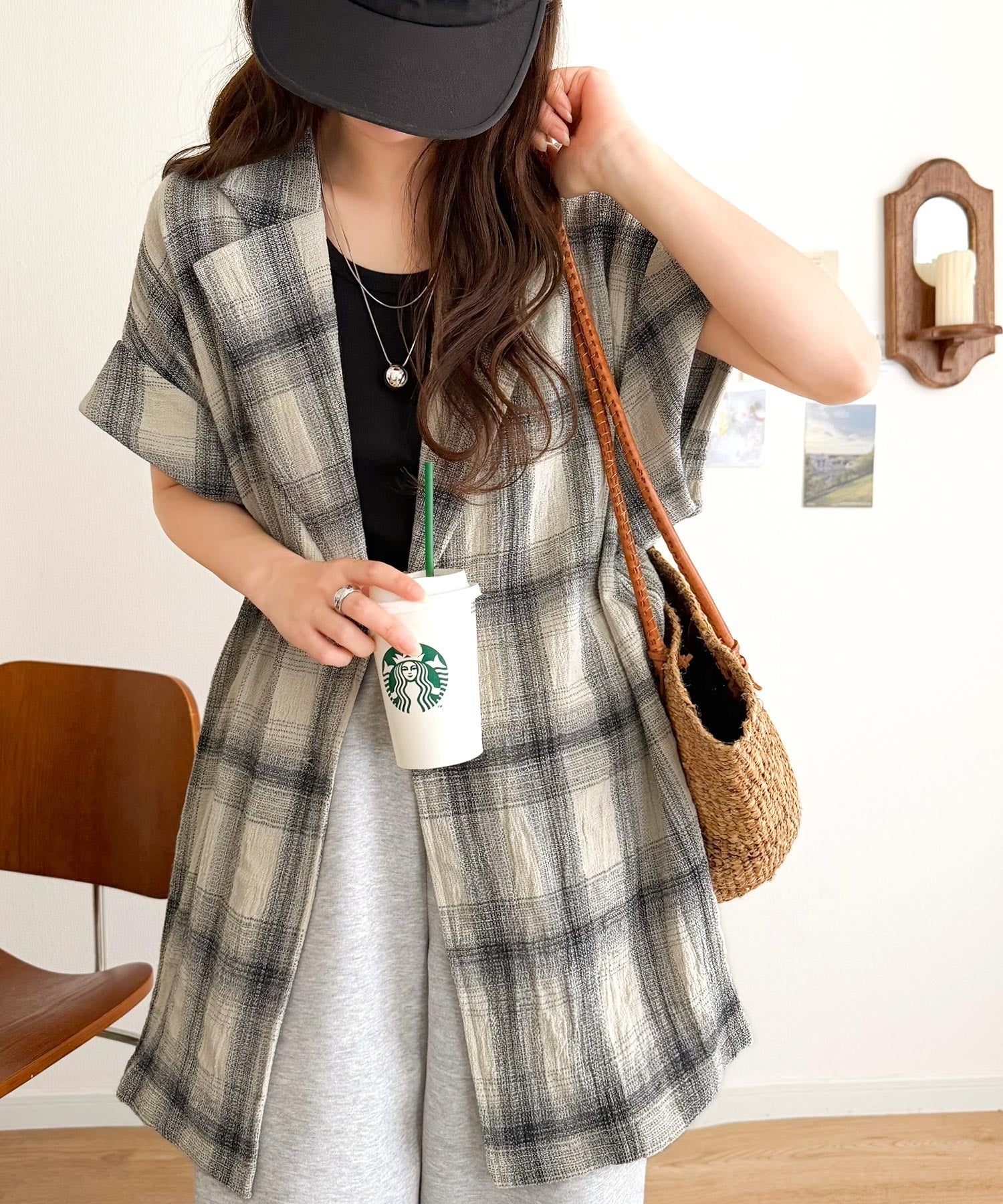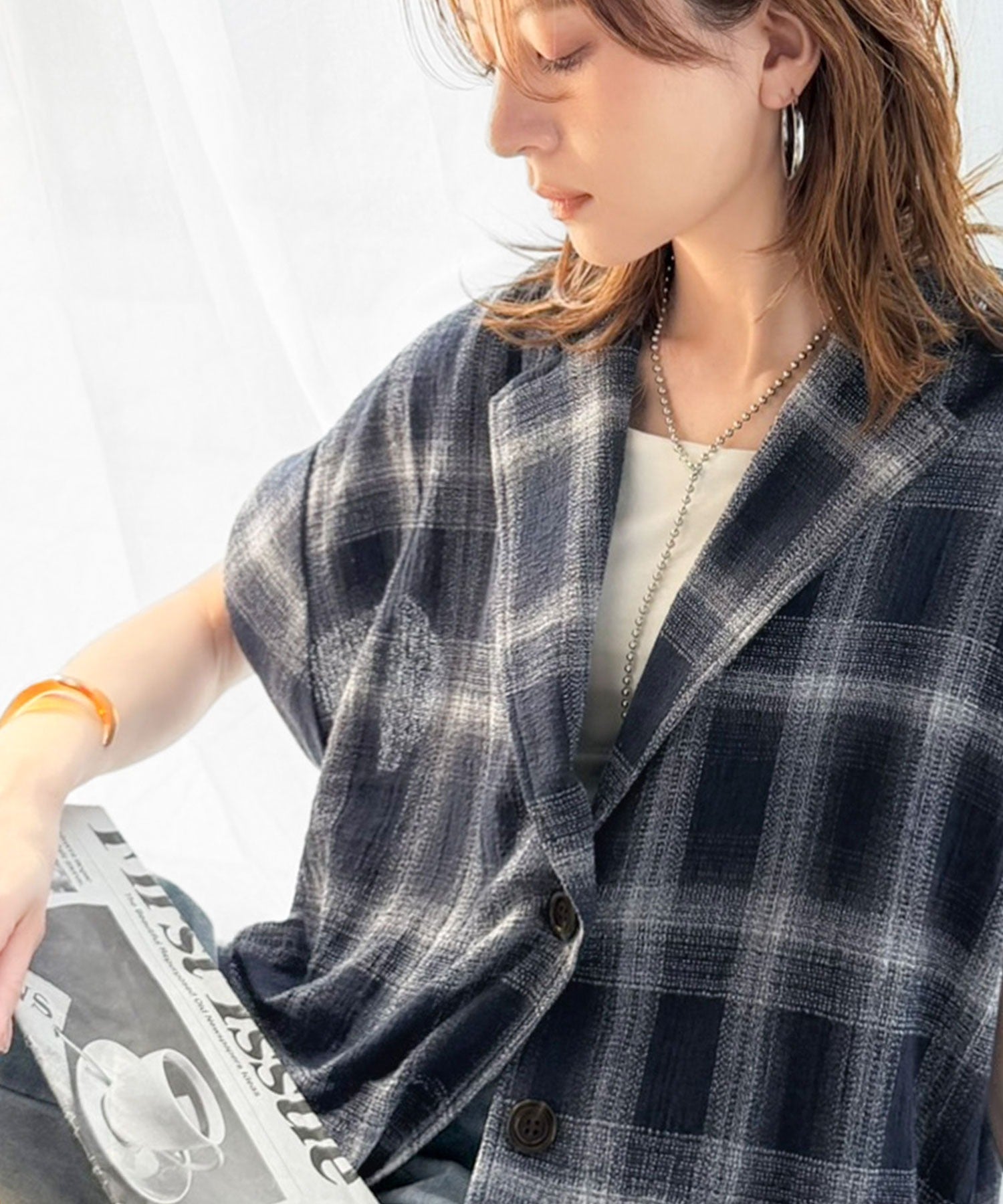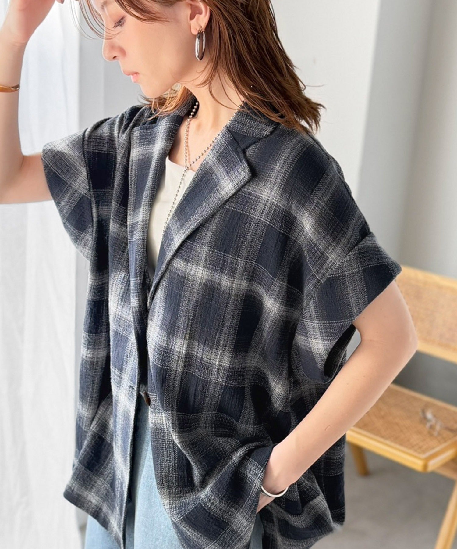軽やかに羽織れて大人カジュアル映え。パナマ風チェック半袖ジャケット ce1010592
