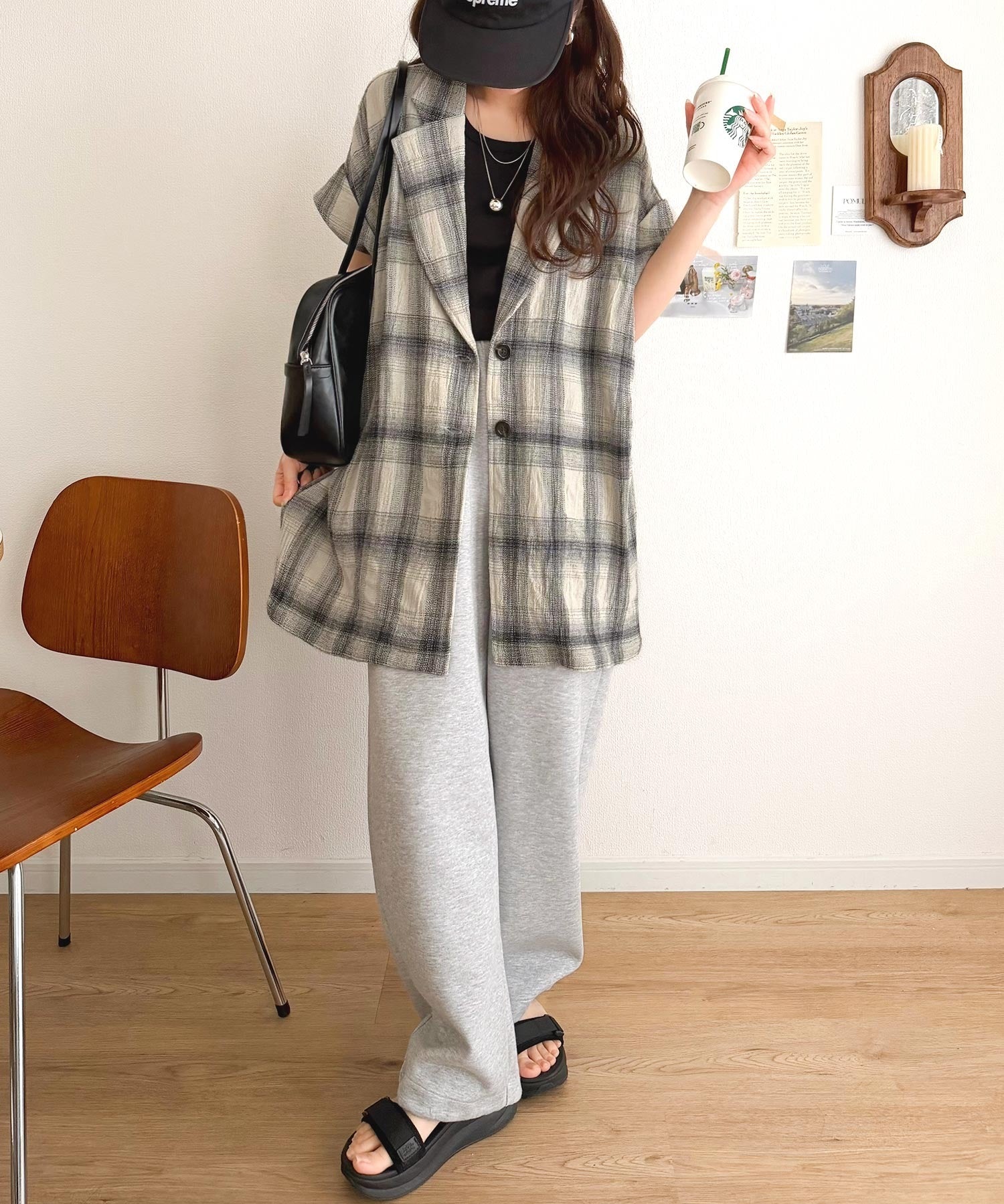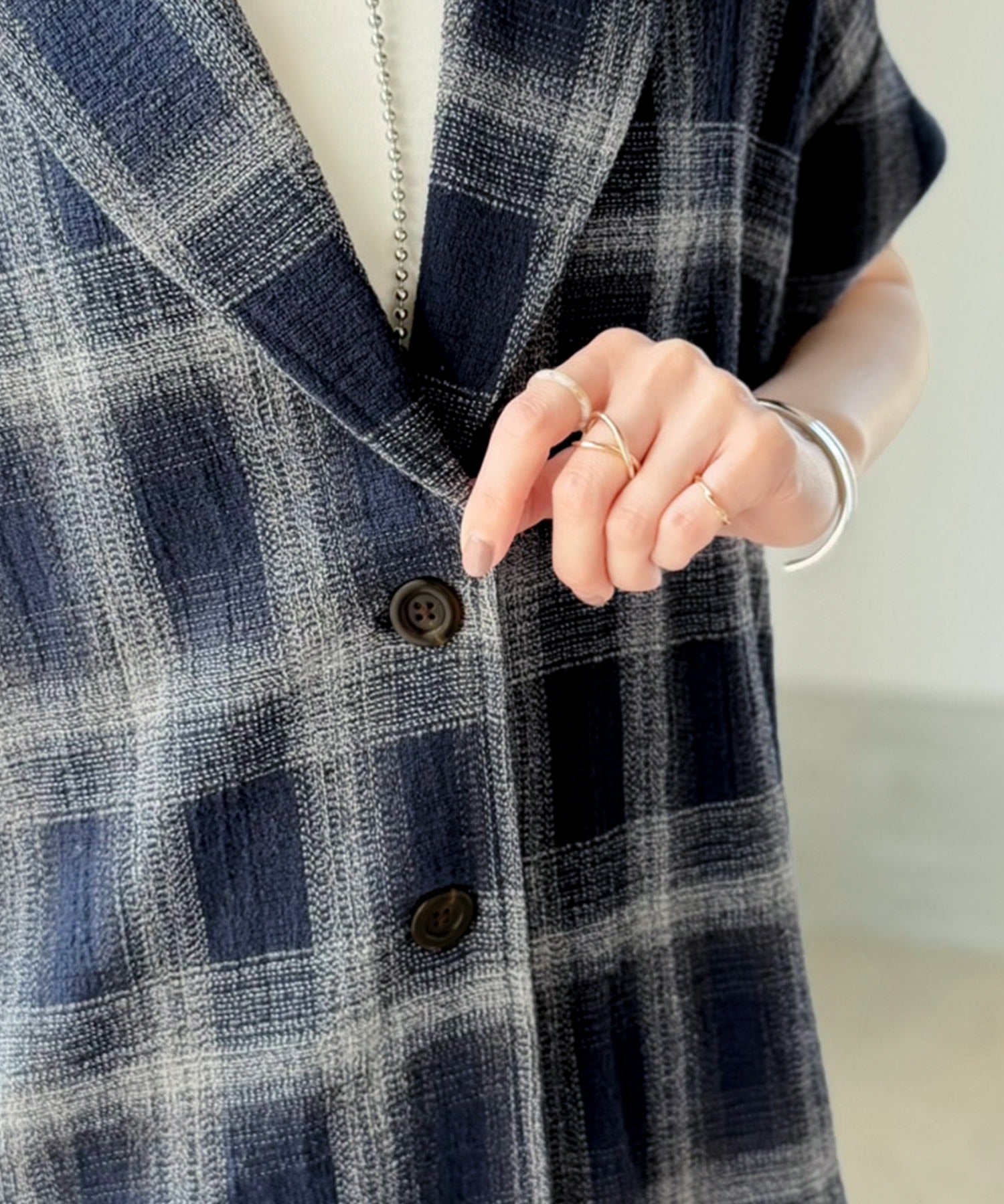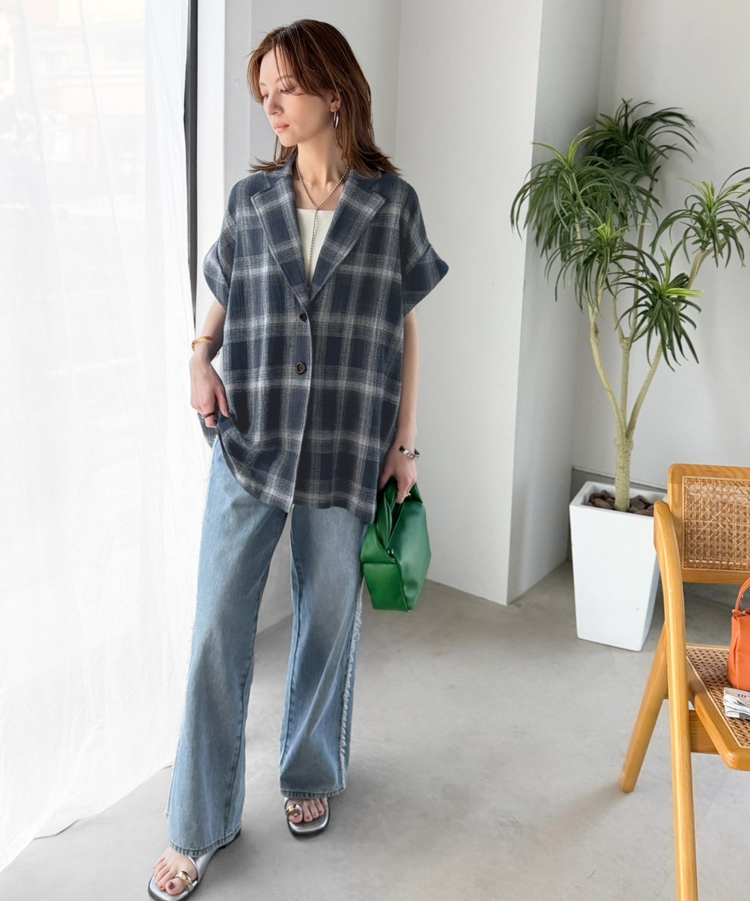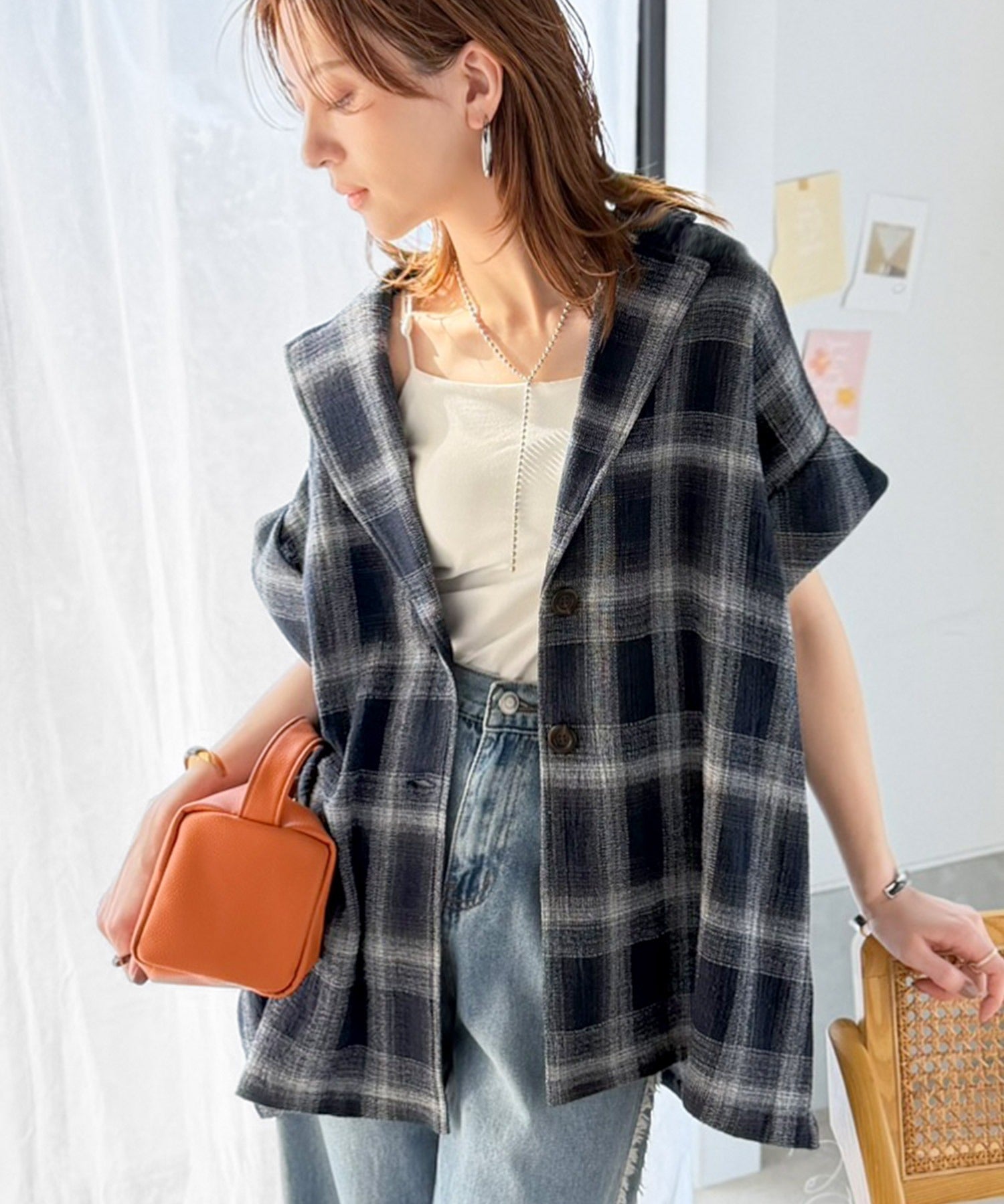 軽やかに羽織れて大人カジュアル映え。パナマ風チェック半袖ジャケット ce1010592