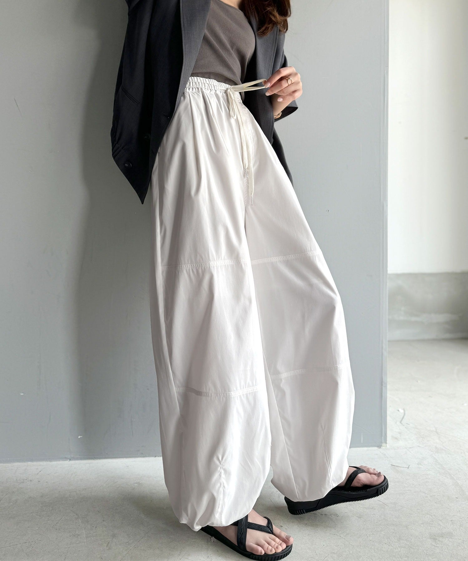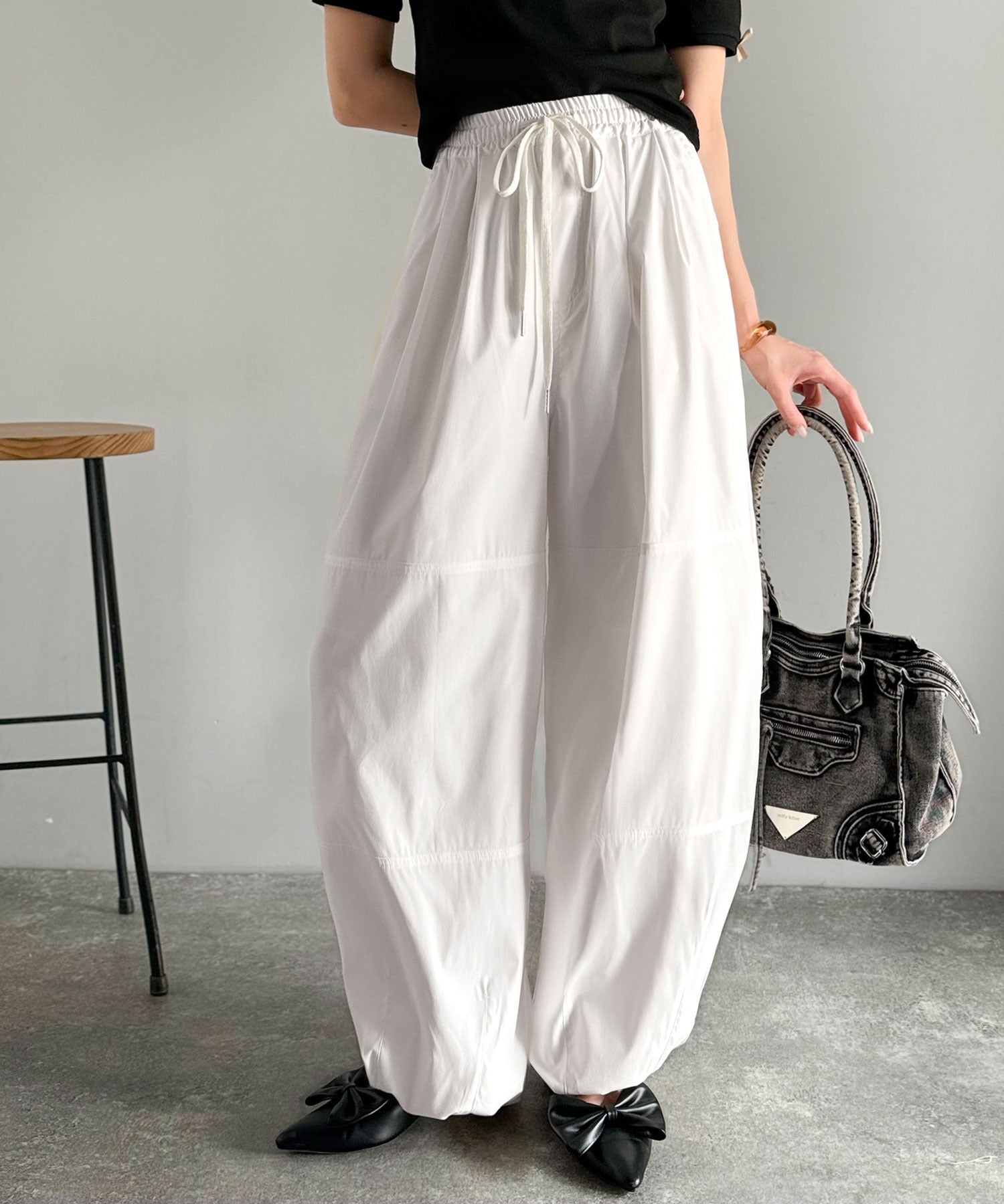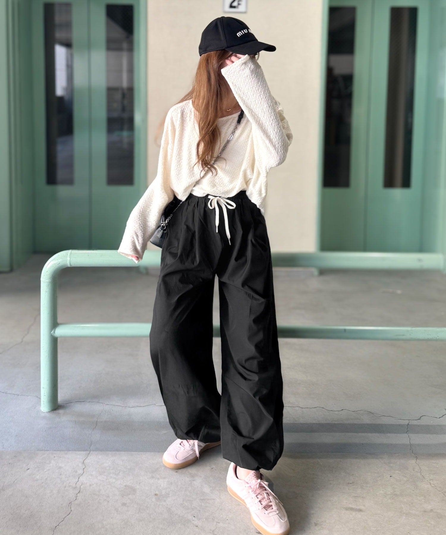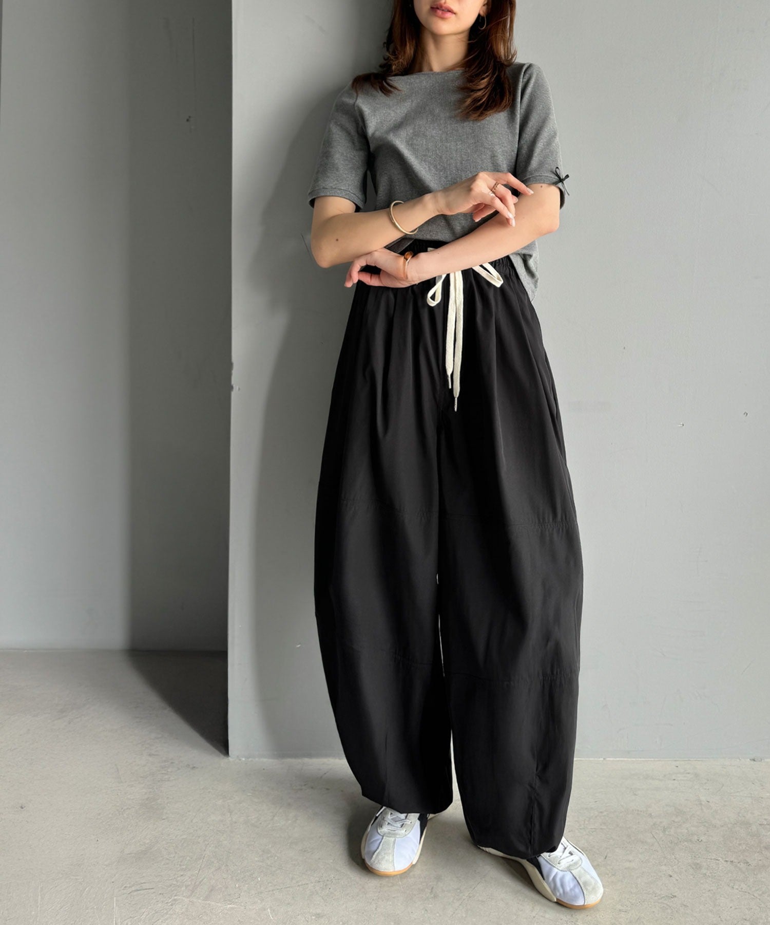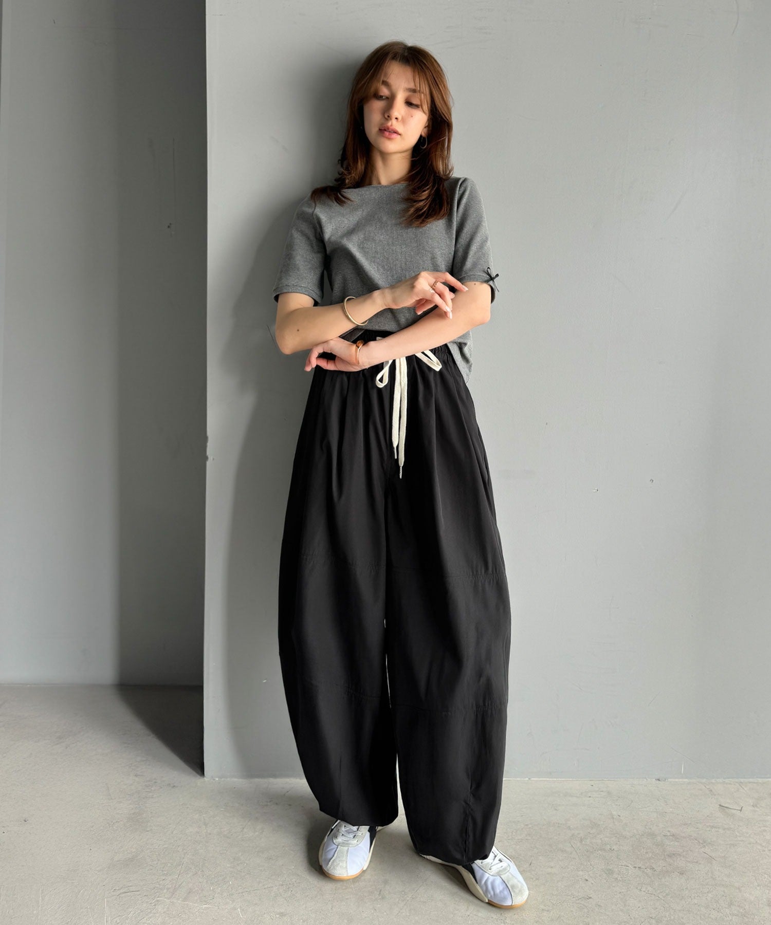 裾のドロスト部分を絞ってボリューム感を調節して履けるのもポイントです。