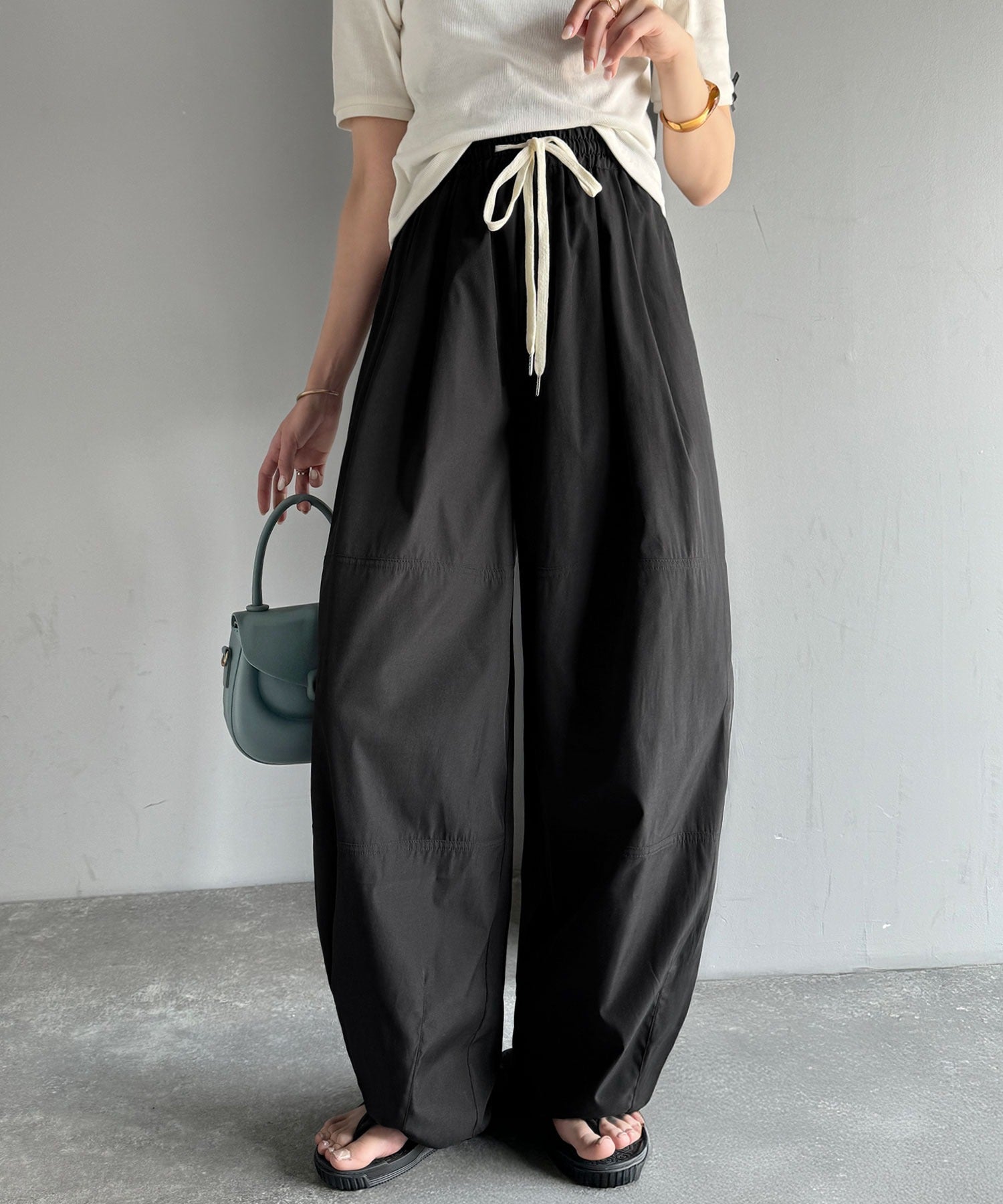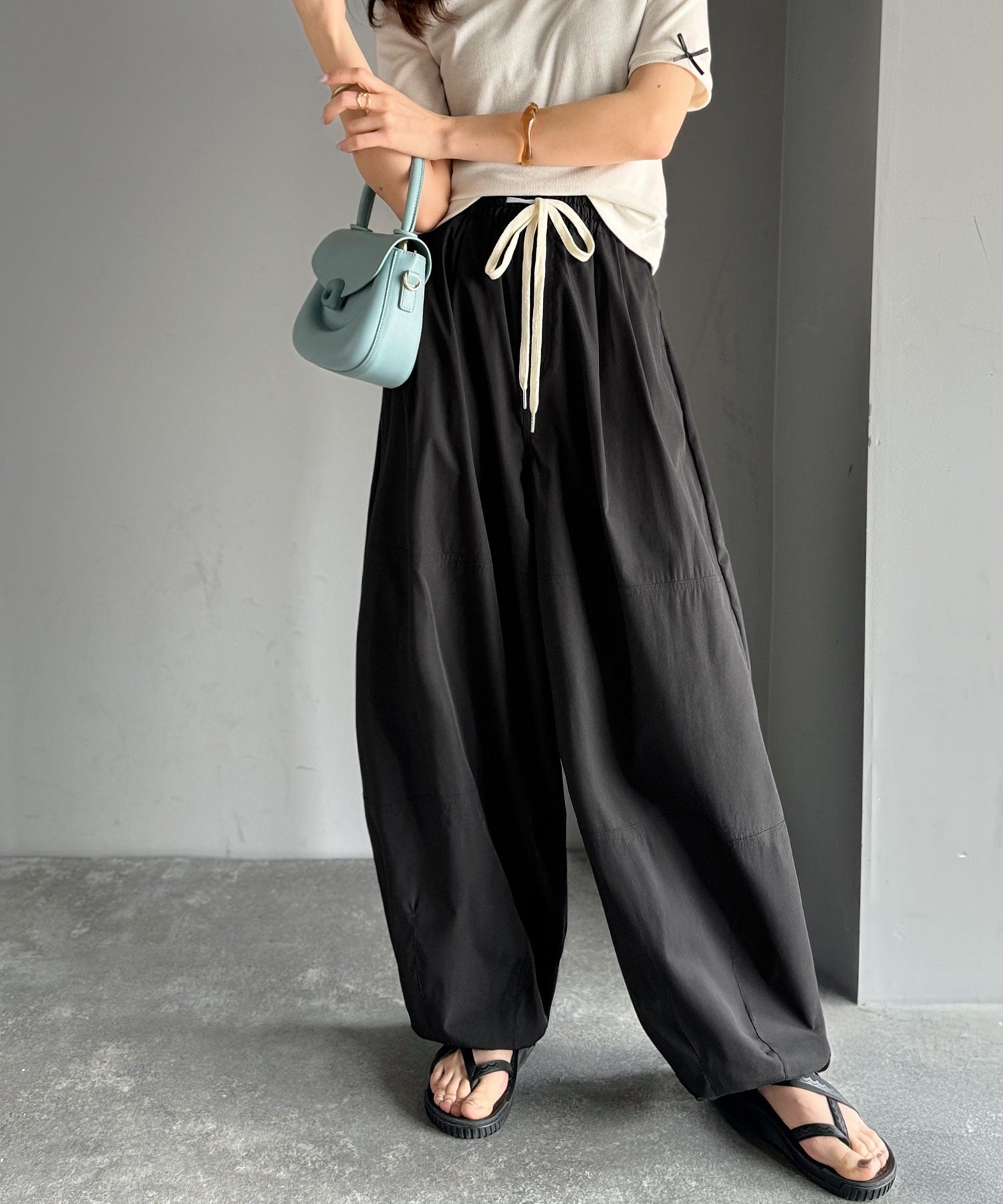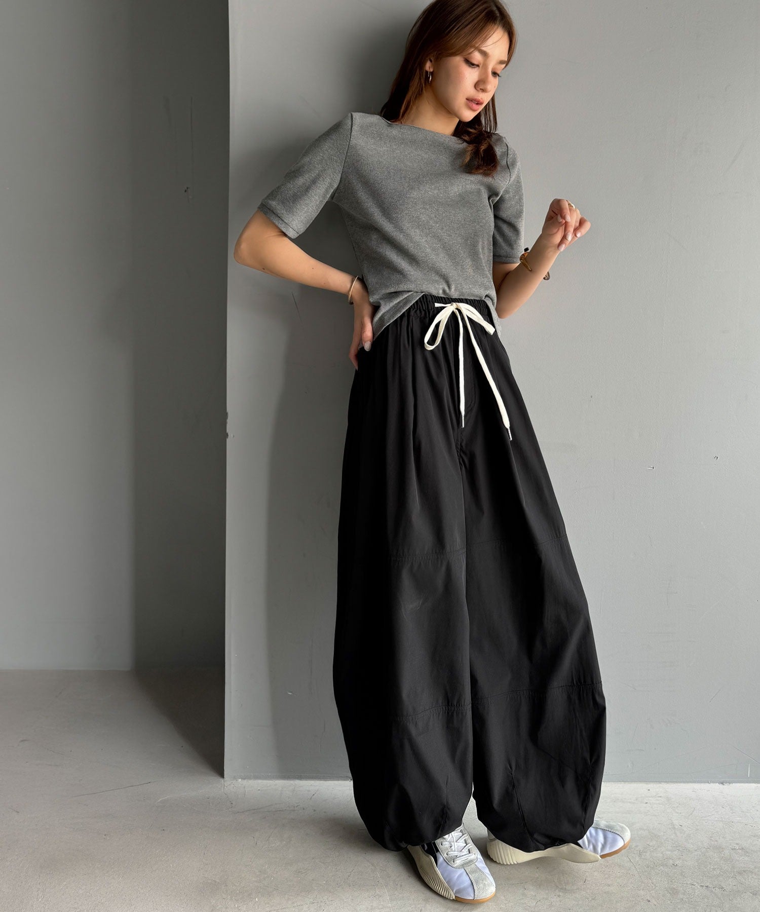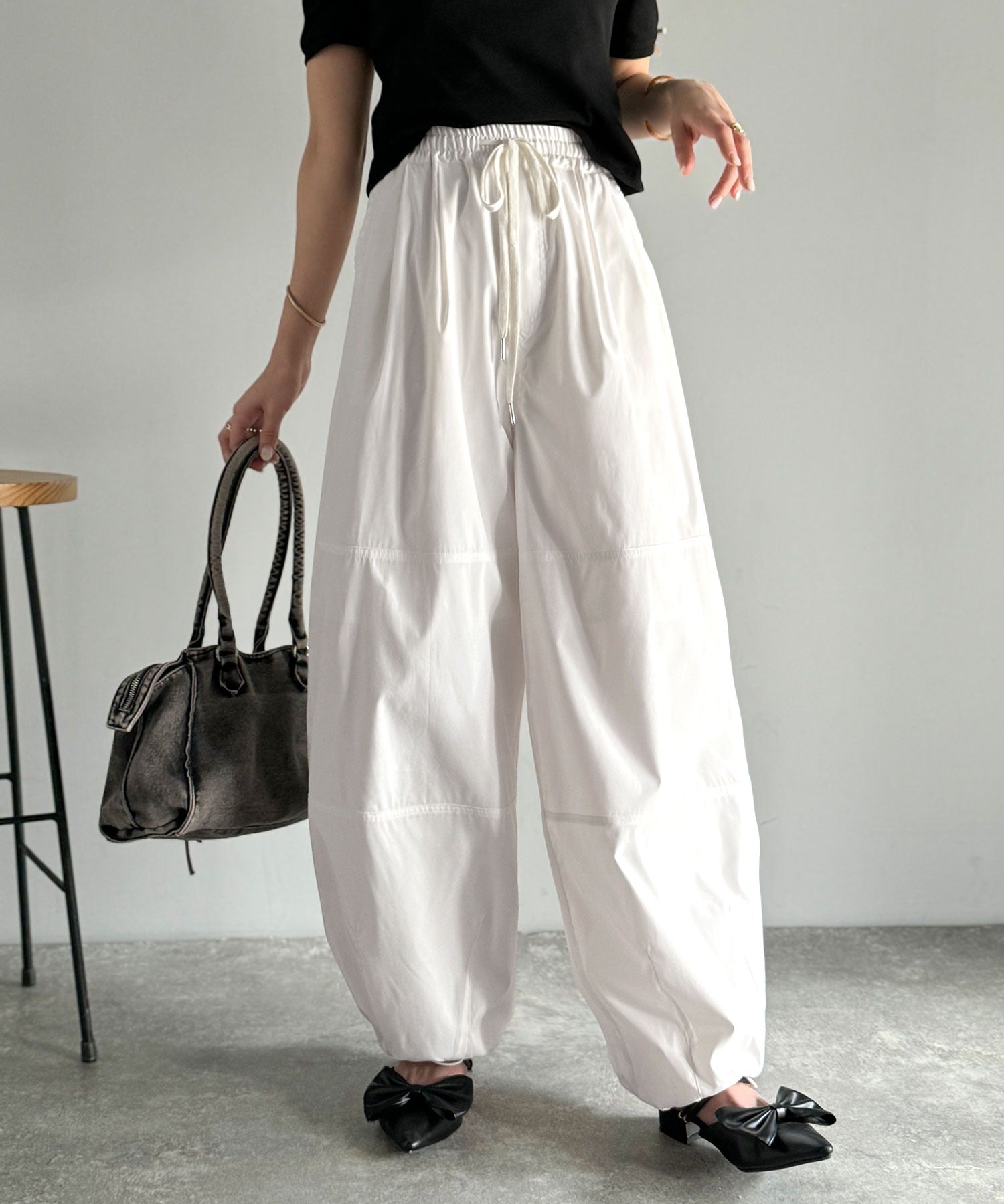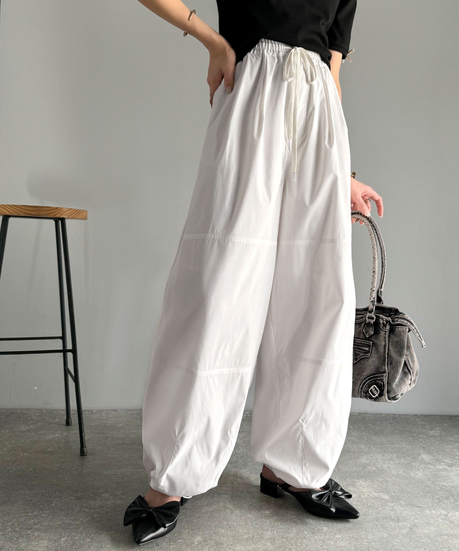 裾のドロスト部分を絞ってボリューム感を調節して履けるのもポイントです。