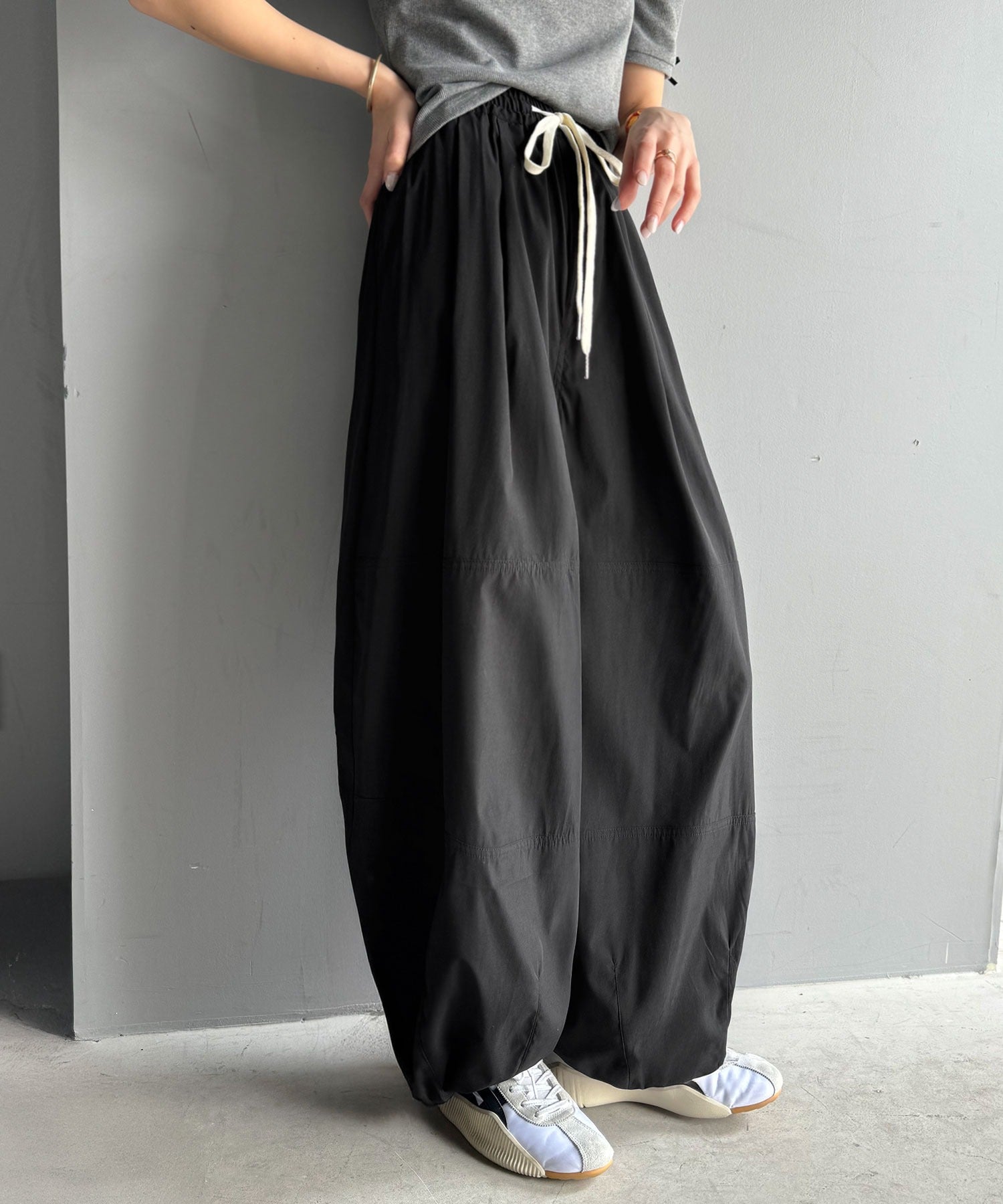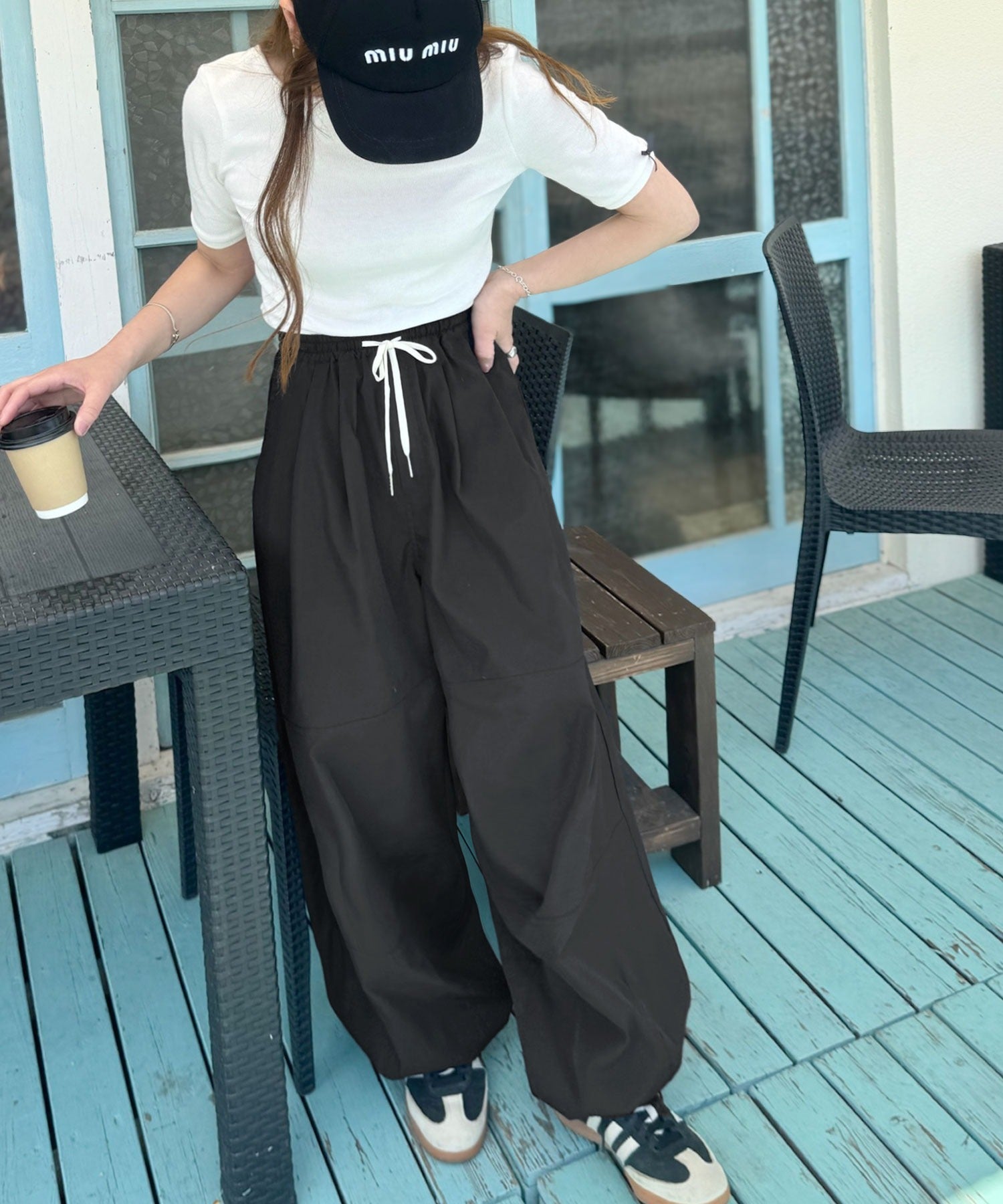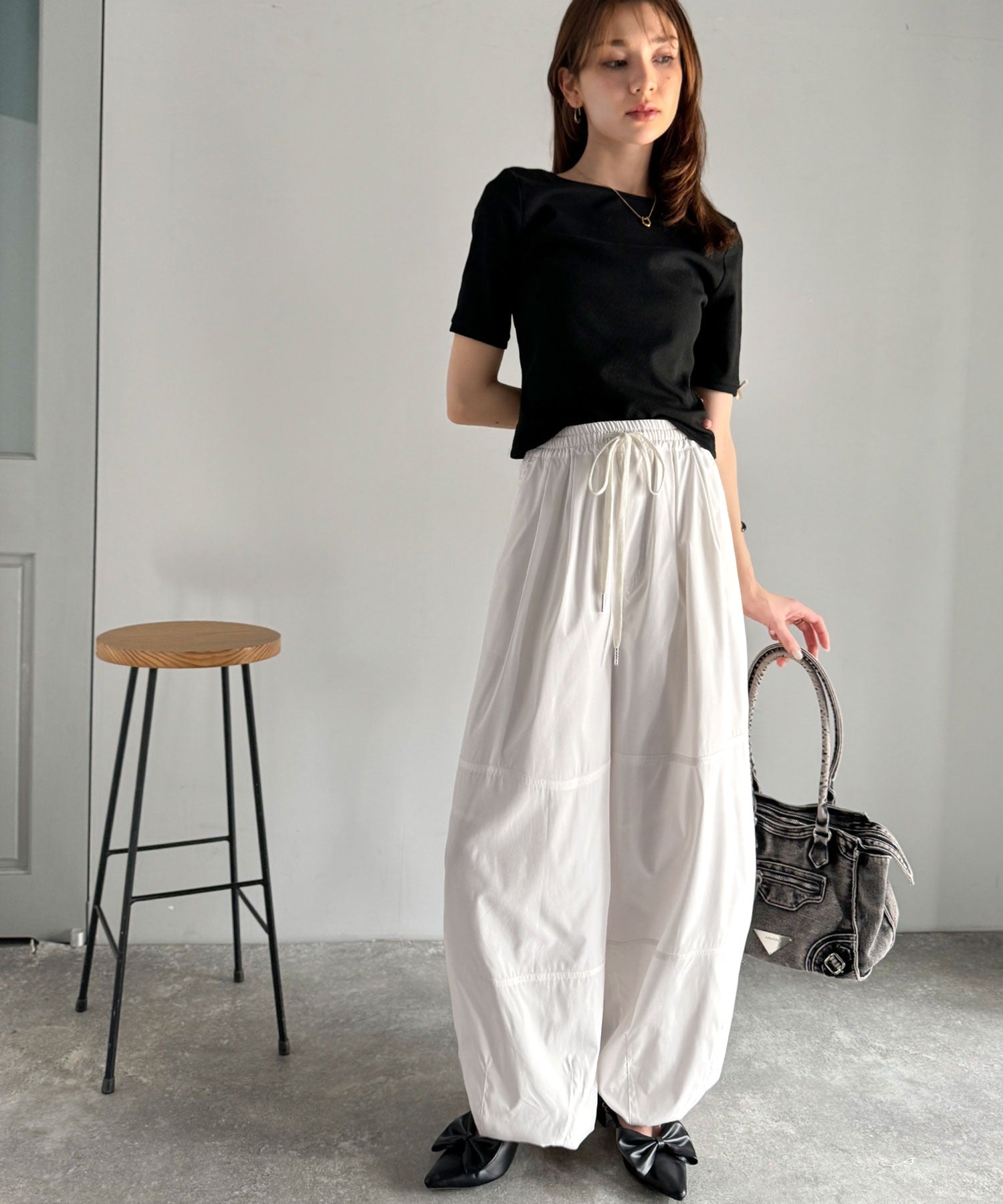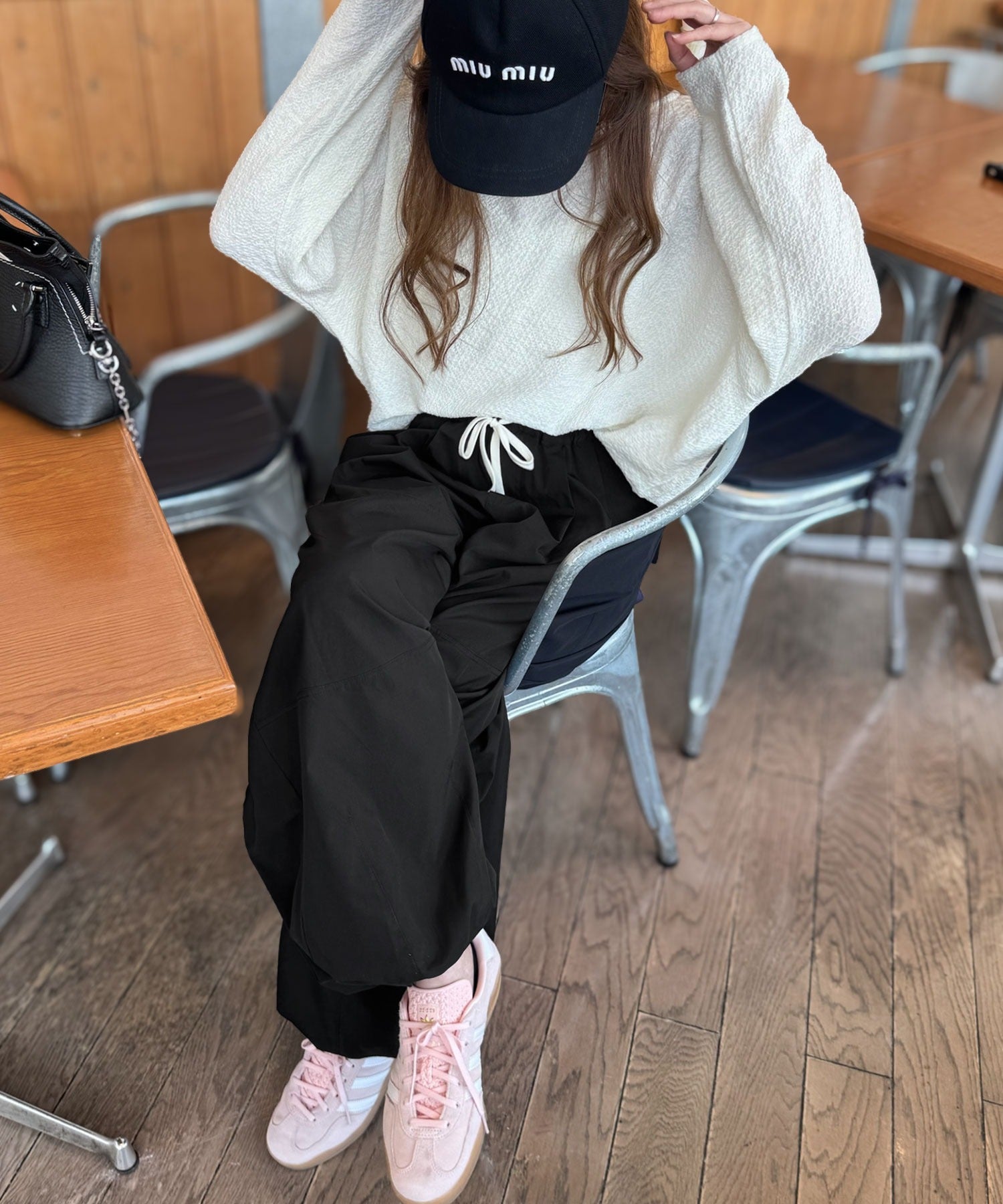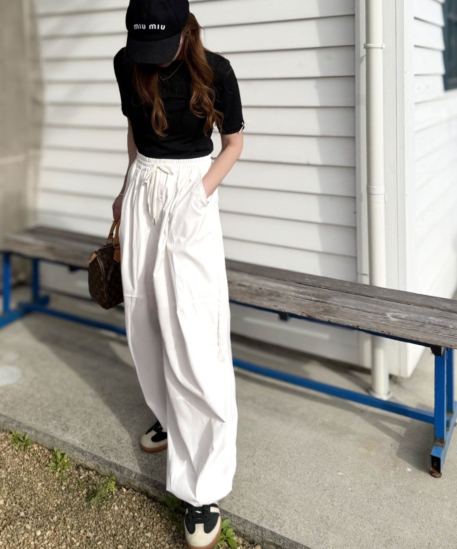 裾のドロスト部分を絞ってボリューム感を調節して履けるのもポイントです。