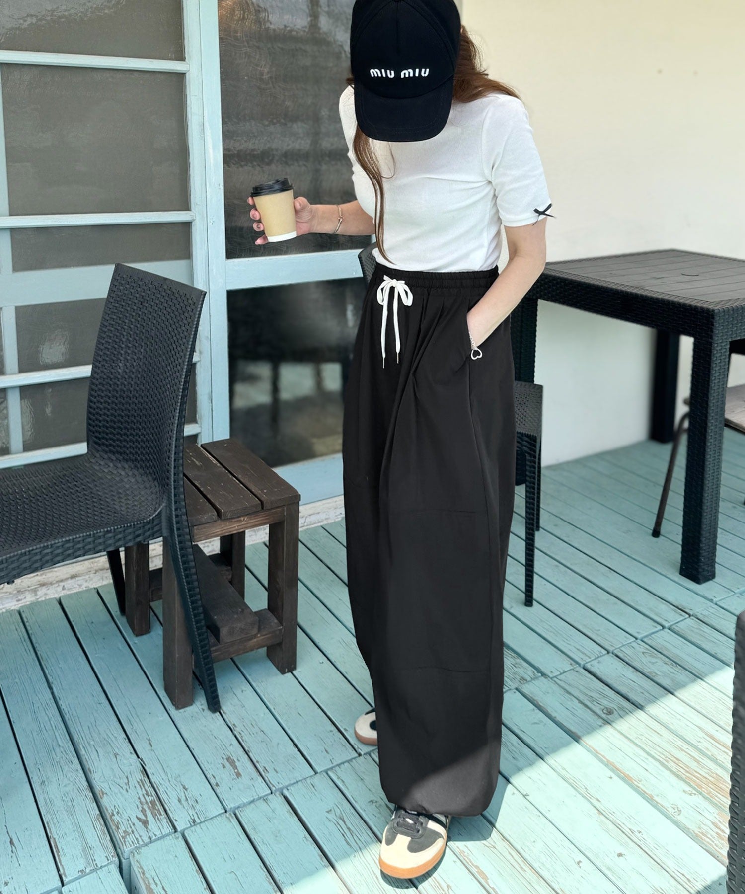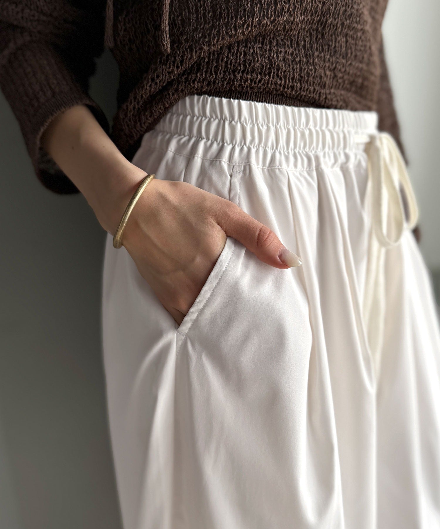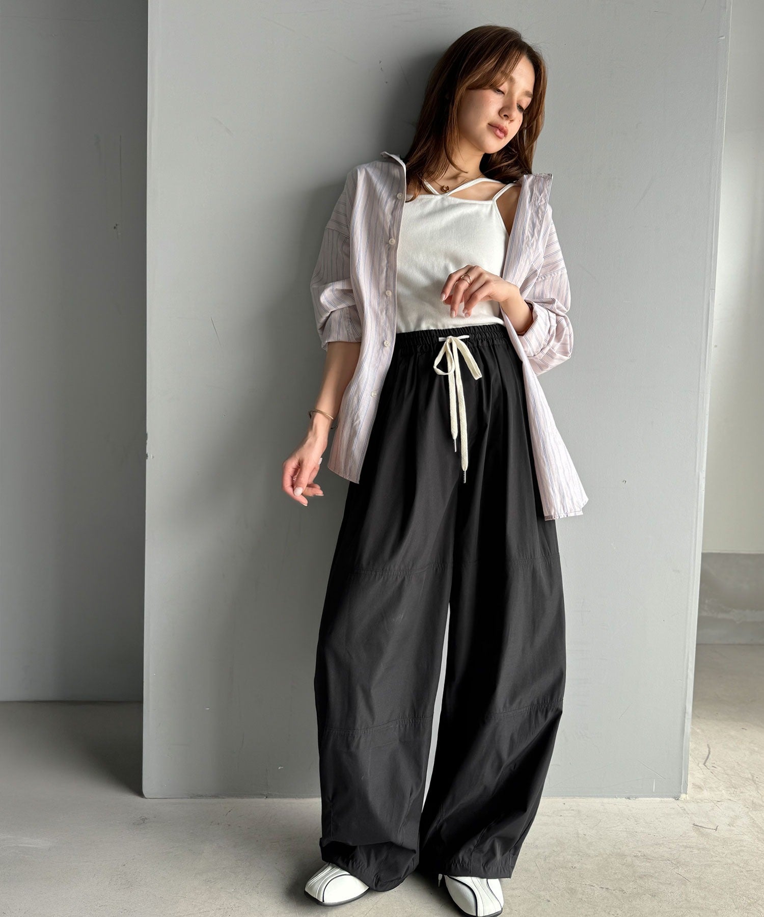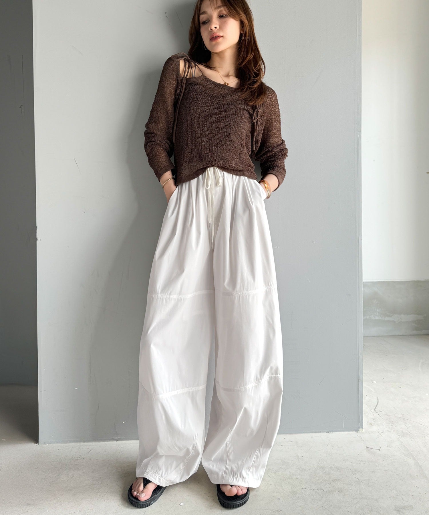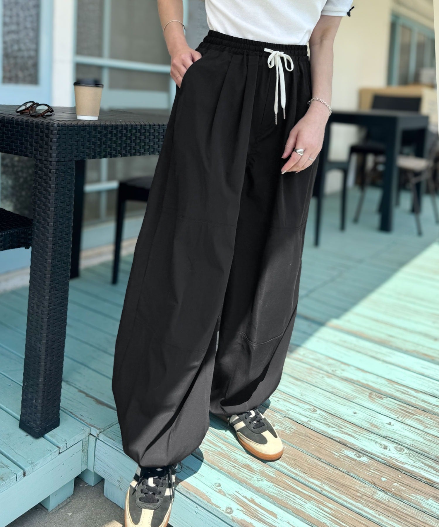 裾のドロスト部分を絞ってボリューム感を調節して履けるのもポイントです。