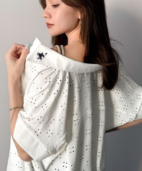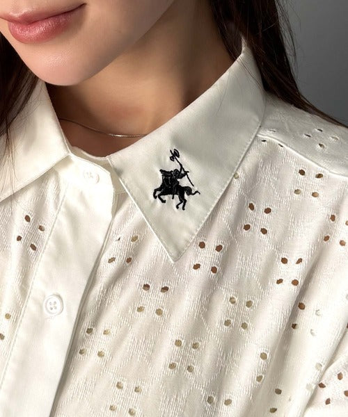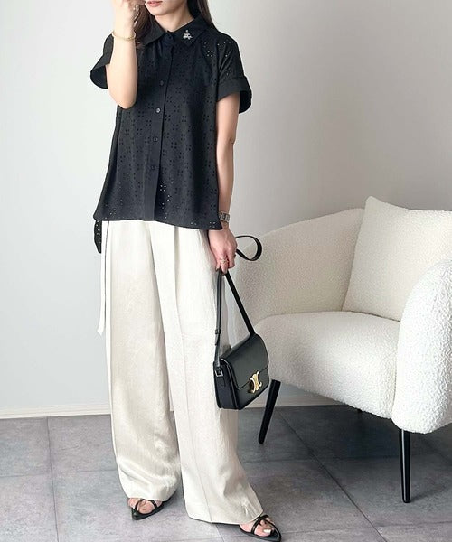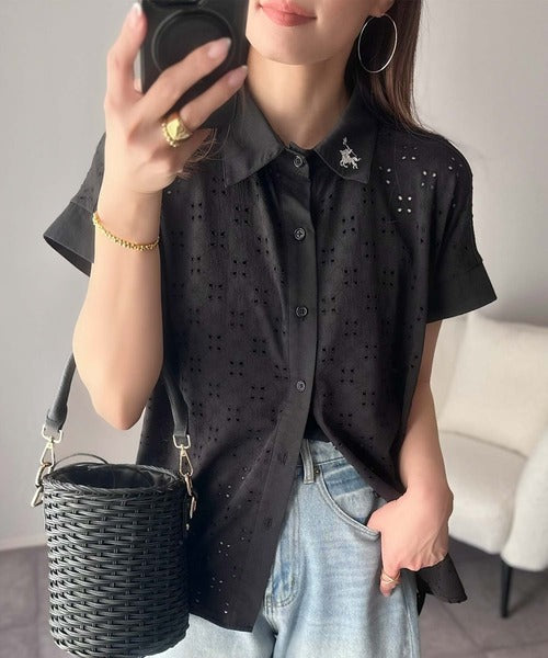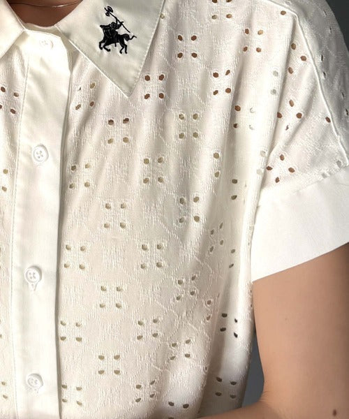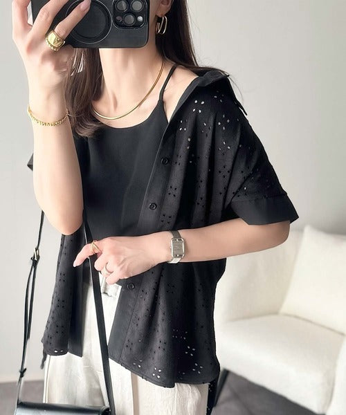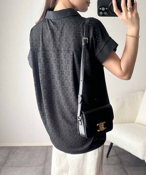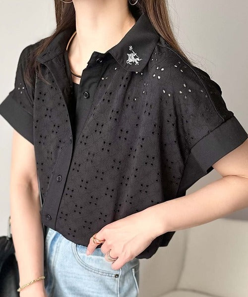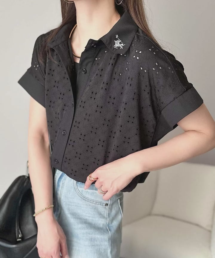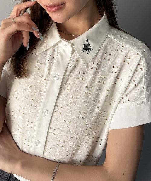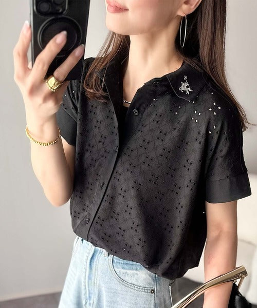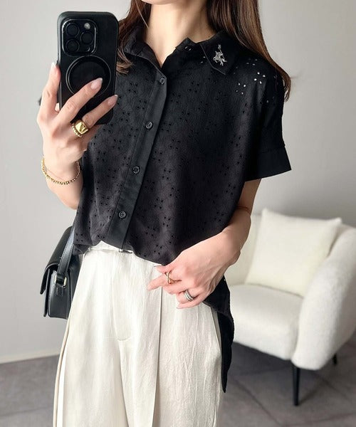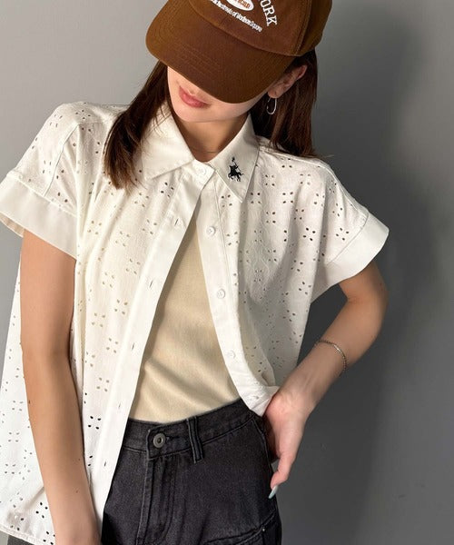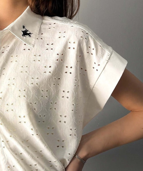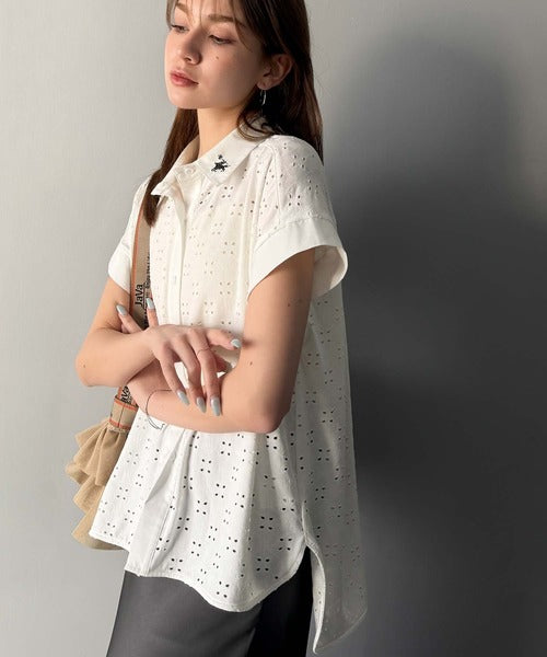 さっと羽織ってきれいめカジュアル。ワンポイント刺繍アイレット柄レースフレンチスリーブシャツ ce1020220