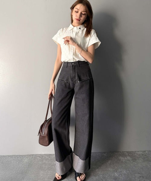 アイレットレースがフェミニンなフレンチスリーブシャツ。