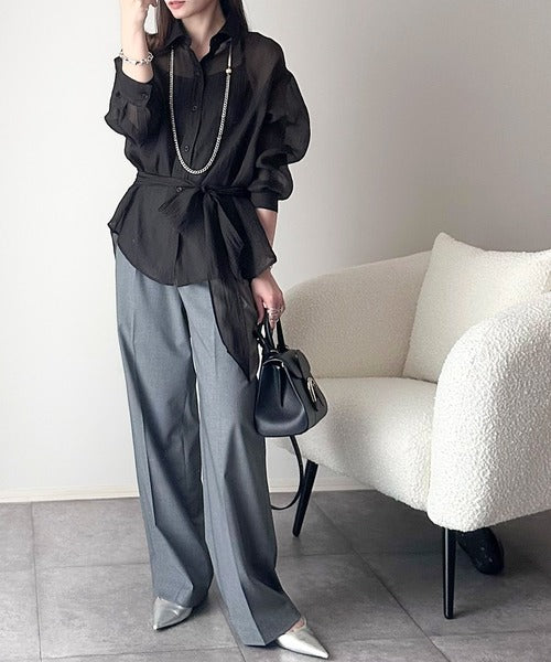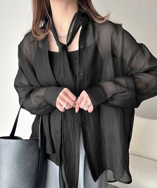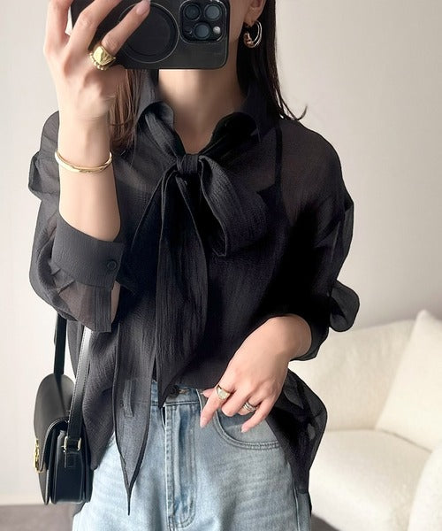 このリボンタイ付きシアーシャツは、まさに春夏を彩る一枚。
