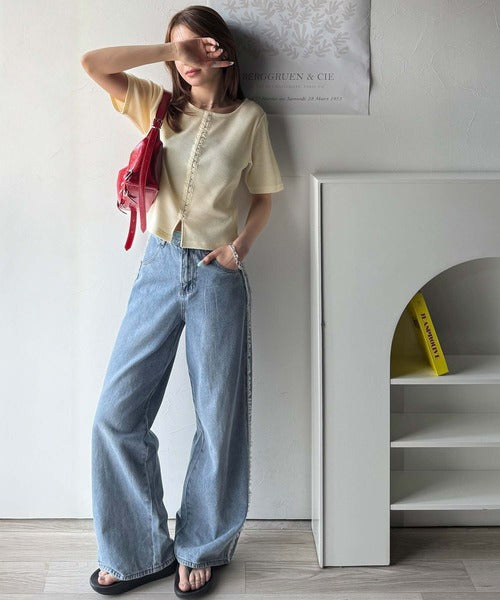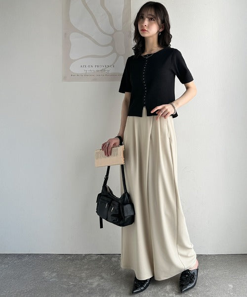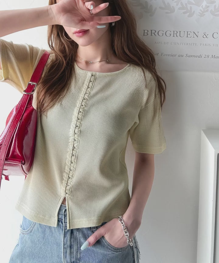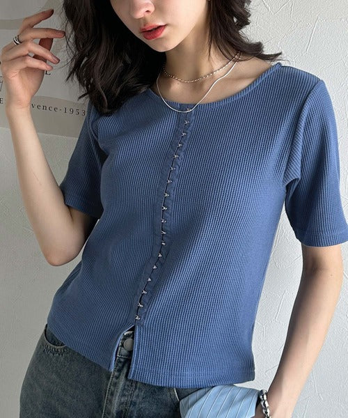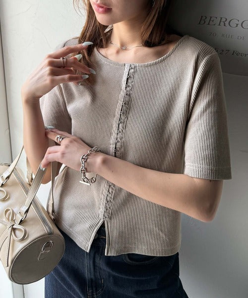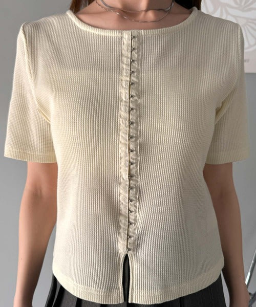 大人可愛いデコルテ魅せコンパクトT。フロントホックワッフル半袖トップス ce1020238
