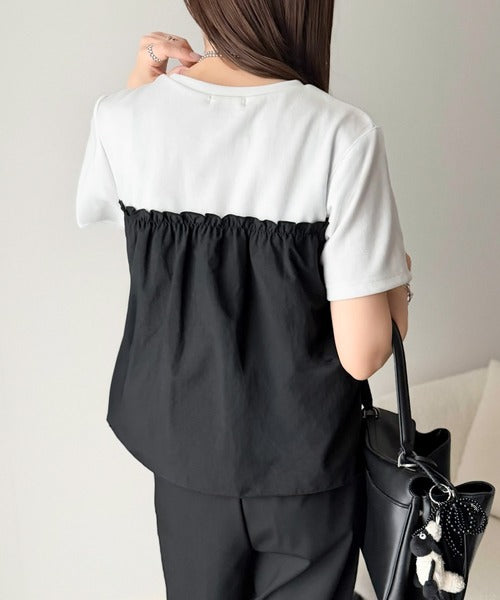 肌当たりの良いカットソー生地と、ハリのある布帛生地を使用。